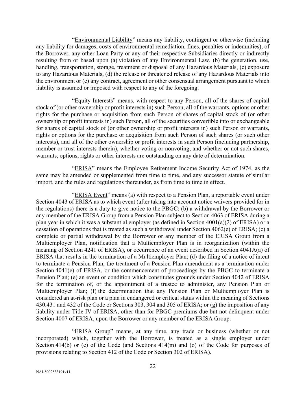 NAI-5002533191v11 22 “Environmental Liability” means any liability, contingent or otherwise (including any liability for damages, costs of environmental remediation, fines, penalties or indemnities), of the Borrower, any other Loan Party or any of their respective Subsidiaries directly or indirectly resulting from or based upon (a) violation of any Environmental Law, (b) the generation, use, handling, transportation, storage, treatment or disposal of any Hazardous Materials, (c) exposure to any Hazardous Materials, (d) the release or threatened release of any Hazardous Materials into the environment or (e) any contract, agreement or other consensual arrangement pursuant to which liability is assumed or imposed with respect to any of the foregoing. “Equity Interests” means, with respect to any Person, all of the shares of capital stock of (or other ownership or profit interests in) such Person, all of the warrants, options or other rights for the purchase or acquisition from such Person of shares of capital stock of (or other ownership or profit interests in) such Person, all of the securities convertible into or exchangeable for shares of capital stock of (or other ownership or profit interests in) such Person or warrants, rights or options for the purchase or acquisition from such Person of such shares (or such other interests), and all of the other ownership or profit interests in such Person (including partnership, member or trust interests therein), whether voting or nonvoting, and whether or not such shares, warrants, options, rights or other interests are outstanding on any date of determination. “ERISA” means the Employee Retirement Income Security Act of 1974, as the same may be amended or supplemented from time to time, and any successor statute of similar import, and the rules and regulations thereunder, as from time to time in effect. “ERISA Event” means (a) with respect to a Pension Plan, a reportable event under Section 4043 of ERISA as to which event (after taking into account notice waivers provided for in the regulations) there is a duty to give notice to the PBGC; (b) a withdrawal by the Borrower or any member of the ERISA Group from a Pension Plan subject to Section 4063 of ERISA during a plan year in which it was a substantial employer (as defined in Section 4001(a)(2) of ERISA) or a cessation of operations that is treated as such a withdrawal under Section 4062(e) of ERISA; (c) a complete or partial withdrawal by the Borrower or any member of the ERISA Group from a Multiemployer Plan, notification that a Multiemployer Plan is in reorganization (within the meaning of Section 4241 of ERISA), or occurrence of an event described in Section 4041A(a) of ERISA that results in the termination of a Multiemployer Plan; (d) the filing of a notice of intent to terminate a Pension Plan, the treatment of a Pension Plan amendment as a termination under Section 4041(e) of ERISA, or the commencement of proceedings by the PBGC to terminate a Pension Plan; (e) an event or condition which constitutes grounds under Section 4042 of ERISA for the termination of, or the appointment of a trustee to administer, any Pension Plan or Multiemployer Plan; (f) the determination that any Pension Plan or Multiemployer Plan is considered an at-risk plan or a plan in endangered or critical status within the meaning of Sections 430.431 and 432 of the Code or Sections 303, 304 and 305 of ERISA; or (g) the imposition of any liability under Title IV of ERISA, other than for PBGC premiums due but not delinquent under Section 4007 of ERISA, upon the Borrower or any member of the ERISA Group. “ERISA Group” means, at any time, any trade or business (whether or not incorporated) which, together with the Borrower, is treated as a single employer under Section 414(b) or (c) of the Code (and Sections 414(m) and (o) of the Code for purposes of provisions relating to Section 412 of the Code or Section 302 of ERISA).