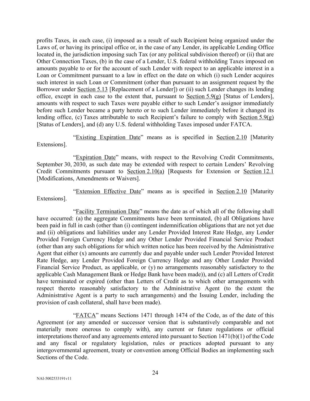NAI-5002533191v11 24 profits Taxes, in each case, (i) imposed as a result of such Recipient being organized under the Laws of, or having its principal office or, in the case of any Lender, its applicable Lending Office located in, the jurisdiction imposing such Tax (or any political subdivision thereof) or (ii) that are Other Connection Taxes, (b) in the case of a Lender, U.S. federal withholding Taxes imposed on amounts payable to or for the account of such Lender with respect to an applicable interest in a Loan or Commitment pursuant to a law in effect on the date on which (i) such Lender acquires such interest in such Loan or Commitment (other than pursuant to an assignment request by the Borrower under Section 5.13 [Replacement of a Lender]) or (ii) such Lender changes its lending office, except in each case to the extent that, pursuant to Section 5.9(g) [Status of Lenders], amounts with respect to such Taxes were payable either to such Lender’s assignor immediately before such Lender became a party hereto or to such Lender immediately before it changed its lending office, (c) Taxes attributable to such Recipient’s failure to comply with Section 5.9(g) [Status of Lenders], and (d) any U.S. federal withholding Taxes imposed under FATCA. “Existing Expiration Date” means as is specified in Section 2.10 [Maturity Extensions]. “Expiration Date” means, with respect to the Revolving Credit Commitments, September 30, 2030, as such date may be extended with respect to certain Lenders’ Revolving Credit Commitments pursuant to Section 2.10(a) [Requests for Extension or Section 12.1 [Modifications, Amendments or Waivers]. “Extension Effective Date” means as is specified in Section 2.10 [Maturity Extensions]. “Facility Termination Date” means the date as of which all of the following shall have occurred: (a) the aggregate Commitments have been terminated, (b) all Obligations have been paid in full in cash (other than (i) contingent indemnification obligations that are not yet due and (ii) obligations and liabilities under any Lender Provided Interest Rate Hedge, any Lender Provided Foreign Currency Hedge and any Other Lender Provided Financial Service Product (other than any such obligations for which written notice has been received by the Administrative Agent that either (x) amounts are currently due and payable under such Lender Provided Interest Rate Hedge, any Lender Provided Foreign Currency Hedge and any Other Lender Provided Financial Service Product, as applicable, or (y) no arrangements reasonably satisfactory to the applicable Cash Management Bank or Hedge Bank have been made)), and (c) all Letters of Credit have terminated or expired (other than Letters of Credit as to which other arrangements with respect thereto reasonably satisfactory to the Administrative Agent (to the extent the Administrative Agent is a party to such arrangements) and the Issuing Lender, including the provision of cash collateral, shall have been made). “FATCA” means Sections 1471 through 1474 of the Code, as of the date of this Agreement (or any amended or successor version that is substantively comparable and not materially more onerous to comply with), any current or future regulations or official interpretations thereof and any agreements entered into pursuant to Section 1471(b)(1) of the Code and any fiscal or regulatory legislation, rules or practices adopted pursuant to any intergovernmental agreement, treaty or convention among Official Bodies an implementing such Sections of the Code.