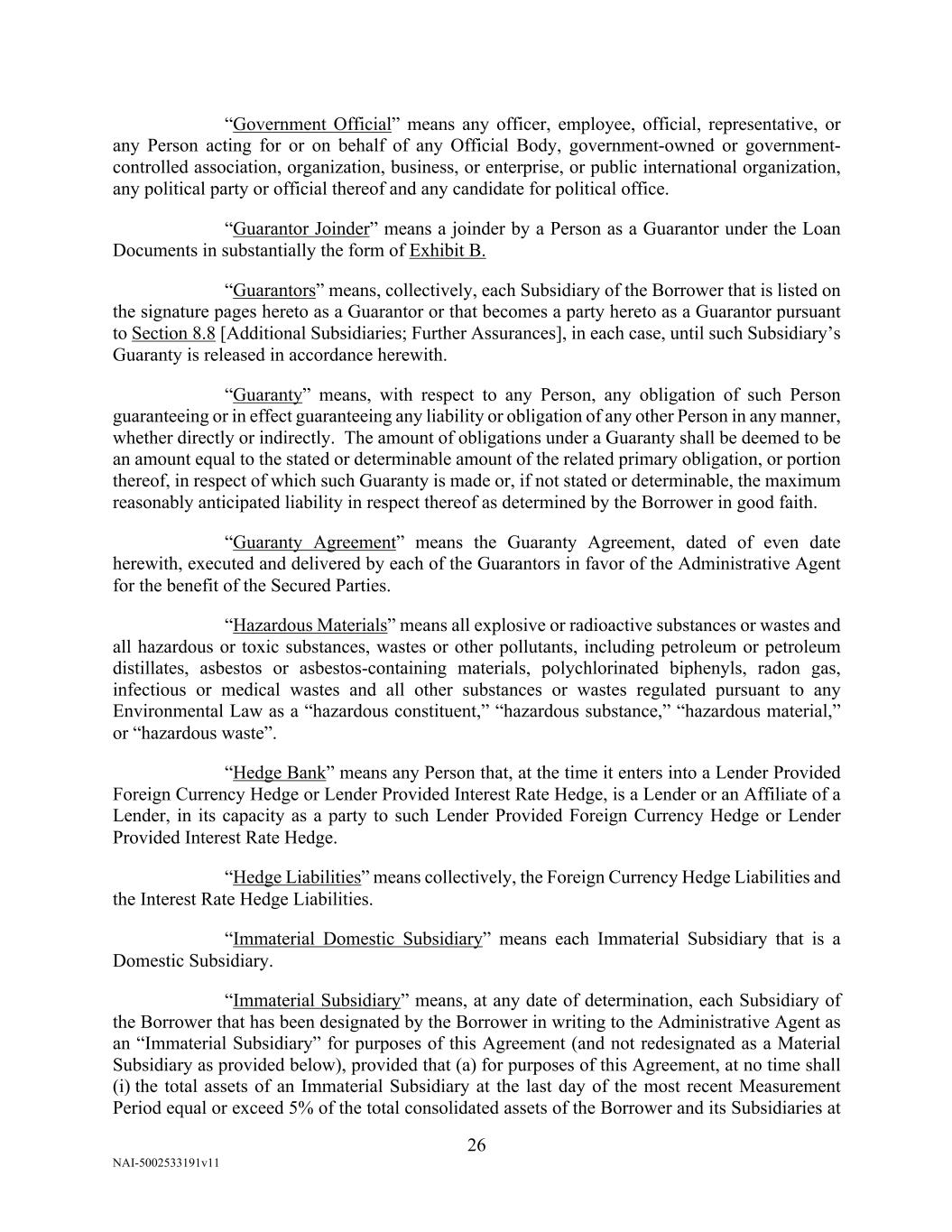 NAI-5002533191v11 26 “Government Official” means any officer, employee, official, representative, or any Person acting for or on behalf of any Official Body, government-owned or government- controlled association, organization, business, or enterprise, or public international organization, any political party or official thereof and any candidate for political office. “Guarantor Joinder” means a joinder by a Person as a Guarantor under the Loan Documents in substantially the form of Exhibit B. “Guarantors” means, collectively, each Subsidiary of the Borrower that is listed on the signature pages hereto as a Guarantor or that becomes a party hereto as a Guarantor pursuant to Section 8.8 [Additional Subsidiaries; Further Assurances], in each case, until such Subsidiary’s Guaranty is released in accordance herewith. “Guaranty” means, with respect to any Person, any obligation of such Person guaranteeing or in effect guaranteeing any liability or obligation of any other Person in any manner, whether directly or indirectly. The amount of obligations under a Guaranty shall be deemed to be an amount equal to the stated or determinable amount of the related primary obligation, or portion thereof, in respect of which such Guaranty is made or, if not stated or determinable, the maximum reasonably anticipated liability in respect thereof as determined by the Borrower in good faith. “Guaranty Agreement” means the Guaranty Agreement, dated of even date herewith, executed and delivered by each of the Guarantors in favor of the Administrative Agent for the benefit of the Secured Parties. “Hazardous Materials” means all explosive or radioactive substances or wastes and all hazardous or toxic substances, wastes or other pollutants, including petroleum or petroleum distillates, asbestos or asbestos-containing materials, polychlorinated biphenyls, radon gas, infectious or medical wastes and all other substances or wastes regulated pursuant to any Environmental Law as a “hazardous constituent,” “hazardous substance,” “hazardous material,” or “hazardous waste”. “Hedge Bank” means any Person that, at the time it enters into a Lender Provided Foreign Currency Hedge or Lender Provided Interest Rate Hedge, is a Lender or an Affiliate of a Lender, in its capacity as a party to such Lender Provided Foreign Currency Hedge or Lender Provided Interest Rate Hedge. “Hedge Liabilities” means collectively, the Foreign Currency Hedge Liabilities and the Interest Rate Hedge Liabilities. “Immaterial Domestic Subsidiary” means each Immaterial Subsidiary that is a Domestic Subsidiary. “Immaterial Subsidiary” means, at any date of determination, each Subsidiary of the Borrower that has been designated by the Borrower in writing to the Administrative Agent as an “Immaterial Subsidiary” for purposes of this Agreement (and not redesignated as a Material Subsidiary as provided below), provided that (a) for purposes of this Agreement, at no time shall (i) the total assets of an Immaterial Subsidiary at the last day of the most recent Measurement Period equal or exceed 5% of the total consolidated assets of the Borrower and its Subsidiaries at
