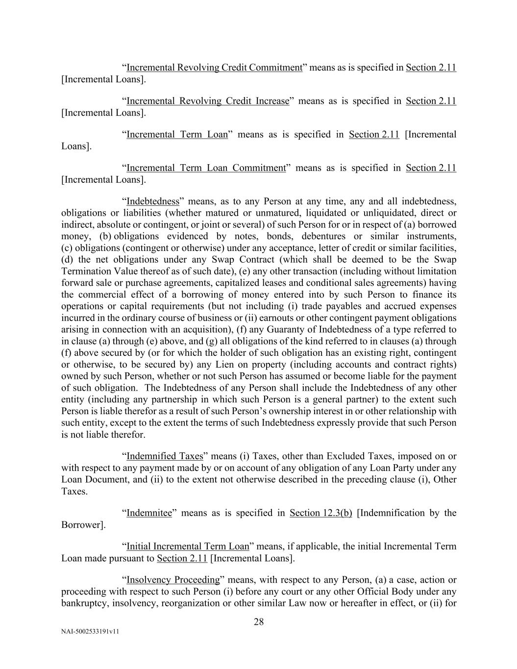 NAI-5002533191v11 28 “Incremental Revolving Credit Commitment” means as is specified in Section 2.11 [Incremental Loans]. “Incremental Revolving Credit Increase” means as is specified in Section 2.11 [Incremental Loans]. “Incremental Term Loan” means as is specified in Section 2.11 [Incremental Loans]. “Incremental Term Loan Commitment” means as is specified in Section 2.11 [Incremental Loans]. “Indebtedness” means, as to any Person at any time, any and all indebtedness, obligations or liabilities (whether matured or unmatured, liquidated or unliquidated, direct or indirect, absolute or contingent, or joint or several) of such Person for or in respect of (a) borrowed money, (b) obligations evidenced by notes, bonds, debentures or similar instruments, (c) obligations (contingent or otherwise) under any acceptance, letter of credit or similar facilities, (d) the net obligations under any Swap Contract (which shall be deemed to be the Swap Termination Value thereof as of such date), (e) any other transaction (including without limitation forward sale or purchase agreements, capitalized leases and conditional sales agreements) having the commercial effect of a borrowing of money entered into by such Person to finance its operations or capital requirements (but not including (i) trade payables and accrued expenses incurred in the ordinary course of business or (ii) earnouts or other contingent payment obligations arising in connection with an acquisition), (f) any Guaranty of Indebtedness of a type referred to in clause (a) through (e) above, and (g) all obligations of the kind referred to in clauses (a) through (f) above secured by (or for which the holder of such obligation has an existing right, contingent or otherwise, to be secured by) any Lien on property (including accounts and contract rights) owned by such Person, whether or not such Person has assumed or become liable for the payment of such obligation. The Indebtedness of any Person shall include the Indebtedness of any other entity (including any partnership in which such Person is a general partner) to the extent such Person is liable therefor as a result of such Person’s ownership interest in or other relationship with such entity, except to the extent the terms of such Indebtedness expressly provide that such Person is not liable therefor. “Indemnified Taxes” means (i) Taxes, other than Excluded Taxes, imposed on or with respect to any payment made by or on account of any obligation of any Loan Party under any Loan Document, and (ii) to the extent not otherwise described in the preceding clause (i), Other Taxes. “Indemnitee” means as is specified in Section 12.3(b) [Indemnification by the Borrower]. “Initial Incremental Term Loan” means, if applicable, the initial Incremental Term Loan made pursuant to Section 2.11 [Incremental Loans]. “Insolvency Proceeding” means, with respect to any Person, (a) a case, action or proceeding with respect to such Person (i) before any court or any other Official Body under any bankruptcy, insolvency, reorganization or other similar Law now or hereafter in effect, or (ii) for