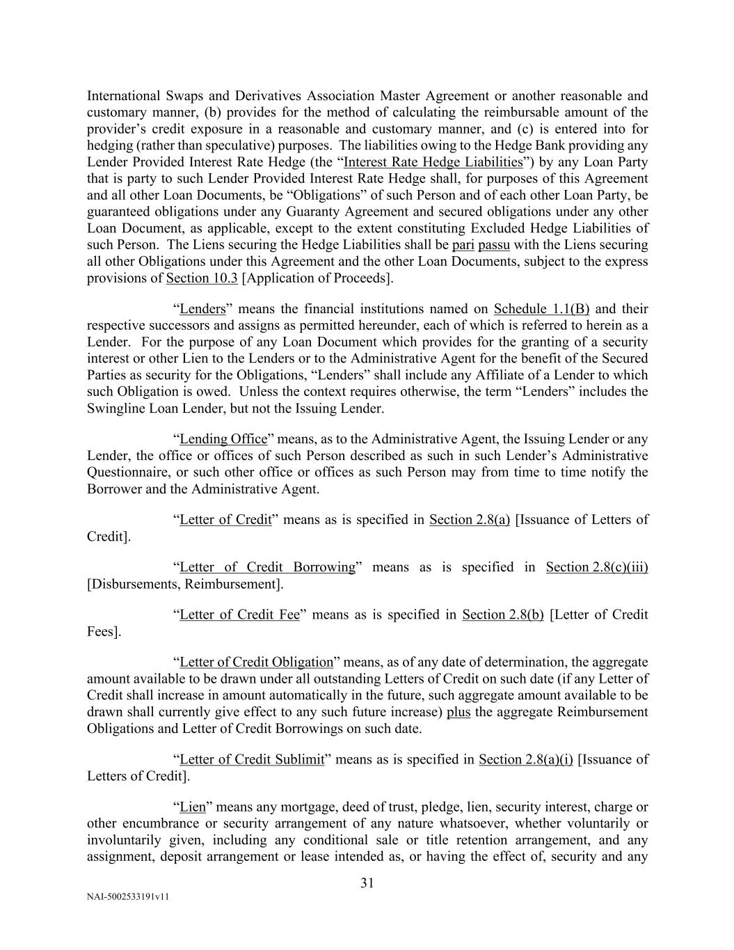 NAI-5002533191v11 31 International Swaps and Derivatives Association Master Agreement or another reasonable and customary manner, (b) provides for the method of calculating the reimbursable amount of the provider’s credit exposure in a reasonable and customary manner, and (c) is entered into for hedging (rather than speculative) purposes. The liabilities owing to the Hedge Bank providing any Lender Provided Interest Rate Hedge (the “Interest Rate Hedge Liabilities”) by any Loan Party that is party to such Lender Provided Interest Rate Hedge shall, for purposes of this Agreement and all other Loan Documents, be “Obligations” of such Person and of each other Loan Party, be guaranteed obligations under any Guaranty Agreement and secured obligations under any other Loan Document, as applicable, except to the extent constituting Excluded Hedge Liabilities of such Person. The Liens securing the Hedge Liabilities shall be pari passu with the Liens securing all other Obligations under this Agreement and the other Loan Documents, subject to the express provisions of Section 10.3 [Application of Proceeds]. “Lenders” means the financial institutions named on Schedule 1.1(B) and their respective successors and assigns as permitted hereunder, each of which is referred to herein as a Lender. For the purpose of any Loan Document which provides for the granting of a security interest or other Lien to the Lenders or to the Administrative Agent for the benefit of the Secured Parties as security for the Obligations, “Lenders” shall include any Affiliate of a Lender to which such Obligation is owed. Unless the context requires otherwise, the term “Lenders” includes the Swingline Loan Lender, but not the Issuing Lender. “Lending Office” means, as to the Administrative Agent, the Issuing Lender or any Lender, the office or offices of such Person described as such in such Lender’s Administrative Questionnaire, or such other office or offices as such Person may from time to time notify the Borrower and the Administrative Agent. “Letter of Credit” means as is specified in Section 2.8(a) [Issuance of Letters of Credit]. “Letter of Credit Borrowing” means as is specified in Section 2.8(c)(iii) [Disbursements, Reimbursement]. “Letter of Credit Fee” means as is specified in Section 2.8(b) [Letter of Credit Fees]. “Letter of Credit Obligation” means, as of any date of determination, the aggregate amount available to be drawn under all outstanding Letters of Credit on such date (if any Letter of Credit shall increase in amount automatically in the future, such aggregate amount available to be drawn shall currently give effect to any such future increase) plus the aggregate Reimbursement Obligations and Letter of Credit Borrowings on such date. “Letter of Credit Sublimit” means as is specified in Section 2.8(a)(i) [Issuance of Letters of Credit]. “Lien” means any mortgage, deed of trust, pledge, lien, security interest, charge or other encumbrance or security arrangement of any nature whatsoever, whether voluntarily or involuntarily given, including any conditional sale or title retention arrangement, and any assignment, deposit arrangement or lease intended as, or having the effect of, security and any