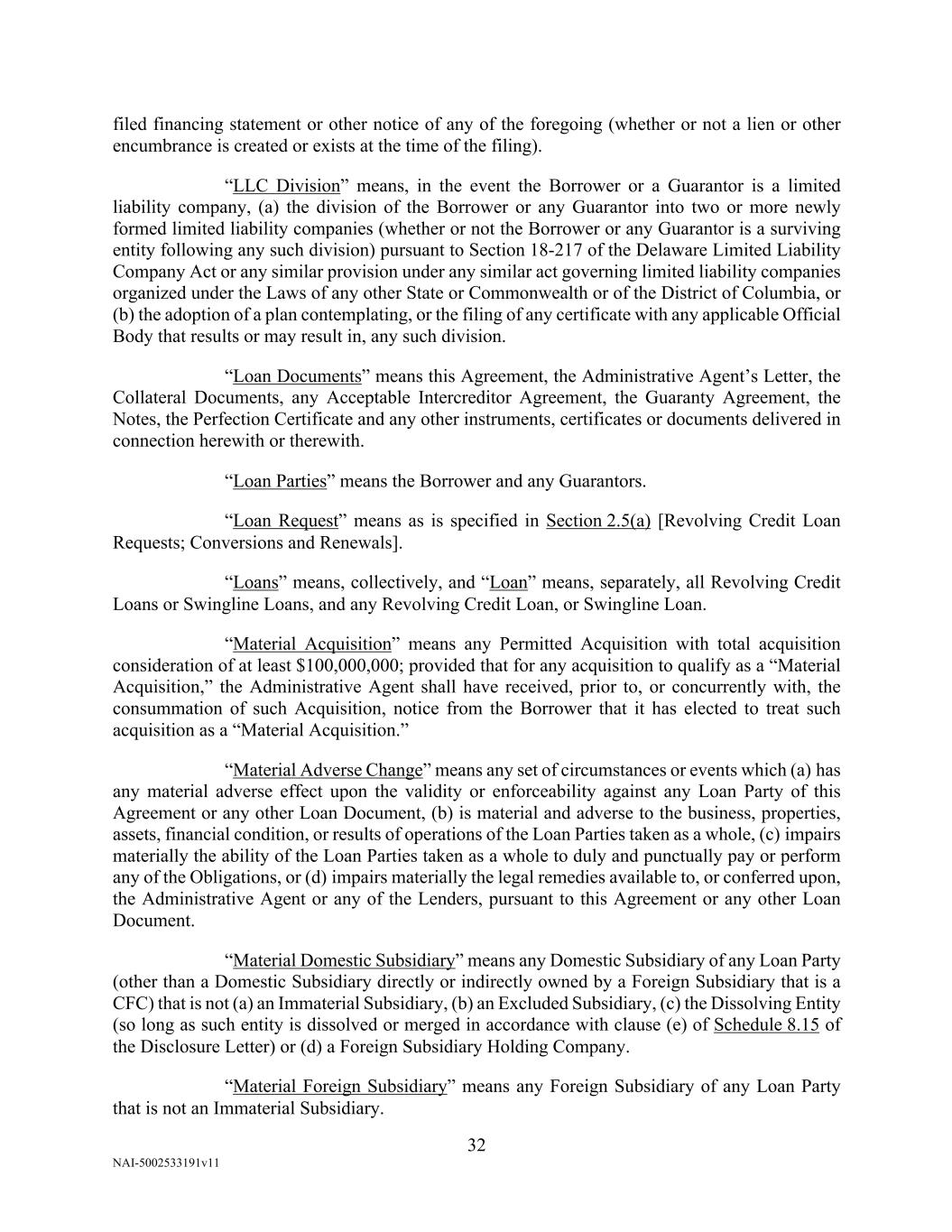 NAI-5002533191v11 32 filed financing statement or other notice of any of the foregoing (whether or not a lien or other encumbrance is created or exists at the time of the filing). “LLC Division” means, in the event the Borrower or a Guarantor is a limited liability company, (a) the division of the Borrower or any Guarantor into two or more newly formed limited liability companies (whether or not the Borrower or any Guarantor is a surviving entity following any such division) pursuant to Section 18-217 of the Delaware Limited Liability Company Act or any similar provision under any similar act governing limited liability companies organized under the Laws of any other State or Commonwealth or of the District of Columbia, or (b) the adoption of a plan contemplating, or the filing of any certificate with any applicable Official Body that results or may result in, any such division. “Loan Documents” means this Agreement, the Administrative Agent’s Letter, the Collateral Documents, any Acceptable Intercreditor Agreement, the Guaranty Agreement, the Notes, the Perfection Certificate and any other instruments, certificates or documents delivered in connection herewith or therewith. “Loan Parties” means the Borrower and any Guarantors. “Loan Request” means as is specified in Section 2.5(a) [Revolving Credit Loan Requests; Conversions and Renewals]. “Loans” means, collectively, and “Loan” means, separately, all Revolving Credit Loans or Swingline Loans, and any Revolving Credit Loan, or Swingline Loan. “Material Acquisition” means any Permitted Acquisition with total acquisition consideration of at least $100,000,000; provided that for any acquisition to qualify as a “Material Acquisition,” the Administrative Agent shall have received, prior to, or concurrently with, the consummation of such Acquisition, notice from the Borrower that it has elected to treat such acquisition as a “Material Acquisition.” “Material Adverse Change” means any set of circumstances or events which (a) has any material adverse effect upon the validity or enforceability against any Loan Party of this Agreement or any other Loan Document, (b) is material and adverse to the business, properties, assets, financial condition, or results of operations of the Loan Parties taken as a whole, (c) impairs materially the ability of the Loan Parties taken as a whole to duly and punctually pay or perform any of the Obligations, or (d) impairs materially the legal remedies available to, or conferred upon, the Administrative Agent or any of the Lenders, pursuant to this Agreement or any other Loan Document. “Material Domestic Subsidiary” means any Domestic Subsidiary of any Loan Party (other than a Domestic Subsidiary directly or indirectly owned by a Foreign Subsidiary that is a CFC) that is not (a) an Immaterial Subsidiary, (b) an Excluded Subsidiary, (c) the Dissolving Entity (so long as such entity is dissolved or merged in accordance with clause (e) of Schedule 8.15 of the Disclosure Letter) or (d) a Foreign Subsidiary Holding Company. “Material Foreign Subsidiary” means any Foreign Subsidiary of any Loan Party that is not an Immaterial Subsidiary.