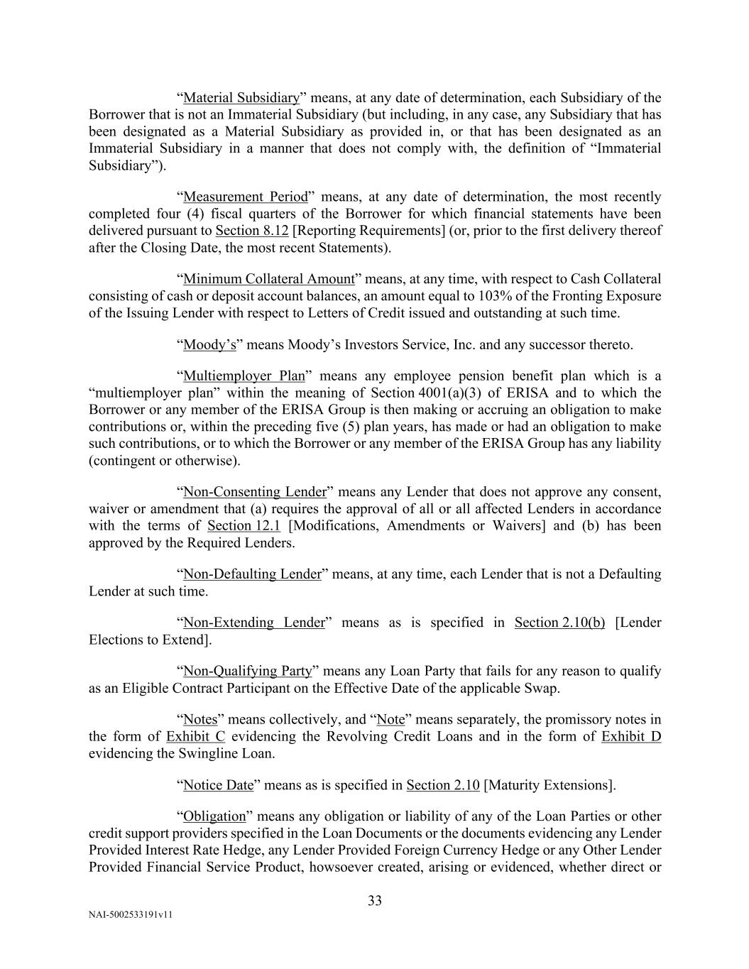 NAI-5002533191v11 33 “Material Subsidiary” means, at any date of determination, each Subsidiary of the Borrower that is not an Immaterial Subsidiary (but including, in any case, any Subsidiary that has been designated as a Material Subsidiary as provided in, or that has been designated as an Immaterial Subsidiary in a manner that does not comply with, the definition of “Immaterial Subsidiary”). “Measurement Period” means, at any date of determination, the most recently completed four (4) fiscal quarters of the Borrower for which financial statements have been delivered pursuant to Section 8.12 [Reporting Requirements] (or, prior to the first delivery thereof after the Closing Date, the most recent Statements). “Minimum Collateral Amount” means, at any time, with respect to Cash Collateral consisting of cash or deposit account balances, an amount equal to 103% of the Fronting Exposure of the Issuing Lender with respect to Letters of Credit issued and outstanding at such time. “Moody’s” means Moody’s Investors Service, Inc. and any successor thereto. “Multiemployer Plan” means any employee pension benefit plan which is a “multiemployer plan” within the meaning of Section 4001(a)(3) of ERISA and to which the Borrower or any member of the ERISA Group is then making or accruing an obligation to make contributions or, within the preceding five (5) plan years, has made or had an obligation to make such contributions, or to which the Borrower or any member of the ERISA Group has any liability (contingent or otherwise). “Non-Consenting Lender” means any Lender that does not approve any consent, waiver or amendment that (a) requires the approval of all or all affected Lenders in accordance with the terms of Section 12.1 [Modifications, Amendments or Waivers] and (b) has been approved by the Required Lenders. “Non-Defaulting Lender” means, at any time, each Lender that is not a Defaulting Lender at such time. “Non-Extending Lender” means as is specified in Section 2.10(b) [Lender Elections to Extend]. “Non-Qualifying Party” means any Loan Party that fails for any reason to qualify as an Eligible Contract Participant on the Effective Date of the applicable Swap. “Notes” means collectively, and “Note” means separately, the promissory notes in the form of Exhibit C evidencing the Revolving Credit Loans and in the form of Exhibit D evidencing the Swingline Loan. “Notice Date” means as is specified in Section 2.10 [Maturity Extensions]. “Obligation” means any obligation or liability of any of the Loan Parties or other credit support providers specified in the Loan Documents or the documents evidencing any Lender Provided Interest Rate Hedge, any Lender Provided Foreign Currency Hedge or any Other Lender Provided Financial Service Product, howsoever created, arising or evidenced, whether direct or