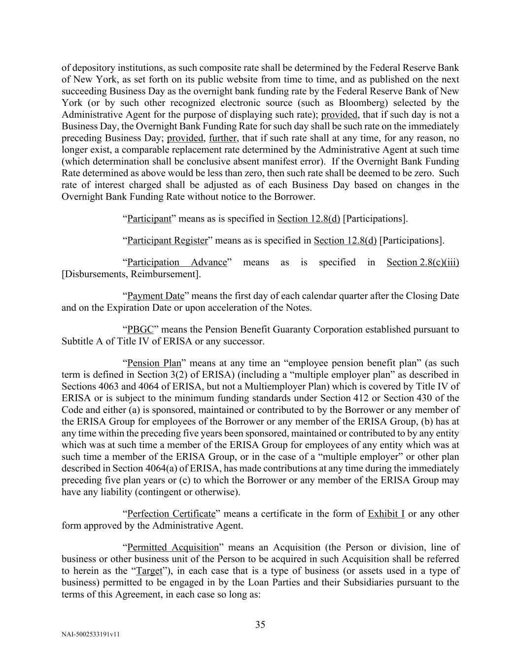 NAI-5002533191v11 35 of depository institutions, as such composite rate shall be determined by the Federal Reserve Bank of New York, as set forth on its public website from time to time, and as published on the next succeeding Business Day as the overnight bank funding rate by the Federal Reserve Bank of New York (or by such other recognized electronic source (such as Bloomberg) selected by the Administrative Agent for the purpose of displaying such rate); provided, that if such day is not a Business Day, the Overnight Bank Funding Rate for such day shall be such rate on the immediately preceding Business Day; provided, further, that if such rate shall at any time, for any reason, no longer exist, a comparable replacement rate determined by the Administrative Agent at such time (which determination shall be conclusive absent manifest error). If the Overnight Bank Funding Rate determined as above would be less than zero, then such rate shall be deemed to be zero. Such rate of interest charged shall be adjusted as of each Business Day based on changes in the Overnight Bank Funding Rate without notice to the Borrower. “Participant” means as is specified in Section 12.8(d) [Participations]. “Participant Register” means as is specified in Section 12.8(d) [Participations]. “Participation Advance” means as is specified in Section 2.8(c)(iii) [Disbursements, Reimbursement]. “Payment Date” means the first day of each calendar quarter after the Closing Date and on the Expiration Date or upon acceleration of the Notes. “PBGC” means the Pension Benefit Guaranty Corporation established pursuant to Subtitle A of Title IV of ERISA or any successor. “Pension Plan” means at any time an “employee pension benefit plan” (as such term is defined in Section 3(2) of ERISA) (including a “multiple employer plan” as described in Sections 4063 and 4064 of ERISA, but not a Multiemployer Plan) which is covered by Title IV of ERISA or is subject to the minimum funding standards under Section 412 or Section 430 of the Code and either (a) is sponsored, maintained or contributed to by the Borrower or any member of the ERISA Group for employees of the Borrower or any member of the ERISA Group, (b) has at any time within the preceding five years been sponsored, maintained or contributed to by any entity which was at such time a member of the ERISA Group for employees of any entity which was at such time a member of the ERISA Group, or in the case of a “multiple employer” or other plan described in Section 4064(a) of ERISA, has made contributions at any time during the immediately preceding five plan years or (c) to which the Borrower or any member of the ERISA Group may have any liability (contingent or otherwise). “Perfection Certificate” means a certificate in the form of Exhibit I or any other form approved by the Administrative Agent. “Permitted Acquisition” means an Acquisition (the Person or division, line of business or other business unit of the Person to be acquired in such Acquisition shall be referred to herein as the “Target”), in each case that is a type of business (or assets used in a type of business) permitted to be engaged in by the Loan Parties and their Subsidiaries pursuant to the terms of this Agreement, in each case so long as: