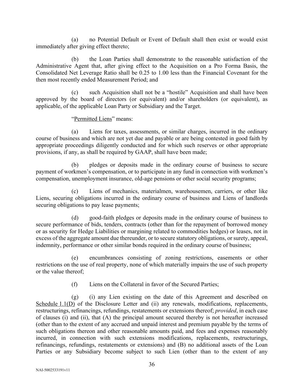 NAI-5002533191v11 36 (a) no Potential Default or Event of Default shall then exist or would exist immediately after giving effect thereto; (b) the Loan Parties shall demonstrate to the reasonable satisfaction of the Administrative Agent that, after giving effect to the Acquisition on a Pro Forma Basis, the Consolidated Net Leverage Ratio shall be 0.25 to 1.00 less than the Financial Covenant for the then most recently ended Measurement Period; and (c) such Acquisition shall not be a “hostile” Acquisition and shall have been approved by the board of directors (or equivalent) and/or shareholders (or equivalent), as applicable, of the applicable Loan Party or Subsidiary and the Target. “Permitted Liens” means: (a) Liens for taxes, assessments, or similar charges, incurred in the ordinary course of business and which are not yet due and payable or are being contested in good faith by appropriate proceedings diligently conducted and for which such reserves or other appropriate provisions, if any, as shall be required by GAAP, shall have been made; (b) pledges or deposits made in the ordinary course of business to secure payment of workmen’s compensation, or to participate in any fund in connection with workmen’s compensation, unemployment insurance, old-age pensions or other social security programs; (c) Liens of mechanics, materialmen, warehousemen, carriers, or other like Liens, securing obligations incurred in the ordinary course of business and Liens of landlords securing obligations to pay lease payments; (d) good-faith pledges or deposits made in the ordinary course of business to secure performance of bids, tenders, contracts (other than for the repayment of borrowed money or as security for Hedge Liabilities or margining related to commodities hedges) or leases, not in excess of the aggregate amount due thereunder, or to secure statutory obligations, or surety, appeal, indemnity, performance or other similar bonds required in the ordinary course of business; (e) encumbrances consisting of zoning restrictions, easements or other restrictions on the use of real property, none of which materially impairs the use of such property or the value thereof; (f) Liens on the Collateral in favor of the Secured Parties; (g) (i) any Lien existing on the date of this Agreement and described on Schedule 1.1(D) of the Disclosure Letter and (ii) any renewals, modifications, replacements, restructurings, refinancings, refundings, restatements or extensions thereof; provided, in each case of clauses (i) and (ii), that (A) the principal amount secured thereby is not hereafter increased (other than to the extent of any accrued and unpaid interest and premium payable by the terms of such obligations thereon and other reasonable amounts paid, and fees and expenses reasonably incurred, in connection with such extensions modifications, replacements, restructurings, refinancings, refundings, restatements or extensions) and (B) no additional assets of the Loan Parties or any Subsidiary become subject to such Lien (other than to the extent of any