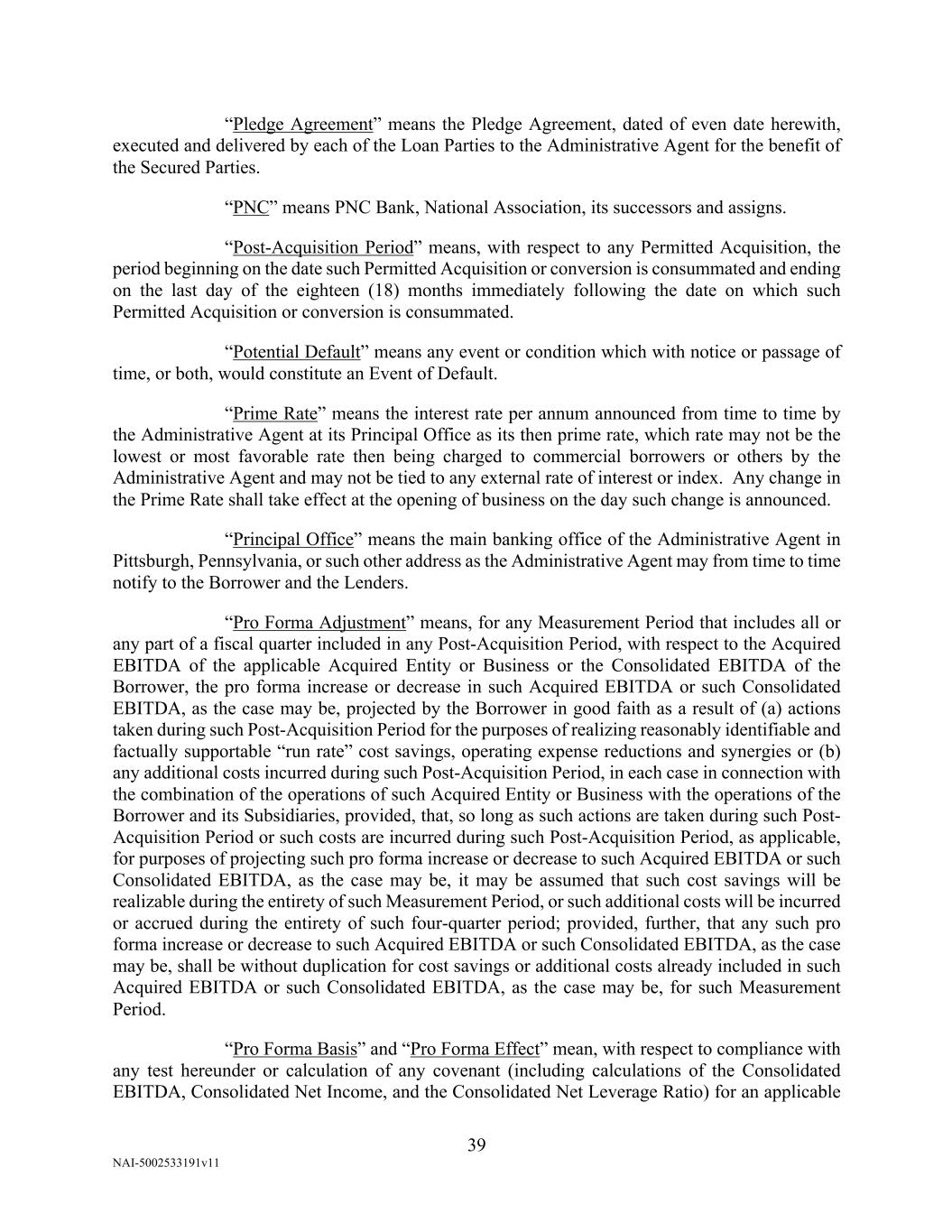 NAI-5002533191v11 39 “Pledge Agreement” means the Pledge Agreement, dated of even date herewith, executed and delivered by each of the Loan Parties to the Administrative Agent for the benefit of the Secured Parties. “PNC” means PNC Bank, National Association, its successors and assigns. “Post-Acquisition Period” means, with respect to any Permitted Acquisition, the period beginning on the date such Permitted Acquisition or conversion is consummated and ending on the last day of the eighteen (18) months immediately following the date on which such Permitted Acquisition or conversion is consummated. “Potential Default” means any event or condition which with notice or passage of time, or both, would constitute an Event of Default. “Prime Rate” means the interest rate per annum announced from time to time by the Administrative Agent at its Principal Office as its then prime rate, which rate may not be the lowest or most favorable rate then being charged to commercial borrowers or others by the Administrative Agent and may not be tied to any external rate of interest or index. Any change in the Prime Rate shall take effect at the opening of business on the day such change is announced. “Principal Office” means the main banking office of the Administrative Agent in Pittsburgh, Pennsylvania, or such other address as the Administrative Agent may from time to time notify to the Borrower and the Lenders. “Pro Forma Adjustment” means, for any Measurement Period that includes all or any part of a fiscal quarter included in any Post-Acquisition Period, with respect to the Acquired EBITDA of the applicable Acquired Entity or Business or the Consolidated EBITDA of the Borrower, the pro forma increase or decrease in such Acquired EBITDA or such Consolidated EBITDA, as the case may be, projected by the Borrower in good faith as a result of (a) actions taken during such Post-Acquisition Period for the purposes of realizing reasonably identifiable and factually supportable “run rate” cost savings, operating expense reductions and synergies or (b) any additional costs incurred during such Post-Acquisition Period, in each case in connection with the combination of the operations of such Acquired Entity or Business with the operations of the Borrower and its Subsidiaries, provided, that, so long as such actions are taken during such Post- Acquisition Period or such costs are incurred during such Post-Acquisition Period, as applicable, for purposes of projecting such pro forma increase or decrease to such Acquired EBITDA or such Consolidated EBITDA, as the case may be, it may be assumed that such cost savings will be realizable during the entirety of such Measurement Period, or such additional costs will be incurred or accrued during the entirety of such four-quarter period; provided, further, that any such pro forma increase or decrease to such Acquired EBITDA or such Consolidated EBITDA, as the case may be, shall be without duplication for cost savings or additional costs already included in such Acquired EBITDA or such Consolidated EBITDA, as the case may be, for such Measurement Period. “Pro Forma Basis” and “Pro Forma Effect” mean, with respect to compliance with any test hereunder or calculation of any covenant (including calculations of the Consolidated EBITDA, Consolidated Net Income, and the Consolidated Net Leverage Ratio) for an applicable