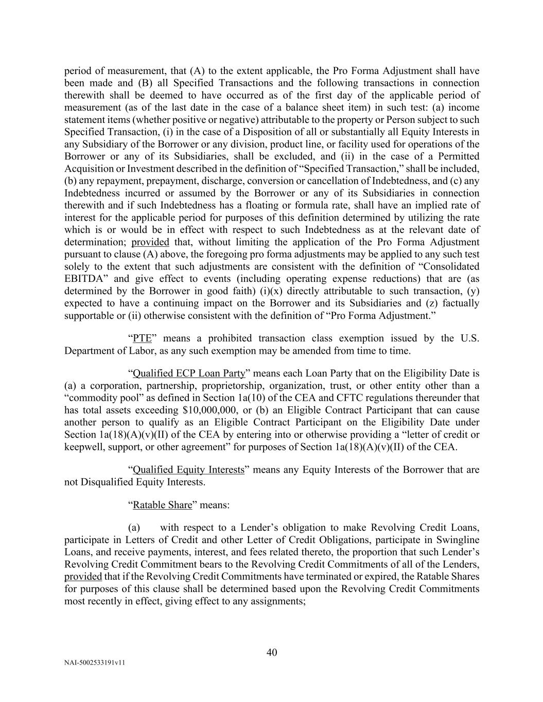 NAI-5002533191v11 40 period of measurement, that (A) to the extent applicable, the Pro Forma Adjustment shall have been made and (B) all Specified Transactions and the following transactions in connection therewith shall be deemed to have occurred as of the first day of the applicable period of measurement (as of the last date in the case of a balance sheet item) in such test: (a) income statement items (whether positive or negative) attributable to the property or Person subject to such Specified Transaction, (i) in the case of a Disposition of all or substantially all Equity Interests in any Subsidiary of the Borrower or any division, product line, or facility used for operations of the Borrower or any of its Subsidiaries, shall be excluded, and (ii) in the case of a Permitted Acquisition or Investment described in the definition of “Specified Transaction,” shall be included, (b) any repayment, prepayment, discharge, conversion or cancellation of Indebtedness, and (c) any Indebtedness incurred or assumed by the Borrower or any of its Subsidiaries in connection therewith and if such Indebtedness has a floating or formula rate, shall have an implied rate of interest for the applicable period for purposes of this definition determined by utilizing the rate which is or would be in effect with respect to such Indebtedness as at the relevant date of determination; provided that, without limiting the application of the Pro Forma Adjustment pursuant to clause (A) above, the foregoing pro forma adjustments may be applied to any such test solely to the extent that such adjustments are consistent with the definition of “Consolidated EBITDA” and give effect to events (including operating expense reductions) that are (as determined by the Borrower in good faith) (i)(x) directly attributable to such transaction, (y) expected to have a continuing impact on the Borrower and its Subsidiaries and (z) factually supportable or (ii) otherwise consistent with the definition of “Pro Forma Adjustment.” “PTE” means a prohibited transaction class exemption issued by the U.S. Department of Labor, as any such exemption may be amended from time to time. “Qualified ECP Loan Party” means each Loan Party that on the Eligibility Date is (a) a corporation, partnership, proprietorship, organization, trust, or other entity other than a “commodity pool” as defined in Section 1a(10) of the CEA and CFTC regulations thereunder that has total assets exceeding $10,000,000, or (b) an Eligible Contract Participant that can cause another person to qualify as an Eligible Contract Participant on the Eligibility Date under Section 1a(18)(A)(v)(II) of the CEA by entering into or otherwise providing a “letter of credit or keepwell, support, or other agreement” for purposes of Section 1a(18)(A)(v)(II) of the CEA. “Qualified Equity Interests” means any Equity Interests of the Borrower that are not Disqualified Equity Interests. “Ratable Share” means: (a) with respect to a Lender’s obligation to make Revolving Credit Loans, participate in Letters of Credit and other Letter of Credit Obligations, participate in Swingline Loans, and receive payments, interest, and fees related thereto, the proportion that such Lender’s Revolving Credit Commitment bears to the Revolving Credit Commitments of all of the Lenders, provided that if the Revolving Credit Commitments have terminated or expired, the Ratable Shares for purposes of this clause shall be determined based upon the Revolving Credit Commitments most recently in effect, giving effect to any assignments;