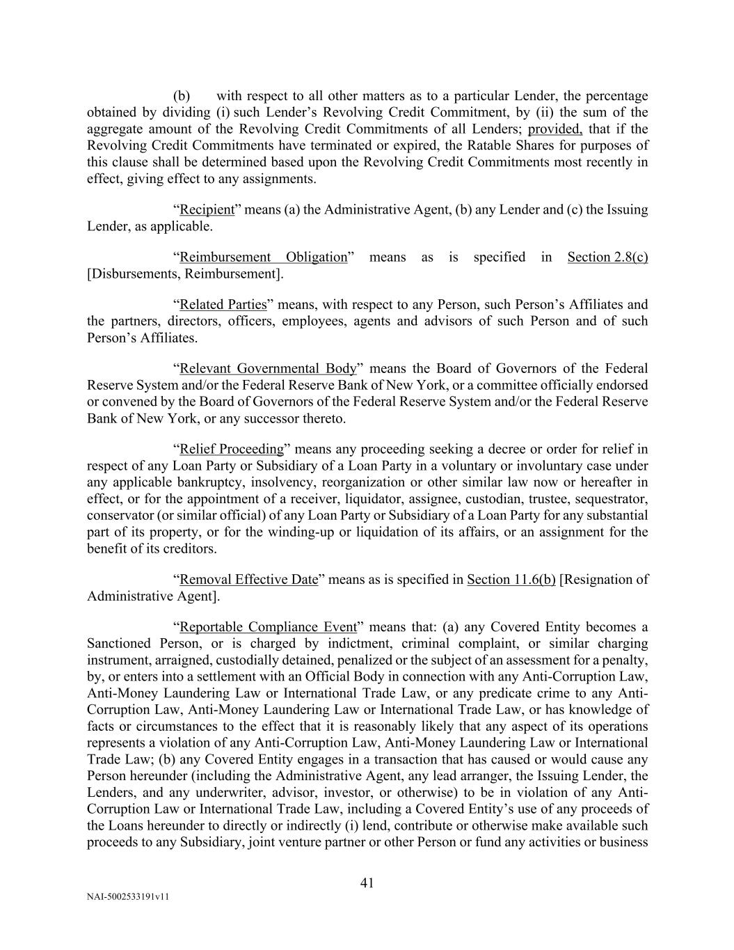 NAI-5002533191v11 41 (b) with respect to all other matters as to a particular Lender, the percentage obtained by dividing (i) such Lender’s Revolving Credit Commitment, by (ii) the sum of the aggregate amount of the Revolving Credit Commitments of all Lenders; provided, that if the Revolving Credit Commitments have terminated or expired, the Ratable Shares for purposes of this clause shall be determined based upon the Revolving Credit Commitments most recently in effect, giving effect to any assignments. “Recipient” means (a) the Administrative Agent, (b) any Lender and (c) the Issuing Lender, as applicable. “Reimbursement Obligation” means as is specified in Section 2.8(c) [Disbursements, Reimbursement]. “Related Parties” means, with respect to any Person, such Person’s Affiliates and the partners, directors, officers, employees, agents and advisors of such Person and of such Person’s Affiliates. “Relevant Governmental Body” means the Board of Governors of the Federal Reserve System and/or the Federal Reserve Bank of New York, or a committee officially endorsed or convened by the Board of Governors of the Federal Reserve System and/or the Federal Reserve Bank of New York, or any successor thereto. “Relief Proceeding” means any proceeding seeking a decree or order for relief in respect of any Loan Party or Subsidiary of a Loan Party in a voluntary or involuntary case under any applicable bankruptcy, insolvency, reorganization or other similar law now or hereafter in effect, or for the appointment of a receiver, liquidator, assignee, custodian, trustee, sequestrator, conservator (or similar official) of any Loan Party or Subsidiary of a Loan Party for any substantial part of its property, or for the winding-up or liquidation of its affairs, or an assignment for the benefit of its creditors. “Removal Effective Date” means as is specified in Section 11.6(b) [Resignation of Administrative Agent]. “Reportable Compliance Event” means that: (a) any Covered Entity becomes a Sanctioned Person, or is charged by indictment, criminal complaint, or similar charging instrument, arraigned, custodially detained, penalized or the subject of an assessment for a penalty, by, or enters into a settlement with an Official Body in connection with any Anti-Corruption Law, Anti-Money Laundering Law or International Trade Law, or any predicate crime to any Anti- Corruption Law, Anti-Money Laundering Law or International Trade Law, or has knowledge of facts or circumstances to the effect that it is reasonably likely that any aspect of its operations represents a violation of any Anti-Corruption Law, Anti-Money Laundering Law or International Trade Law; (b) any Covered Entity engages in a transaction that has caused or would cause any Person hereunder (including the Administrative Agent, any lead arranger, the Issuing Lender, the Lenders, and any underwriter, advisor, investor, or otherwise) to be in violation of any Anti- Corruption Law or International Trade Law, including a Covered Entity’s use of any proceeds of the Loans hereunder to directly or indirectly (i) lend, contribute or otherwise make available such proceeds to any Subsidiary, joint venture partner or other Person or fund any activities or business