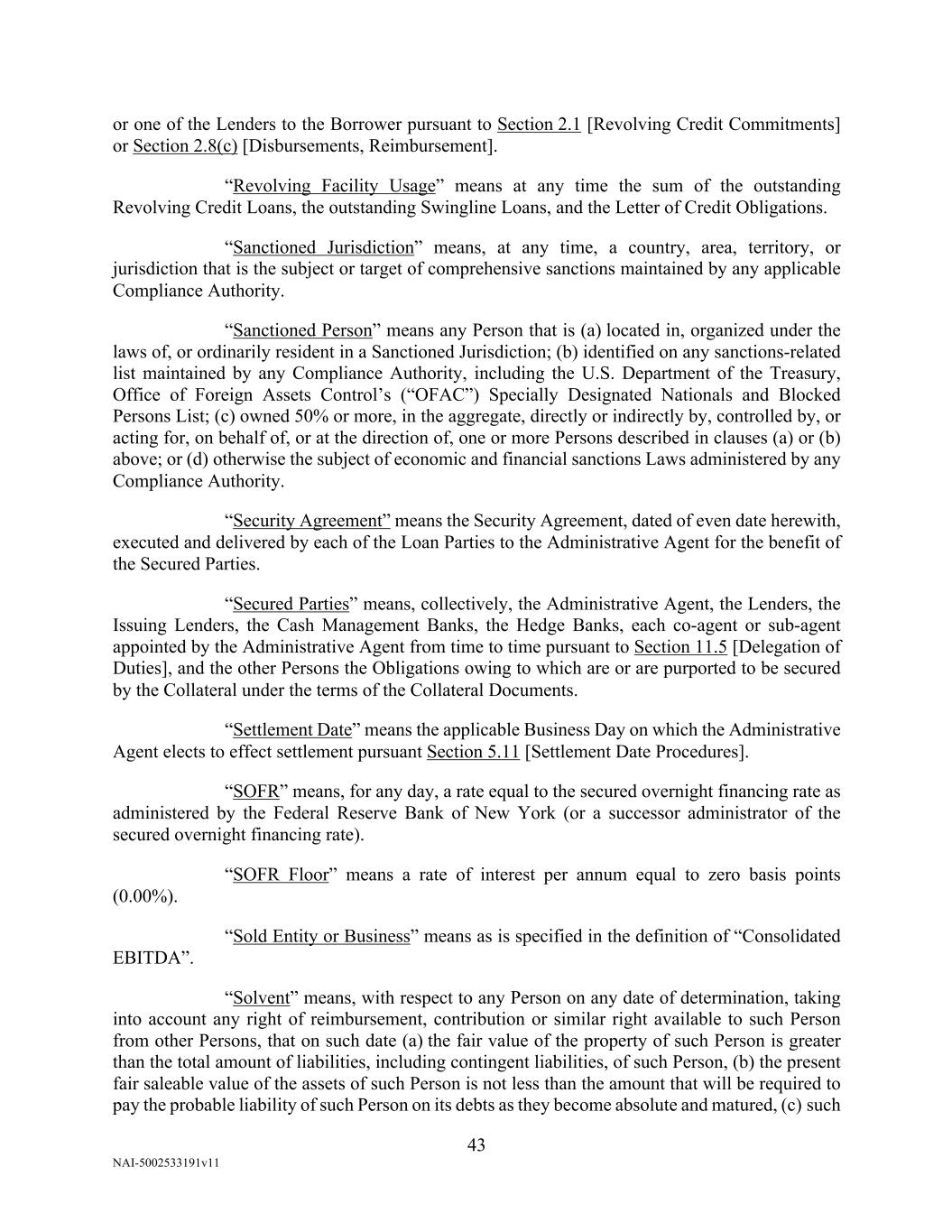 NAI-5002533191v11 43 or one of the Lenders to the Borrower pursuant to Section 2.1 [Revolving Credit Commitments] or Section 2.8(c) [Disbursements, Reimbursement]. “Revolving Facility Usage” means at any time the sum of the outstanding Revolving Credit Loans, the outstanding Swingline Loans, and the Letter of Credit Obligations. “Sanctioned Jurisdiction” means, at any time, a country, area, territory, or jurisdiction that is the subject or target of comprehensive sanctions maintained by any applicable Compliance Authority. “Sanctioned Person” means any Person that is (a) located in, organized under the laws of, or ordinarily resident in a Sanctioned Jurisdiction; (b) identified on any sanctions-related list maintained by any Compliance Authority, including the U.S. Department of the Treasury, Office of Foreign Assets Control’s (“OFAC”) Specially Designated Nationals and Blocked Persons List; (c) owned 50% or more, in the aggregate, directly or indirectly by, controlled by, or acting for, on behalf of, or at the direction of, one or more Persons described in clauses (a) or (b) above; or (d) otherwise the subject of economic and financial sanctions Laws administered by any Compliance Authority. “Security Agreement” means the Security Agreement, dated of even date herewith, executed and delivered by each of the Loan Parties to the Administrative Agent for the benefit of the Secured Parties. “Secured Parties” means, collectively, the Administrative Agent, the Lenders, the Issuing Lenders, the Cash Management Banks, the Hedge Banks, each co-agent or sub-agent appointed by the Administrative Agent from time to time pursuant to Section 11.5 [Delegation of Duties], and the other Persons the Obligations owing to which are or are purported to be secured by the Collateral under the terms of the Collateral Documents. “Settlement Date” means the applicable Business Day on which the Administrative Agent elects to effect settlement pursuant Section 5.11 [Settlement Date Procedures]. “SOFR” means, for any day, a rate equal to the secured overnight financing rate as administered by the Federal Reserve Bank of New York (or a successor administrator of the secured overnight financing rate). “SOFR Floor” means a rate of interest per annum equal to zero basis points (0.00%). “Sold Entity or Business” means as is specified in the definition of “Consolidated EBITDA”. “Solvent” means, with respect to any Person on any date of determination, taking into account any right of reimbursement, contribution or similar right available to such Person from other Persons, that on such date (a) the fair value of the property of such Person is greater than the total amount of liabilities, including contingent liabilities, of such Person, (b) the present fair saleable value of the assets of such Person is not less than the amount that will be required to pay the probable liability of such Person on its debts as they become absolute and matured, (c) such