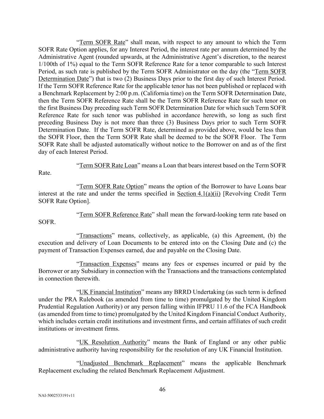 NAI-5002533191v11 46 “Term SOFR Rate” shall mean, with respect to any amount to which the Term SOFR Rate Option applies, for any Interest Period, the interest rate per annum determined by the Administrative Agent (rounded upwards, at the Administrative Agent’s discretion, to the nearest 1/100th of 1%) equal to the Term SOFR Reference Rate for a tenor comparable to such Interest Period, as such rate is published by the Term SOFR Administrator on the day (the “Term SOFR Determination Date”) that is two (2) Business Days prior to the first day of such Interest Period. If the Term SOFR Reference Rate for the applicable tenor has not been published or replaced with a Benchmark Replacement by 2:00 p.m. (California time) on the Term SOFR Determination Date, then the Term SOFR Reference Rate shall be the Term SOFR Reference Rate for such tenor on the first Business Day preceding such Term SOFR Determination Date for which such Term SOFR Reference Rate for such tenor was published in accordance herewith, so long as such first preceding Business Day is not more than three (3) Business Days prior to such Term SOFR Determination Date. If the Term SOFR Rate, determined as provided above, would be less than the SOFR Floor, then the Term SOFR Rate shall be deemed to be the SOFR Floor. The Term SOFR Rate shall be adjusted automatically without notice to the Borrower on and as of the first day of each Interest Period. “Term SOFR Rate Loan” means a Loan that bears interest based on the Term SOFR Rate. “Term SOFR Rate Option” means the option of the Borrower to have Loans bear interest at the rate and under the terms specified in Section 4.1(a)(ii) [Revolving Credit Term SOFR Rate Option]. “Term SOFR Reference Rate” shall mean the forward-looking term rate based on SOFR. “Transactions” means, collectively, as applicable, (a) this Agreement, (b) the execution and delivery of Loan Documents to be entered into on the Closing Date and (c) the payment of Transaction Expenses earned, due and payable on the Closing Date. “Transaction Expenses” means any fees or expenses incurred or paid by the Borrower or any Subsidiary in connection with the Transactions and the transactions contemplated in connection therewith. “UK Financial Institution” means any BRRD Undertaking (as such term is defined under the PRA Rulebook (as amended from time to time) promulgated by the United Kingdom Prudential Regulation Authority) or any person falling within IFPRU 11.6 of the FCA Handbook (as amended from time to time) promulgated by the United Kingdom Financial Conduct Authority, which includes certain credit institutions and investment firms, and certain affiliates of such credit institutions or investment firms. “UK Resolution Authority” means the Bank of England or any other public administrative authority having responsibility for the resolution of any UK Financial Institution. “Unadjusted Benchmark Replacement” means the applicable Benchmark Replacement excluding the related Benchmark Replacement Adjustment.