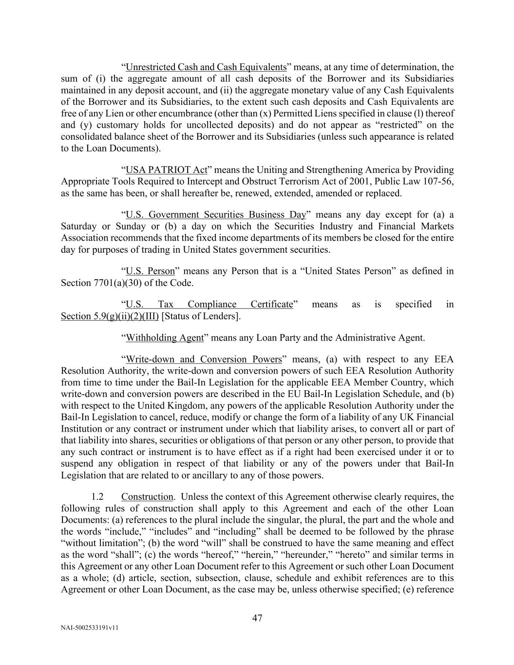 NAI-5002533191v11 47 “Unrestricted Cash and Cash Equivalents” means, at any time of determination, the sum of (i) the aggregate amount of all cash deposits of the Borrower and its Subsidiaries maintained in any deposit account, and (ii) the aggregate monetary value of any Cash Equivalents of the Borrower and its Subsidiaries, to the extent such cash deposits and Cash Equivalents are free of any Lien or other encumbrance (other than (x) Permitted Liens specified in clause (l) thereof and (y) customary holds for uncollected deposits) and do not appear as “restricted” on the consolidated balance sheet of the Borrower and its Subsidiaries (unless such appearance is related to the Loan Documents). “USA PATRIOT Act” means the Uniting and Strengthening America by Providing Appropriate Tools Required to Intercept and Obstruct Terrorism Act of 2001, Public Law 107-56, as the same has been, or shall hereafter be, renewed, extended, amended or replaced. “U.S. Government Securities Business Day” means any day except for (a) a Saturday or Sunday or (b) a day on which the Securities Industry and Financial Markets Association recommends that the fixed income departments of its members be closed for the entire day for purposes of trading in United States government securities. “U.S. Person” means any Person that is a “United States Person” as defined in Section 7701(a)(30) of the Code. “U.S. Tax Compliance Certificate” means as is specified in Section 5.9(g)(ii)(2)(III) [Status of Lenders]. “Withholding Agent” means any Loan Party and the Administrative Agent. “Write-down and Conversion Powers” means, (a) with respect to any EEA Resolution Authority, the write-down and conversion powers of such EEA Resolution Authority from time to time under the Bail-In Legislation for the applicable EEA Member Country, which write-down and conversion powers are described in the EU Bail-In Legislation Schedule, and (b) with respect to the United Kingdom, any powers of the applicable Resolution Authority under the Bail-In Legislation to cancel, reduce, modify or change the form of a liability of any UK Financial Institution or any contract or instrument under which that liability arises, to convert all or part of that liability into shares, securities or obligations of that person or any other person, to provide that any such contract or instrument is to have effect as if a right had been exercised under it or to suspend any obligation in respect of that liability or any of the powers under that Bail-In Legislation that are related to or ancillary to any of those powers. 1.2 Construction. Unless the context of this Agreement otherwise clearly requires, the following rules of construction shall apply to this Agreement and each of the other Loan Documents: (a) references to the plural include the singular, the plural, the part and the whole and the words “include,” “includes” and “including” shall be deemed to be followed by the phrase “without limitation”; (b) the word “will” shall be construed to have the same meaning and effect as the word “shall”; (c) the words “hereof,” “herein,” “hereunder,” “hereto” and similar terms in this Agreement or any other Loan Document refer to this Agreement or such other Loan Document as a whole; (d) article, section, subsection, clause, schedule and exhibit references are to this Agreement or other Loan Document, as the case may be, unless otherwise specified; (e) reference
