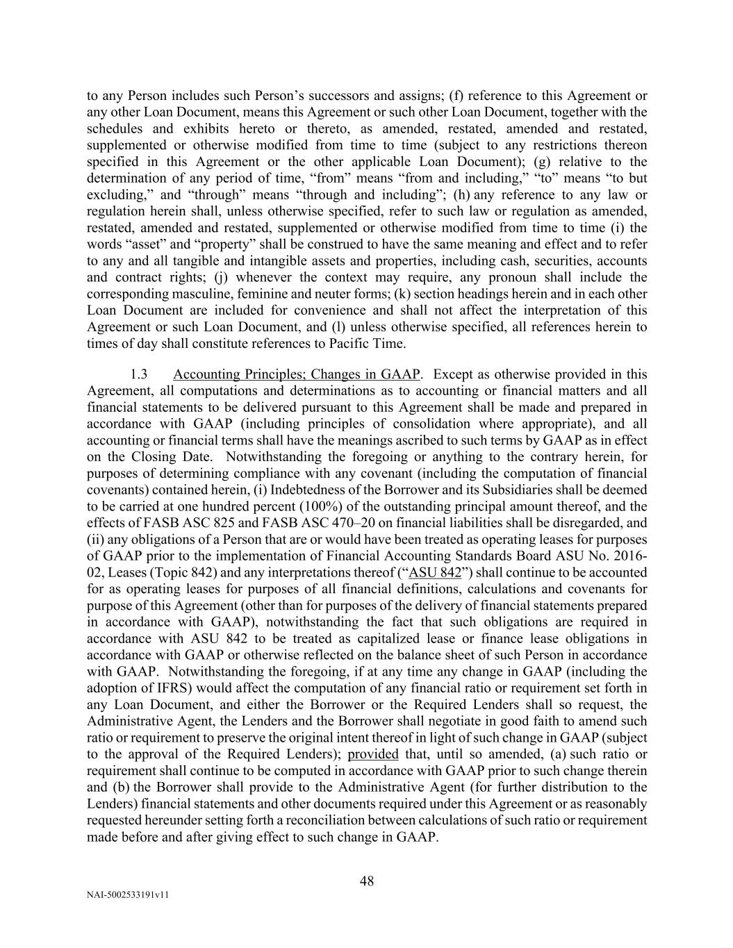 NAI-5002533191v11 48 to any Person includes such Person’s successors and assigns; (f) reference to this Agreement or any other Loan Document, means this Agreement or such other Loan Document, together with the schedules and exhibits hereto or thereto, as amended, restated, amended and restated, supplemented or otherwise modified from time to time (subject to any restrictions thereon specified in this Agreement or the other applicable Loan Document); (g) relative to the determination of any period of time, “from” means “from and including,” “to” means “to but excluding,” and “through” means “through and including”; (h) any reference to any law or regulation herein shall, unless otherwise specified, refer to such law or regulation as amended, restated, amended and restated, supplemented or otherwise modified from time to time (i) the words “asset” and “property” shall be construed to have the same meaning and effect and to refer to any and all tangible and intangible assets and properties, including cash, securities, accounts and contract rights; (j) whenever the context may require, any pronoun shall include the corresponding masculine, feminine and neuter forms; (k) section headings herein and in each other Loan Document are included for convenience and shall not affect the interpretation of this Agreement or such Loan Document, and (l) unless otherwise specified, all references herein to times of day shall constitute references to Pacific Time. 1.3 Accounting Principles; Changes in GAAP. Except as otherwise provided in this Agreement, all computations and determinations as to accounting or financial matters and all financial statements to be delivered pursuant to this Agreement shall be made and prepared in accordance with GAAP (including principles of consolidation where appropriate), and all accounting or financial terms shall have the meanings ascribed to such terms by GAAP as in effect on the Closing Date. Notwithstanding the foregoing or anything to the contrary herein, for purposes of determining compliance with any covenant (including the computation of financial covenants) contained herein, (i) Indebtedness of the Borrower and its Subsidiaries shall be deemed to be carried at one hundred percent (100%) of the outstanding principal amount thereof, and the effects of FASB ASC 825 and FASB ASC 470–20 on financial liabilities shall be disregarded, and (ii) any obligations of a Person that are or would have been treated as operating leases for purposes of GAAP prior to the implementation of Financial Accounting Standards Board ASU No. 2016- 02, Leases (Topic 842) and any interpretations thereof (“ASU 842”) shall continue to be accounted for as operating leases for purposes of all financial definitions, calculations and covenants for purpose of this Agreement (other than for purposes of the delivery of financial statements prepared in accordance with GAAP), notwithstanding the fact that such obligations are required in accordance with ASU 842 to be treated as capitalized lease or finance lease obligations in accordance with GAAP or otherwise reflected on the balance sheet of such Person in accordance with GAAP. Notwithstanding the foregoing, if at any time any change in GAAP (including the adoption of IFRS) would affect the computation of any financial ratio or requirement set forth in any Loan Document, and either the Borrower or the Required Lenders shall so request, the Administrative Agent, the Lenders and the Borrower shall negotiate in good faith to amend such ratio or requirement to preserve the original intent thereof in light of such change in GAAP (subject to the approval of the Required Lenders); provided that, until so amended, (a) such ratio or requirement shall continue to be computed in accordance with GAAP prior to such change therein and (b) the Borrower shall provide to the Administrative Agent (for further distribution to the Lenders) financial statements and other documents required under this Agreement or as reasonably requested hereunder setting forth a reconciliation between calculations of such ratio or requirement made before and after giving effect to such change in GAAP.