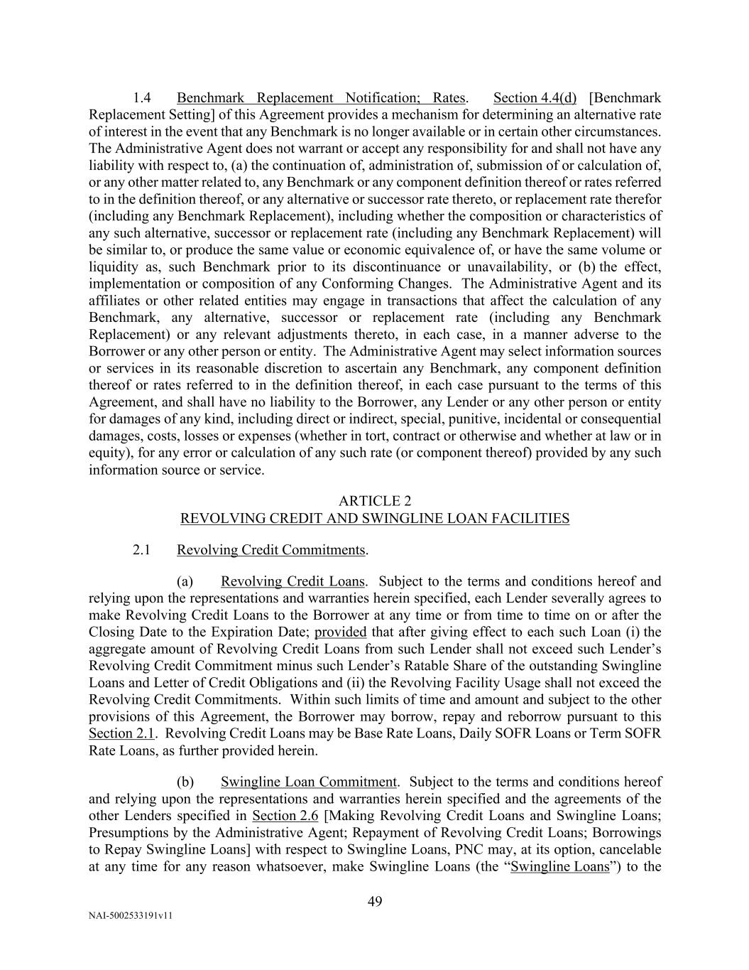 NAI-5002533191v11 49 1.4 Benchmark Replacement Notification; Rates. Section 4.4(d) [Benchmark Replacement Setting] of this Agreement provides a mechanism for determining an alternative rate of interest in the event that any Benchmark is no longer available or in certain other circumstances. The Administrative Agent does not warrant or accept any responsibility for and shall not have any liability with respect to, (a) the continuation of, administration of, submission of or calculation of, or any other matter related to, any Benchmark or any component definition thereof or rates referred to in the definition thereof, or any alternative or successor rate thereto, or replacement rate therefor (including any Benchmark Replacement), including whether the composition or characteristics of any such alternative, successor or replacement rate (including any Benchmark Replacement) will be similar to, or produce the same value or economic equivalence of, or have the same volume or liquidity as, such Benchmark prior to its discontinuance or unavailability, or (b) the effect, implementation or composition of any Conforming Changes. The Administrative Agent and its affiliates or other related entities may engage in transactions that affect the calculation of any Benchmark, any alternative, successor or replacement rate (including any Benchmark Replacement) or any relevant adjustments thereto, in each case, in a manner adverse to the Borrower or any other person or entity. The Administrative Agent may select information sources or services in its reasonable discretion to ascertain any Benchmark, any component definition thereof or rates referred to in the definition thereof, in each case pursuant to the terms of this Agreement, and shall have no liability to the Borrower, any Lender or any other person or entity for damages of any kind, including direct or indirect, special, punitive, incidental or consequential damages, costs, losses or expenses (whether in tort, contract or otherwise and whether at law or in equity), for any error or calculation of any such rate (or component thereof) provided by any such information source or service. ARTICLE 2 REVOLVING CREDIT AND SWINGLINE LOAN FACILITIES 2.1 Revolving Credit Commitments. (a) Revolving Credit Loans. Subject to the terms and conditions hereof and relying upon the representations and warranties herein specified, each Lender severally agrees to make Revolving Credit Loans to the Borrower at any time or from time to time on or after the Closing Date to the Expiration Date; provided that after giving effect to each such Loan (i) the aggregate amount of Revolving Credit Loans from such Lender shall not exceed such Lender’s Revolving Credit Commitment minus such Lender’s Ratable Share of the outstanding Swingline Loans and Letter of Credit Obligations and (ii) the Revolving Facility Usage shall not exceed the Revolving Credit Commitments. Within such limits of time and amount and subject to the other provisions of this Agreement, the Borrower may borrow, repay and reborrow pursuant to this Section 2.1. Revolving Credit Loans may be Base Rate Loans, Daily SOFR Loans or Term SOFR Rate Loans, as further provided herein. (b) Swingline Loan Commitment. Subject to the terms and conditions hereof and relying upon the representations and warranties herein specified and the agreements of the other Lenders specified in Section 2.6 [Making Revolving Credit Loans and Swingline Loans; Presumptions by the Administrative Agent; Repayment of Revolving Credit Loans; Borrowings to Repay Swingline Loans] with respect to Swingline Loans, PNC may, at its option, cancelable at any time for any reason whatsoever, make Swingline Loans (the “Swingline Loans”) to the