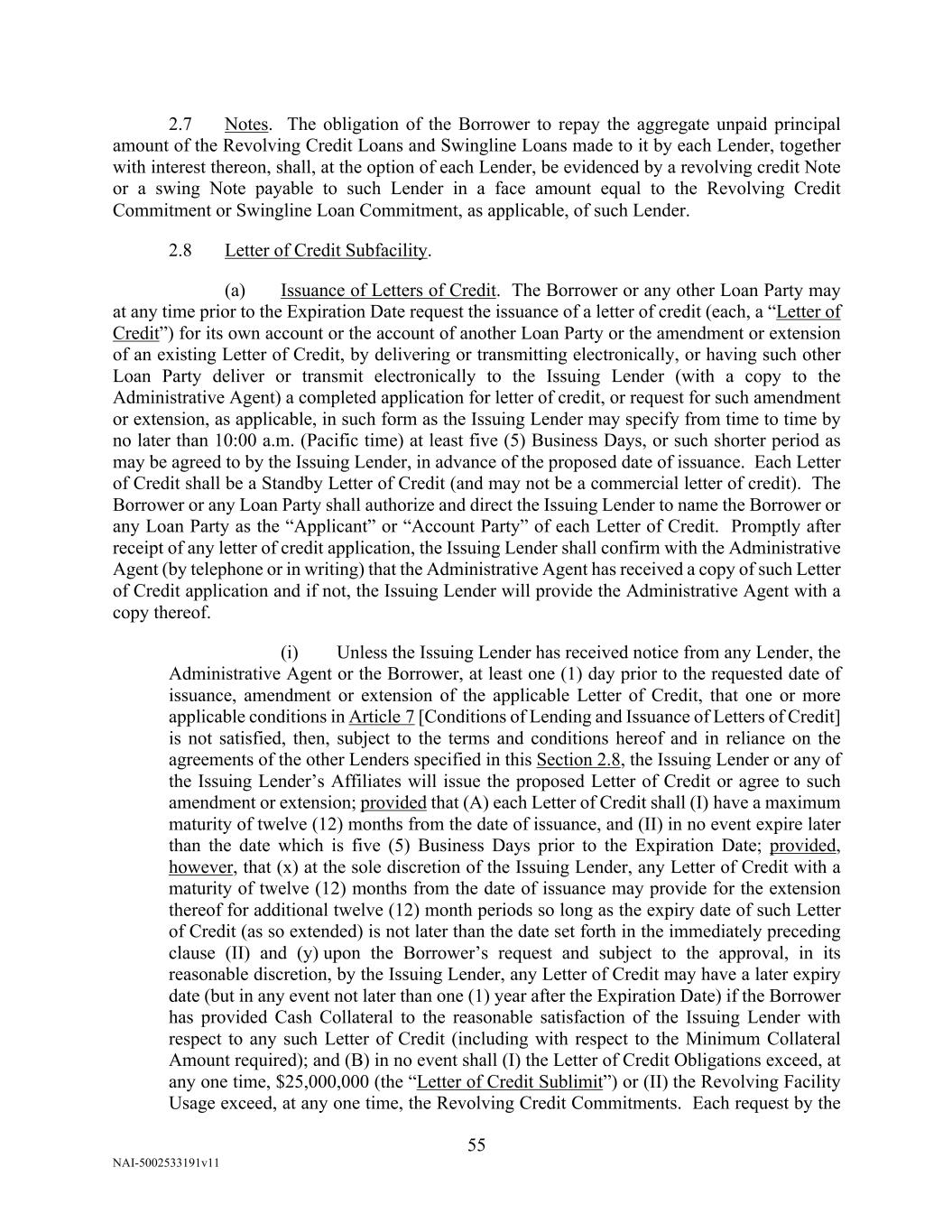 NAI-5002533191v11 55 2.7 Notes. The obligation of the Borrower to repay the aggregate unpaid principal amount of the Revolving Credit Loans and Swingline Loans made to it by each Lender, together with interest thereon, shall, at the option of each Lender, be evidenced by a revolving credit Note or a swing Note payable to such Lender in a face amount equal to the Revolving Credit Commitment or Swingline Loan Commitment, as applicable, of such Lender. 2.8 Letter of Credit Subfacility. (a) Issuance of Letters of Credit. The Borrower or any other Loan Party may at any time prior to the Expiration Date request the issuance of a letter of credit (each, a “Letter of Credit”) for its own account or the account of another Loan Party or the amendment or extension of an existing Letter of Credit, by delivering or transmitting electronically, or having such other Loan Party deliver or transmit electronically to the Issuing Lender (with a copy to the Administrative Agent) a completed application for letter of credit, or request for such amendment or extension, as applicable, in such form as the Issuing Lender may specify from time to time by no later than 10:00 a.m. (Pacific time) at least five (5) Business Days, or such shorter period as may be agreed to by the Issuing Lender, in advance of the proposed date of issuance. Each Letter of Credit shall be a Standby Letter of Credit (and may not be a commercial letter of credit). The Borrower or any Loan Party shall authorize and direct the Issuing Lender to name the Borrower or any Loan Party as the “Applicant” or “Account Party” of each Letter of Credit. Promptly after receipt of any letter of credit application, the Issuing Lender shall confirm with the Administrative Agent (by telephone or in writing) that the Administrative Agent has received a copy of such Letter of Credit application and if not, the Issuing Lender will provide the Administrative Agent with a copy thereof. (i) Unless the Issuing Lender has received notice from any Lender, the Administrative Agent or the Borrower, at least one (1) day prior to the requested date of issuance, amendment or extension of the applicable Letter of Credit, that one or more applicable conditions in Article 7 [Conditions of Lending and Issuance of Letters of Credit] is not satisfied, then, subject to the terms and conditions hereof and in reliance on the agreements of the other Lenders specified in this Section 2.8, the Issuing Lender or any of the Issuing Lender’s Affiliates will issue the proposed Letter of Credit or agree to such amendment or extension; provided that (A) each Letter of Credit shall (I) have a maximum maturity of twelve (12) months from the date of issuance, and (II) in no event expire later than the date which is five (5) Business Days prior to the Expiration Date; provided, however, that (x) at the sole discretion of the Issuing Lender, any Letter of Credit with a maturity of twelve (12) months from the date of issuance may provide for the extension thereof for additional twelve (12) month periods so long as the expiry date of such Letter of Credit (as so extended) is not later than the date set forth in the immediately preceding clause (II) and (y) upon the Borrower’s request and subject to the approval, in its reasonable discretion, by the Issuing Lender, any Letter of Credit may have a later expiry date (but in any event not later than one (1) year after the Expiration Date) if the Borrower has provided Cash Collateral to the reasonable satisfaction of the Issuing Lender with respect to any such Letter of Credit (including with respect to the Minimum Collateral Amount required); and (B) in no event shall (I) the Letter of Credit Obligations exceed, at any one time, $25,000,000 (the “Letter of Credit Sublimit”) or (II) the Revolving Facility Usage exceed, at any one time, the Revolving Credit Commitments. Each request by the
