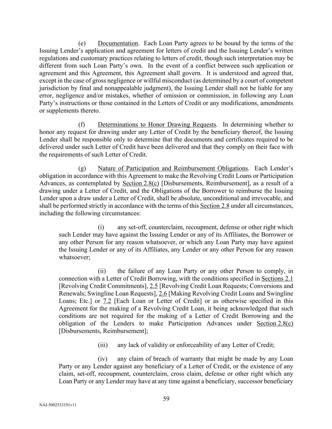 NAI-5002533191v11 59 (e) Documentation. Each Loan Party agrees to be bound by the terms of the Issuing Lender’s application and agreement for letters of credit and the Issuing Lender’s written regulations and customary practices relating to letters of credit, though such interpretation may be different from such Loan Party’s own. In the event of a conflict between such application or agreement and this Agreement, this Agreement shall govern. It is understood and agreed that, except in the case of gross negligence or willful misconduct (as determined by a court of competent jurisdiction by final and nonappealable judgment), the Issuing Lender shall not be liable for any error, negligence and/or mistakes, whether of omission or commission, in following any Loan Party’s instructions or those contained in the Letters of Credit or any modifications, amendments or supplements thereto. (f) Determinations to Honor Drawing Requests. In determining whether to honor any request for drawing under any Letter of Credit by the beneficiary thereof, the Issuing Lender shall be responsible only to determine that the documents and certificates required to be delivered under such Letter of Credit have been delivered and that they comply on their face with the requirements of such Letter of Credit. (g) Nature of Participation and Reimbursement Obligations. Each Lender’s obligation in accordance with this Agreement to make the Revolving Credit Loans or Participation Advances, as contemplated by Section 2.8(c) [Disbursements, Reimbursement], as a result of a drawing under a Letter of Credit, and the Obligations of the Borrower to reimburse the Issuing Lender upon a draw under a Letter of Credit, shall be absolute, unconditional and irrevocable, and shall be performed strictly in accordance with the terms of this Section 2.8 under all circumstances, including the following circumstances: (i) any set-off, counterclaim, recoupment, defense or other right which such Lender may have against the Issuing Lender or any of its Affiliates, the Borrower or any other Person for any reason whatsoever, or which any Loan Party may have against the Issuing Lender or any of its Affiliates, any Lender or any other Person for any reason whatsoever; (ii) the failure of any Loan Party or any other Person to comply, in connection with a Letter of Credit Borrowing, with the conditions specified in Sections 2.1 [Revolving Credit Commitments], 2.5 [Revolving Credit Loan Requests; Conversions and Renewals; Swingline Loan Requests], 2.6 [Making Revolving Credit Loans and Swingline Loans; Etc.] or 7.2 [Each Loan or Letter of Credit] or as otherwise specified in this Agreement for the making of a Revolving Credit Loan, it being acknowledged that such conditions are not required for the making of a Letter of Credit Borrowing and the obligation of the Lenders to make Participation Advances under Section 2.8(c) [Disbursements, Reimbursement]; (iii) any lack of validity or enforceability of any Letter of Credit; (iv) any claim of breach of warranty that might be made by any Loan Party or any Lender against any beneficiary of a Letter of Credit, or the existence of any claim, set-off, recoupment, counterclaim, cross claim, defense or other right which any Loan Party or any Lender may have at any time against a beneficiary, successor beneficiary