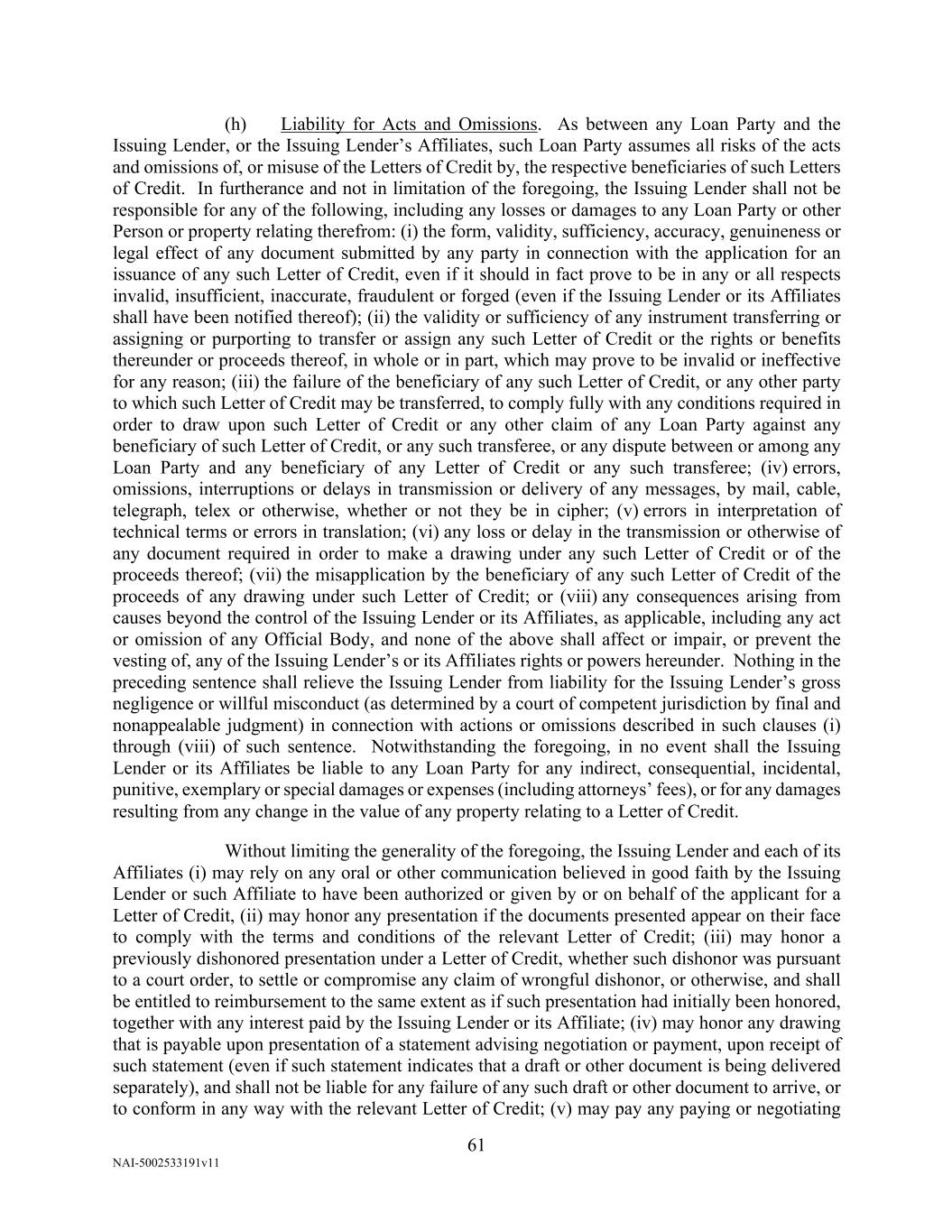 NAI-5002533191v11 61 (h) Liability for Acts and Omissions. As between any Loan Party and the Issuing Lender, or the Issuing Lender’s Affiliates, such Loan Party assumes all risks of the acts and omissions of, or misuse of the Letters of Credit by, the respective beneficiaries of such Letters of Credit. In furtherance and not in limitation of the foregoing, the Issuing Lender shall not be responsible for any of the following, including any losses or damages to any Loan Party or other Person or property relating therefrom: (i) the form, validity, sufficiency, accuracy, genuineness or legal effect of any document submitted by any party in connection with the application for an issuance of any such Letter of Credit, even if it should in fact prove to be in any or all respects invalid, insufficient, inaccurate, fraudulent or forged (even if the Issuing Lender or its Affiliates shall have been notified thereof); (ii) the validity or sufficiency of any instrument transferring or assigning or purporting to transfer or assign any such Letter of Credit or the rights or benefits thereunder or proceeds thereof, in whole or in part, which may prove to be invalid or ineffective for any reason; (iii) the failure of the beneficiary of any such Letter of Credit, or any other party to which such Letter of Credit may be transferred, to comply fully with any conditions required in order to draw upon such Letter of Credit or any other claim of any Loan Party against any beneficiary of such Letter of Credit, or any such transferee, or any dispute between or among any Loan Party and any beneficiary of any Letter of Credit or any such transferee; (iv) errors, omissions, interruptions or delays in transmission or delivery of any messages, by mail, cable, telegraph, telex or otherwise, whether or not they be in cipher; (v) errors in interpretation of technical terms or errors in translation; (vi) any loss or delay in the transmission or otherwise of any document required in order to make a drawing under any such Letter of Credit or of the proceeds thereof; (vii) the misapplication by the beneficiary of any such Letter of Credit of the proceeds of any drawing under such Letter of Credit; or (viii) any consequences arising from causes beyond the control of the Issuing Lender or its Affiliates, as applicable, including any act or omission of any Official Body, and none of the above shall affect or impair, or prevent the vesting of, any of the Issuing Lender’s or its Affiliates rights or powers hereunder. Nothing in the preceding sentence shall relieve the Issuing Lender from liability for the Issuing Lender’s gross negligence or willful misconduct (as determined by a court of competent jurisdiction by final and nonappealable judgment) in connection with actions or omissions described in such clauses (i) through (viii) of such sentence. Notwithstanding the foregoing, in no event shall the Issuing Lender or its Affiliates be liable to any Loan Party for any indirect, consequential, incidental, punitive, exemplary or special damages or expenses (including attorneys’ fees), or for any damages resulting from any change in the value of any property relating to a Letter of Credit. Without limiting the generality of the foregoing, the Issuing Lender and each of its Affiliates (i) may rely on any oral or other communication believed in good faith by the Issuing Lender or such Affiliate to have been authorized or given by or on behalf of the applicant for a Letter of Credit, (ii) may honor any presentation if the documents presented appear on their face to comply with the terms and conditions of the relevant Letter of Credit; (iii) may honor a previously dishonored presentation under a Letter of Credit, whether such dishonor was pursuant to a court order, to settle or compromise any claim of wrongful dishonor, or otherwise, and shall be entitled to reimbursement to the same extent as if such presentation had initially been honored, together with any interest paid by the Issuing Lender or its Affiliate; (iv) may honor any drawing that is payable upon presentation of a statement advising negotiation or payment, upon receipt of such statement (even if such statement indicates that a draft or other document is being delivered separately), and shall not be liable for any failure of any such draft or other document to arrive, or to conform in any way with the relevant Letter of Credit; (v) may pay any paying or negotiating