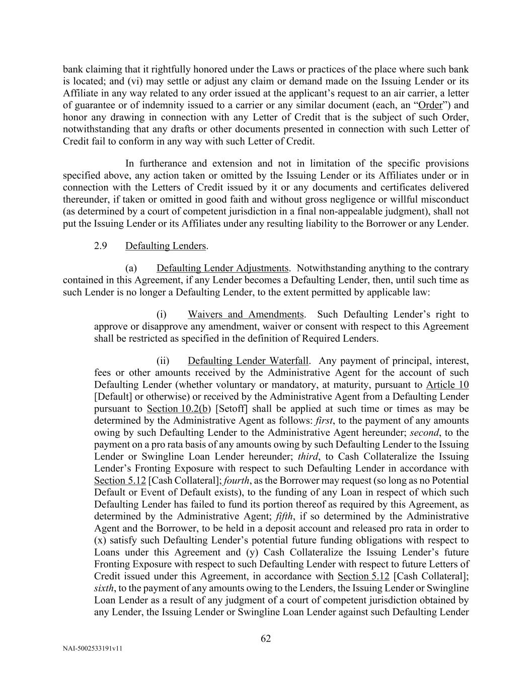 NAI-5002533191v11 62 bank claiming that it rightfully honored under the Laws or practices of the place where such bank is located; and (vi) may settle or adjust any claim or demand made on the Issuing Lender or its Affiliate in any way related to any order issued at the applicant’s request to an air carrier, a letter of guarantee or of indemnity issued to a carrier or any similar document (each, an “Order”) and honor any drawing in connection with any Letter of Credit that is the subject of such Order, notwithstanding that any drafts or other documents presented in connection with such Letter of Credit fail to conform in any way with such Letter of Credit. In furtherance and extension and not in limitation of the specific provisions specified above, any action taken or omitted by the Issuing Lender or its Affiliates under or in connection with the Letters of Credit issued by it or any documents and certificates delivered thereunder, if taken or omitted in good faith and without gross negligence or willful misconduct (as determined by a court of competent jurisdiction in a final non-appealable judgment), shall not put the Issuing Lender or its Affiliates under any resulting liability to the Borrower or any Lender. 2.9 Defaulting Lenders. (a) Defaulting Lender Adjustments. Notwithstanding anything to the contrary contained in this Agreement, if any Lender becomes a Defaulting Lender, then, until such time as such Lender is no longer a Defaulting Lender, to the extent permitted by applicable law: (i) Waivers and Amendments. Such Defaulting Lender’s right to approve or disapprove any amendment, waiver or consent with respect to this Agreement shall be restricted as specified in the definition of Required Lenders. (ii) Defaulting Lender Waterfall. Any payment of principal, interest, fees or other amounts received by the Administrative Agent for the account of such Defaulting Lender (whether voluntary or mandatory, at maturity, pursuant to Article 10 [Default] or otherwise) or received by the Administrative Agent from a Defaulting Lender pursuant to Section 10.2(b) [Setoff] shall be applied at such time or times as may be determined by the Administrative Agent as follows: first, to the payment of any amounts owing by such Defaulting Lender to the Administrative Agent hereunder; second, to the payment on a pro rata basis of any amounts owing by such Defaulting Lender to the Issuing Lender or Swingline Loan Lender hereunder; third, to Cash Collateralize the Issuing Lender’s Fronting Exposure with respect to such Defaulting Lender in accordance with Section 5.12 [Cash Collateral]; fourth, as the Borrower may request (so long as no Potential Default or Event of Default exists), to the funding of any Loan in respect of which such Defaulting Lender has failed to fund its portion thereof as required by this Agreement, as determined by the Administrative Agent; fifth, if so determined by the Administrative Agent and the Borrower, to be held in a deposit account and released pro rata in order to (x) satisfy such Defaulting Lender’s potential future funding obligations with respect to Loans under this Agreement and (y) Cash Collateralize the Issuing Lender’s future Fronting Exposure with respect to such Defaulting Lender with respect to future Letters of Credit issued under this Agreement, in accordance with Section 5.12 [Cash Collateral]; sixth, to the payment of any amounts owing to the Lenders, the Issuing Lender or Swingline Loan Lender as a result of any judgment of a court of competent jurisdiction obtained by any Lender, the Issuing Lender or Swingline Loan Lender against such Defaulting Lender