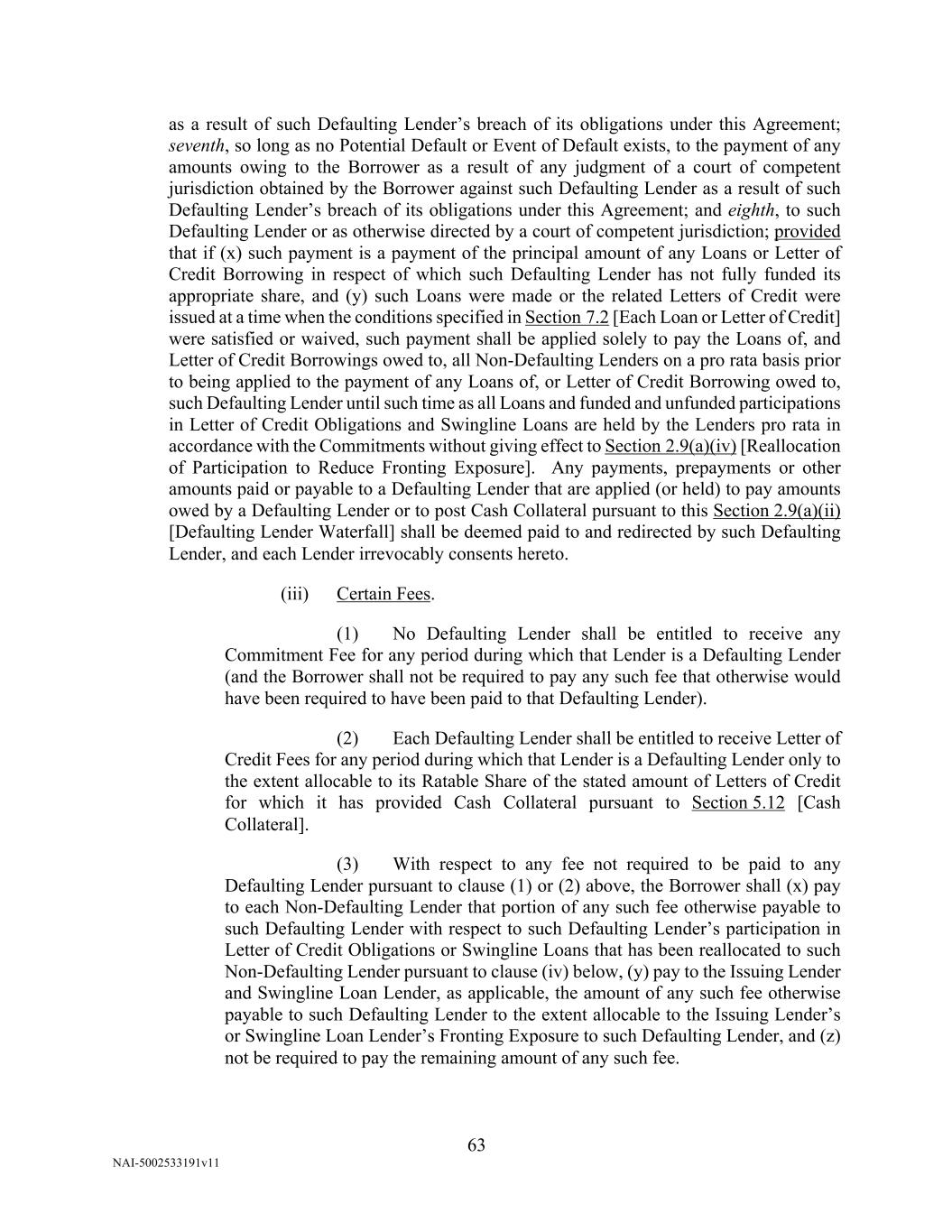 NAI-5002533191v11 63 as a result of such Defaulting Lender’s breach of its obligations under this Agreement; seventh, so long as no Potential Default or Event of Default exists, to the payment of any amounts owing to the Borrower as a result of any judgment of a court of competent jurisdiction obtained by the Borrower against such Defaulting Lender as a result of such Defaulting Lender’s breach of its obligations under this Agreement; and eighth, to such Defaulting Lender or as otherwise directed by a court of competent jurisdiction; provided that if (x) such payment is a payment of the principal amount of any Loans or Letter of Credit Borrowing in respect of which such Defaulting Lender has not fully funded its appropriate share, and (y) such Loans were made or the related Letters of Credit were issued at a time when the conditions specified in Section 7.2 [Each Loan or Letter of Credit] were satisfied or waived, such payment shall be applied solely to pay the Loans of, and Letter of Credit Borrowings owed to, all Non-Defaulting Lenders on a pro rata basis prior to being applied to the payment of any Loans of, or Letter of Credit Borrowing owed to, such Defaulting Lender until such time as all Loans and funded and unfunded participations in Letter of Credit Obligations and Swingline Loans are held by the Lenders pro rata in accordance with the Commitments without giving effect to Section 2.9(a)(iv) [Reallocation of Participation to Reduce Fronting Exposure]. Any payments, prepayments or other amounts paid or payable to a Defaulting Lender that are applied (or held) to pay amounts owed by a Defaulting Lender or to post Cash Collateral pursuant to this Section 2.9(a)(ii) [Defaulting Lender Waterfall] shall be deemed paid to and redirected by such Defaulting Lender, and each Lender irrevocably consents hereto. (iii) Certain Fees. (1) No Defaulting Lender shall be entitled to receive any Commitment Fee for any period during which that Lender is a Defaulting Lender (and the Borrower shall not be required to pay any such fee that otherwise would have been required to have been paid to that Defaulting Lender). (2) Each Defaulting Lender shall be entitled to receive Letter of Credit Fees for any period during which that Lender is a Defaulting Lender only to the extent allocable to its Ratable Share of the stated amount of Letters of Credit for which it has provided Cash Collateral pursuant to Section 5.12 [Cash Collateral]. (3) With respect to any fee not required to be paid to any Defaulting Lender pursuant to clause (1) or (2) above, the Borrower shall (x) pay to each Non-Defaulting Lender that portion of any such fee otherwise payable to such Defaulting Lender with respect to such Defaulting Lender’s participation in Letter of Credit Obligations or Swingline Loans that has been reallocated to such Non-Defaulting Lender pursuant to clause (iv) below, (y) pay to the Issuing Lender and Swingline Loan Lender, as applicable, the amount of any such fee otherwise payable to such Defaulting Lender to the extent allocable to the Issuing Lender’s or Swingline Loan Lender’s Fronting Exposure to such Defaulting Lender, and (z) not be required to pay the remaining amount of any such fee.