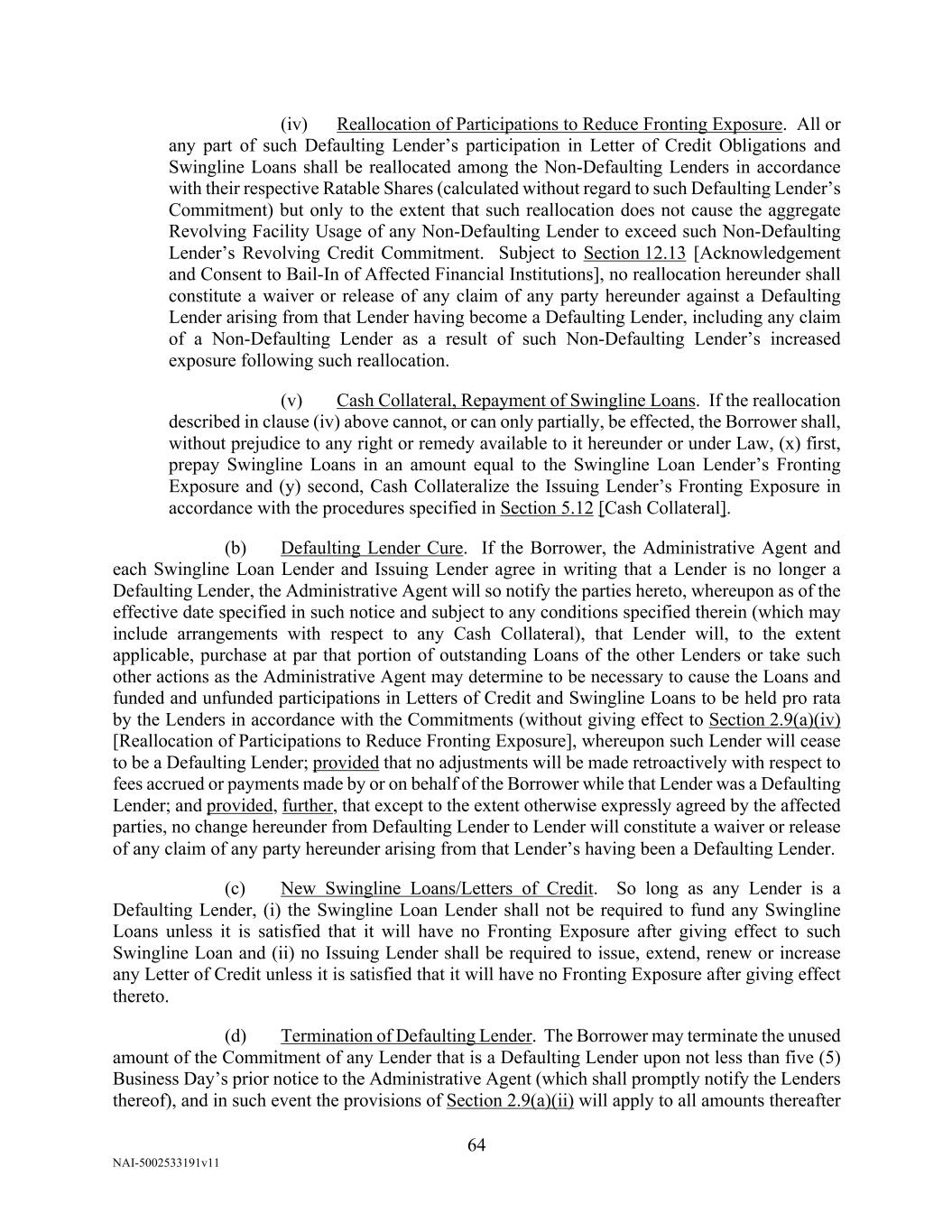 NAI-5002533191v11 64 (iv) Reallocation of Participations to Reduce Fronting Exposure. All or any part of such Defaulting Lender’s participation in Letter of Credit Obligations and Swingline Loans shall be reallocated among the Non-Defaulting Lenders in accordance with their respective Ratable Shares (calculated without regard to such Defaulting Lender’s Commitment) but only to the extent that such reallocation does not cause the aggregate Revolving Facility Usage of any Non-Defaulting Lender to exceed such Non-Defaulting Lender’s Revolving Credit Commitment. Subject to Section 12.13 [Acknowledgement and Consent to Bail-In of Affected Financial Institutions], no reallocation hereunder shall constitute a waiver or release of any claim of any party hereunder against a Defaulting Lender arising from that Lender having become a Defaulting Lender, including any claim of a Non-Defaulting Lender as a result of such Non-Defaulting Lender’s increased exposure following such reallocation. (v) Cash Collateral, Repayment of Swingline Loans. If the reallocation described in clause (iv) above cannot, or can only partially, be effected, the Borrower shall, without prejudice to any right or remedy available to it hereunder or under Law, (x) first, prepay Swingline Loans in an amount equal to the Swingline Loan Lender’s Fronting Exposure and (y) second, Cash Collateralize the Issuing Lender’s Fronting Exposure in accordance with the procedures specified in Section 5.12 [Cash Collateral]. (b) Defaulting Lender Cure. If the Borrower, the Administrative Agent and each Swingline Loan Lender and Issuing Lender agree in writing that a Lender is no longer a Defaulting Lender, the Administrative Agent will so notify the parties hereto, whereupon as of the effective date specified in such notice and subject to any conditions specified therein (which may include arrangements with respect to any Cash Collateral), that Lender will, to the extent applicable, purchase at par that portion of outstanding Loans of the other Lenders or take such other actions as the Administrative Agent may determine to be necessary to cause the Loans and funded and unfunded participations in Letters of Credit and Swingline Loans to be held pro rata by the Lenders in accordance with the Commitments (without giving effect to Section 2.9(a)(iv) [Reallocation of Participations to Reduce Fronting Exposure], whereupon such Lender will cease to be a Defaulting Lender; provided that no adjustments will be made retroactively with respect to fees accrued or payments made by or on behalf of the Borrower while that Lender was a Defaulting Lender; and provided, further, that except to the extent otherwise expressly agreed by the affected parties, no change hereunder from Defaulting Lender to Lender will constitute a waiver or release of any claim of any party hereunder arising from that Lender’s having been a Defaulting Lender. (c) New Swingline Loans/Letters of Credit. So long as any Lender is a Defaulting Lender, (i) the Swingline Loan Lender shall not be required to fund any Swingline Loans unless it is satisfied that it will have no Fronting Exposure after giving effect to such Swingline Loan and (ii) no Issuing Lender shall be required to issue, extend, renew or increase any Letter of Credit unless it is satisfied that it will have no Fronting Exposure after giving effect thereto. (d) Termination of Defaulting Lender. The Borrower may terminate the unused amount of the Commitment of any Lender that is a Defaulting Lender upon not less than five (5) Business Day’s prior notice to the Administrative Agent (which shall promptly notify the Lenders thereof), and in such event the provisions of Section 2.9(a)(ii) will apply to all amounts thereafter