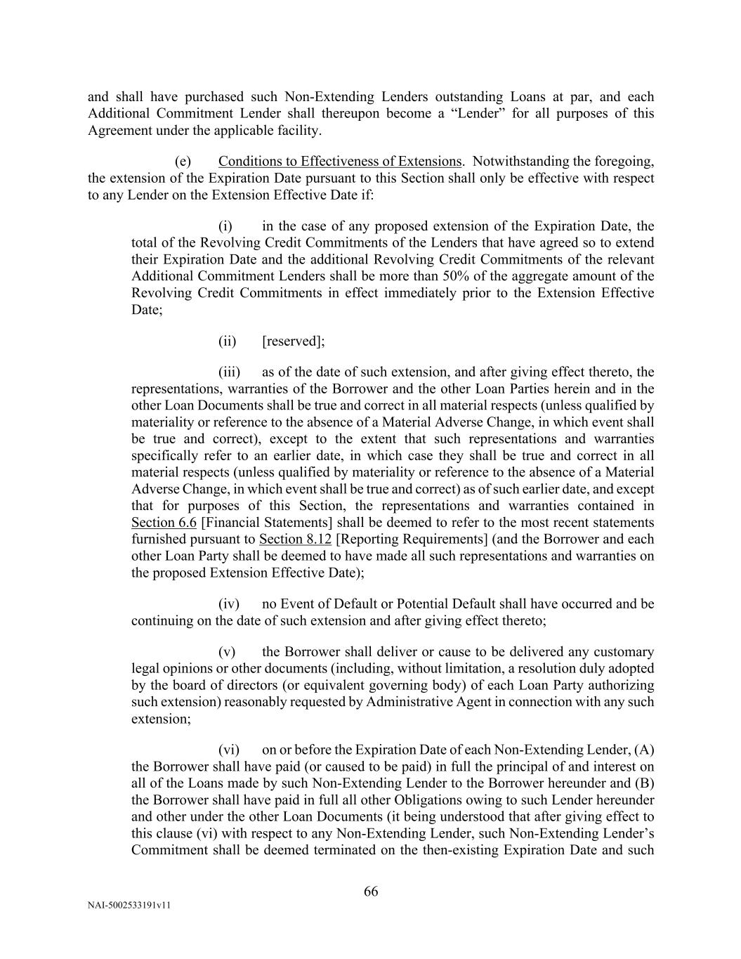 NAI-5002533191v11 66 and shall have purchased such Non-Extending Lenders outstanding Loans at par, and each Additional Commitment Lender shall thereupon become a “Lender” for all purposes of this Agreement under the applicable facility. (e) Conditions to Effectiveness of Extensions. Notwithstanding the foregoing, the extension of the Expiration Date pursuant to this Section shall only be effective with respect to any Lender on the Extension Effective Date if: (i) in the case of any proposed extension of the Expiration Date, the total of the Revolving Credit Commitments of the Lenders that have agreed so to extend their Expiration Date and the additional Revolving Credit Commitments of the relevant Additional Commitment Lenders shall be more than 50% of the aggregate amount of the Revolving Credit Commitments in effect immediately prior to the Extension Effective Date; (ii) [reserved]; (iii) as of the date of such extension, and after giving effect thereto, the representations, warranties of the Borrower and the other Loan Parties herein and in the other Loan Documents shall be true and correct in all material respects (unless qualified by materiality or reference to the absence of a Material Adverse Change, in which event shall be true and correct), except to the extent that such representations and warranties specifically refer to an earlier date, in which case they shall be true and correct in all material respects (unless qualified by materiality or reference to the absence of a Material Adverse Change, in which event shall be true and correct) as of such earlier date, and except that for purposes of this Section, the representations and warranties contained in Section 6.6 [Financial Statements] shall be deemed to refer to the most recent statements furnished pursuant to Section 8.12 [Reporting Requirements] (and the Borrower and each other Loan Party shall be deemed to have made all such representations and warranties on the proposed Extension Effective Date); (iv) no Event of Default or Potential Default shall have occurred and be continuing on the date of such extension and after giving effect thereto; (v) the Borrower shall deliver or cause to be delivered any customary legal opinions or other documents (including, without limitation, a resolution duly adopted by the board of directors (or equivalent governing body) of each Loan Party authorizing such extension) reasonably requested by Administrative Agent in connection with any such extension; (vi) on or before the Expiration Date of each Non-Extending Lender, (A) the Borrower shall have paid (or caused to be paid) in full the principal of and interest on all of the Loans made by such Non-Extending Lender to the Borrower hereunder and (B) the Borrower shall have paid in full all other Obligations owing to such Lender hereunder and other under the other Loan Documents (it being understood that after giving effect to this clause (vi) with respect to any Non-Extending Lender, such Non-Extending Lender’s Commitment shall be deemed terminated on the then-existing Expiration Date and such