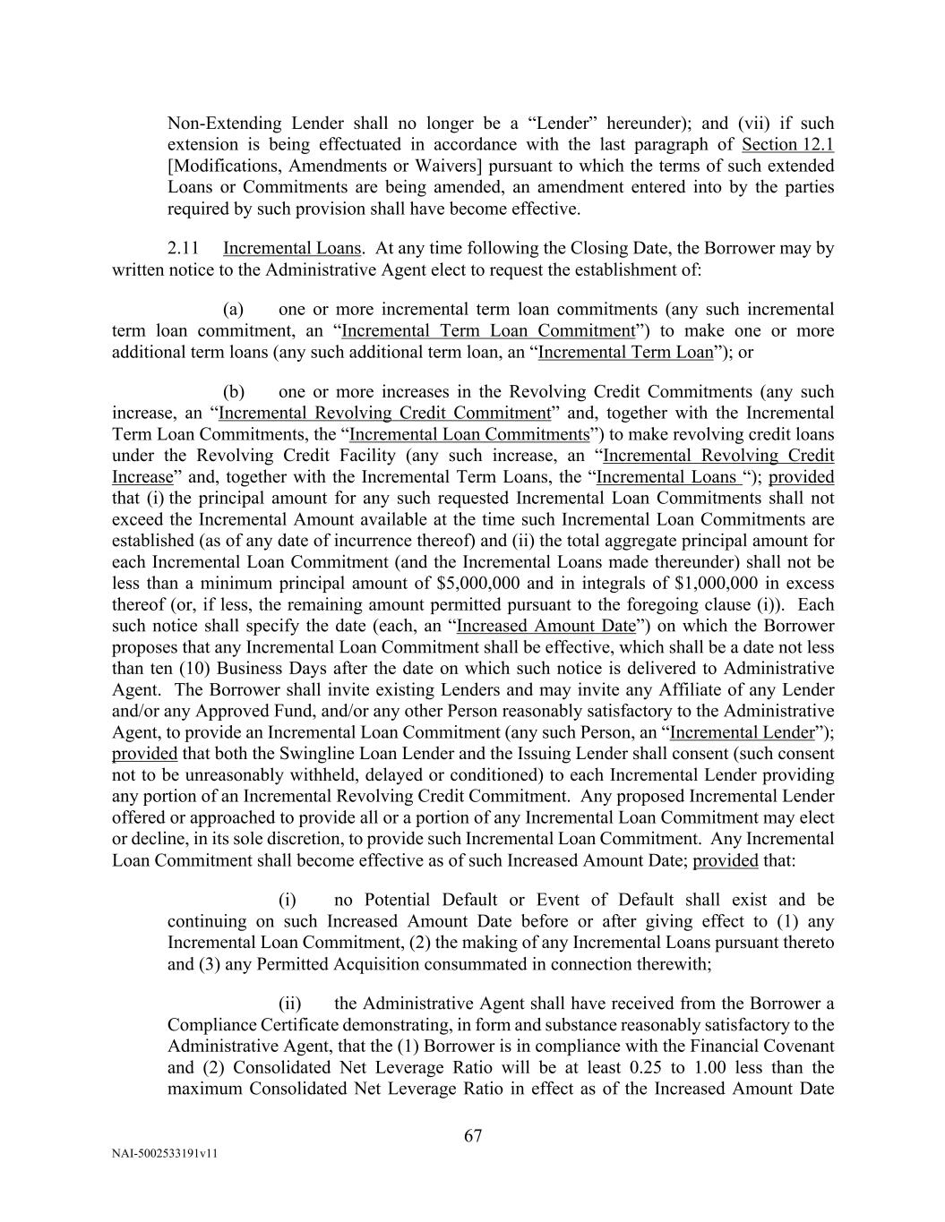 NAI-5002533191v11 67 Non-Extending Lender shall no longer be a “Lender” hereunder); and (vii) if such extension is being effectuated in accordance with the last paragraph of Section 12.1 [Modifications, Amendments or Waivers] pursuant to which the terms of such extended Loans or Commitments are being amended, an amendment entered into by the parties required by such provision shall have become effective. 2.11 Incremental Loans. At any time following the Closing Date, the Borrower may by written notice to the Administrative Agent elect to request the establishment of: (a) one or more incremental term loan commitments (any such incremental term loan commitment, an “Incremental Term Loan Commitment”) to make one or more additional term loans (any such additional term loan, an “Incremental Term Loan”); or (b) one or more increases in the Revolving Credit Commitments (any such increase, an “Incremental Revolving Credit Commitment” and, together with the Incremental Term Loan Commitments, the “Incremental Loan Commitments”) to make revolving credit loans under the Revolving Credit Facility (any such increase, an “Incremental Revolving Credit Increase” and, together with the Incremental Term Loans, the “Incremental Loans “); provided that (i) the principal amount for any such requested Incremental Loan Commitments shall not exceed the Incremental Amount available at the time such Incremental Loan Commitments are established (as of any date of incurrence thereof) and (ii) the total aggregate principal amount for each Incremental Loan Commitment (and the Incremental Loans made thereunder) shall not be less than a minimum principal amount of $5,000,000 and in integrals of $1,000,000 in excess thereof (or, if less, the remaining amount permitted pursuant to the foregoing clause (i)). Each such notice shall specify the date (each, an “Increased Amount Date”) on which the Borrower proposes that any Incremental Loan Commitment shall be effective, which shall be a date not less than ten (10) Business Days after the date on which such notice is delivered to Administrative Agent. The Borrower shall invite existing Lenders and may invite any Affiliate of any Lender and/or any Approved Fund, and/or any other Person reasonably satisfactory to the Administrative Agent, to provide an Incremental Loan Commitment (any such Person, an “Incremental Lender”); provided that both the Swingline Loan Lender and the Issuing Lender shall consent (such consent not to be unreasonably withheld, delayed or conditioned) to each Incremental Lender providing any portion of an Incremental Revolving Credit Commitment. Any proposed Incremental Lender offered or approached to provide all or a portion of any Incremental Loan Commitment may elect or decline, in its sole discretion, to provide such Incremental Loan Commitment. Any Incremental Loan Commitment shall become effective as of such Increased Amount Date; provided that: (i) no Potential Default or Event of Default shall exist and be continuing on such Increased Amount Date before or after giving effect to (1) any Incremental Loan Commitment, (2) the making of any Incremental Loans pursuant thereto and (3) any Permitted Acquisition consummated in connection therewith; (ii) the Administrative Agent shall have received from the Borrower a Compliance Certificate demonstrating, in form and substance reasonably satisfactory to the Administrative Agent, that the (1) Borrower is in compliance with the Financial Covenant and (2) Consolidated Net Leverage Ratio will be at least 0.25 to 1.00 less than the maximum Consolidated Net Leverage Ratio in effect as of the Increased Amount Date