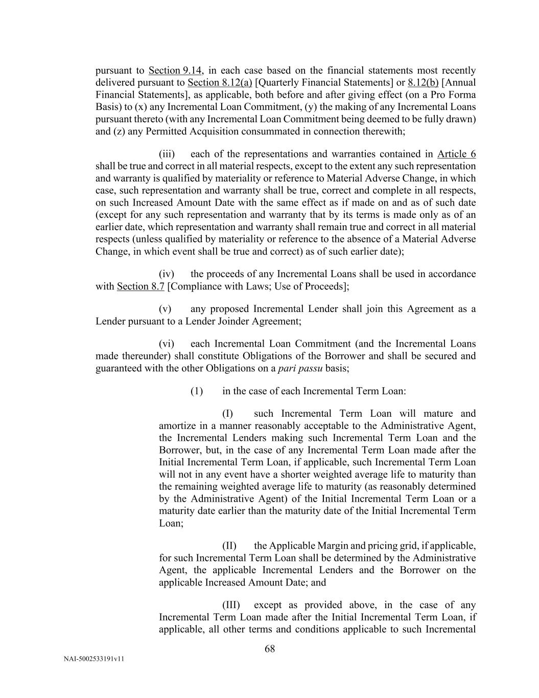NAI-5002533191v11 68 pursuant to Section 9.14, in each case based on the financial statements most recently delivered pursuant to Section 8.12(a) [Quarterly Financial Statements] or 8.12(b) [Annual Financial Statements], as applicable, both before and after giving effect (on a Pro Forma Basis) to (x) any Incremental Loan Commitment, (y) the making of any Incremental Loans pursuant thereto (with any Incremental Loan Commitment being deemed to be fully drawn) and (z) any Permitted Acquisition consummated in connection therewith; (iii) each of the representations and warranties contained in Article 6 shall be true and correct in all material respects, except to the extent any such representation and warranty is qualified by materiality or reference to Material Adverse Change, in which case, such representation and warranty shall be true, correct and complete in all respects, on such Increased Amount Date with the same effect as if made on and as of such date (except for any such representation and warranty that by its terms is made only as of an earlier date, which representation and warranty shall remain true and correct in all material respects (unless qualified by materiality or reference to the absence of a Material Adverse Change, in which event shall be true and correct) as of such earlier date); (iv) the proceeds of any Incremental Loans shall be used in accordance with Section 8.7 [Compliance with Laws; Use of Proceeds]; (v) any proposed Incremental Lender shall join this Agreement as a Lender pursuant to a Lender Joinder Agreement; (vi) each Incremental Loan Commitment (and the Incremental Loans made thereunder) shall constitute Obligations of the Borrower and shall be secured and guaranteed with the other Obligations on a pari passu basis; (1) in the case of each Incremental Term Loan: (I) such Incremental Term Loan will mature and amortize in a manner reasonably acceptable to the Administrative Agent, the Incremental Lenders making such Incremental Term Loan and the Borrower, but, in the case of any Incremental Term Loan made after the Initial Incremental Term Loan, if applicable, such Incremental Term Loan will not in any event have a shorter weighted average life to maturity than the remaining weighted average life to maturity (as reasonably determined by the Administrative Agent) of the Initial Incremental Term Loan or a maturity date earlier than the maturity date of the Initial Incremental Term Loan; (II) the Applicable Margin and pricing grid, if applicable, for such Incremental Term Loan shall be determined by the Administrative Agent, the applicable Incremental Lenders and the Borrower on the applicable Increased Amount Date; and (III) except as provided above, in the case of any Incremental Term Loan made after the Initial Incremental Term Loan, if applicable, all other terms and conditions applicable to such Incremental