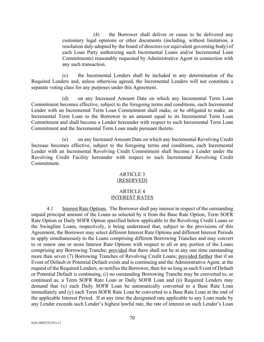 NAI-5002533191v11 70 (4) the Borrower shall deliver or cause to be delivered any customary legal opinions or other documents (including, without limitation, a resolution duly adopted by the board of directors (or equivalent governing body) of each Loan Party authorizing such Incremental Loans and/or Incremental Loan Commitments) reasonably requested by Administrative Agent in connection with any such transaction. (c) the Incremental Lenders shall be included in any determination of the Required Lenders and, unless otherwise agreed, the Incremental Lenders will not constitute a separate voting class for any purposes under this Agreement. (d) on any Increased Amount Date on which any Incremental Term Loan Commitment becomes effective, subject to the foregoing terms and conditions, each Incremental Lender with an Incremental Term Loan Commitment shall make, or be obligated to make, an Incremental Term Loan to the Borrower in an amount equal to its Incremental Term Loan Commitment and shall become a Lender hereunder with respect to such Incremental Term Loan Commitment and the Incremental Term Loan made pursuant thereto. (e) on any Increased Amount Date on which any Incremental Revolving Credit Increase becomes effective, subject to the foregoing terms and conditions, each Incremental Lender with an Incremental Revolving Credit Commitment shall become a Lender under the Revolving Credit Facility hereunder with respect to such Incremental Revolving Credit Commitment. ARTICLE 3 [RESERVED] ARTICLE 4 INTEREST RATES 4.1 Interest Rate Options. The Borrower shall pay interest in respect of the outstanding unpaid principal amount of the Loans as selected by it from the Base Rate Option, Term SOFR Rate Option or Daily SOFR Option specified below applicable to the Revolving Credit Loans or the Swingline Loans, respectively, it being understood that, subject to the provisions of this Agreement, the Borrower may select different Interest Rate Options and different Interest Periods to apply simultaneously to the Loans comprising different Borrowing Tranches and may convert to or renew one or more Interest Rate Options with respect to all or any portion of the Loans comprising any Borrowing Tranche; provided that there shall not be at any one time outstanding more than seven (7) Borrowing Tranches of Revolving Credit Loans; provided further that if an Event of Default or Potential Default exists and is continuing and the Administrative Agent, at the request of the Required Lenders, so notifies the Borrower, then for so long as such Event of Default or Potential Default is continuing, (i) no outstanding Borrowing Tranche may be converted to, or continued as, a Term SOFR Rate Loan or Daily SOFR Loan and (ii) Required Lenders may demand that (x) each Daily SOFR Loan be automatically converted to a Base Rate Loan immediately and (y) each Term SOFR Rate Loan be converted to a Base Rate Loan at the end of the applicable Interest Period. If at any time the designated rate applicable to any Loan made by any Lender exceeds such Lender’s highest lawful rate, the rate of interest on such Lender’s Loan
