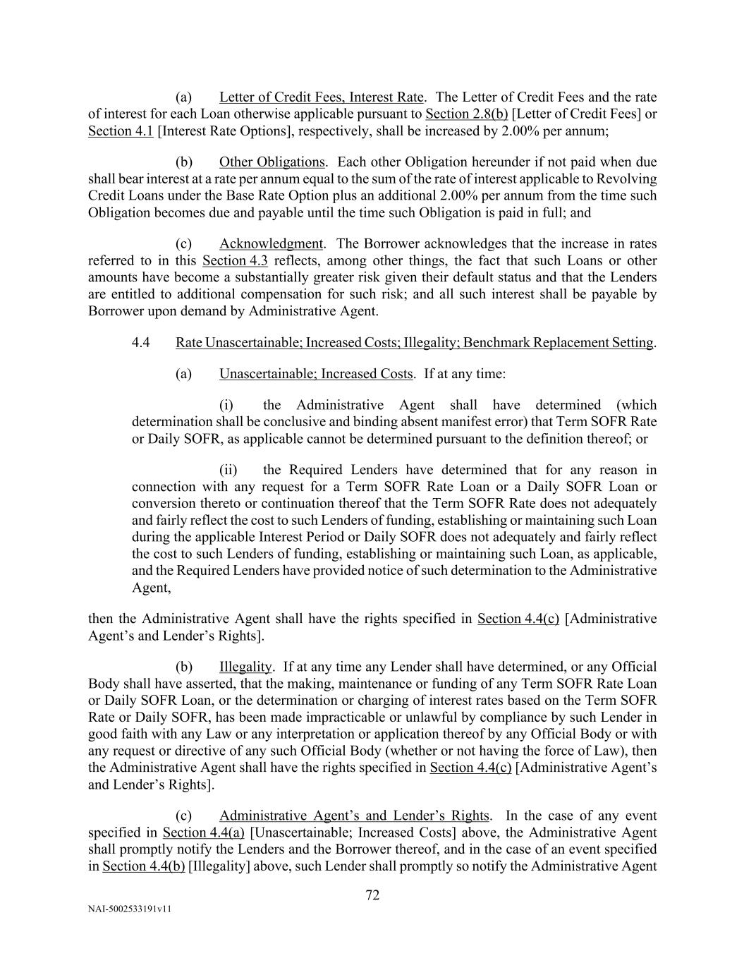 NAI-5002533191v11 72 (a) Letter of Credit Fees, Interest Rate. The Letter of Credit Fees and the rate of interest for each Loan otherwise applicable pursuant to Section 2.8(b) [Letter of Credit Fees] or Section 4.1 [Interest Rate Options], respectively, shall be increased by 2.00% per annum; (b) Other Obligations. Each other Obligation hereunder if not paid when due shall bear interest at a rate per annum equal to the sum of the rate of interest applicable to Revolving Credit Loans under the Base Rate Option plus an additional 2.00% per annum from the time such Obligation becomes due and payable until the time such Obligation is paid in full; and (c) Acknowledgment. The Borrower acknowledges that the increase in rates referred to in this Section 4.3 reflects, among other things, the fact that such Loans or other amounts have become a substantially greater risk given their default status and that the Lenders are entitled to additional compensation for such risk; and all such interest shall be payable by Borrower upon demand by Administrative Agent. 4.4 Rate Unascertainable; Increased Costs; Illegality; Benchmark Replacement Setting. (a) Unascertainable; Increased Costs. If at any time: (i) the Administrative Agent shall have determined (which determination shall be conclusive and binding absent manifest error) that Term SOFR Rate or Daily SOFR, as applicable cannot be determined pursuant to the definition thereof; or (ii) the Required Lenders have determined that for any reason in connection with any request for a Term SOFR Rate Loan or a Daily SOFR Loan or conversion thereto or continuation thereof that the Term SOFR Rate does not adequately and fairly reflect the cost to such Lenders of funding, establishing or maintaining such Loan during the applicable Interest Period or Daily SOFR does not adequately and fairly reflect the cost to such Lenders of funding, establishing or maintaining such Loan, as applicable, and the Required Lenders have provided notice of such determination to the Administrative Agent, then the Administrative Agent shall have the rights specified in Section 4.4(c) [Administrative Agent’s and Lender’s Rights]. (b) Illegality. If at any time any Lender shall have determined, or any Official Body shall have asserted, that the making, maintenance or funding of any Term SOFR Rate Loan or Daily SOFR Loan, or the determination or charging of interest rates based on the Term SOFR Rate or Daily SOFR, has been made impracticable or unlawful by compliance by such Lender in good faith with any Law or any interpretation or application thereof by any Official Body or with any request or directive of any such Official Body (whether or not having the force of Law), then the Administrative Agent shall have the rights specified in Section 4.4(c) [Administrative Agent’s and Lender’s Rights]. (c) Administrative Agent’s and Lender’s Rights. In the case of any event specified in Section 4.4(a) [Unascertainable; Increased Costs] above, the Administrative Agent shall promptly notify the Lenders and the Borrower thereof, and in the case of an event specified in Section 4.4(b) [Illegality] above, such Lender shall promptly so notify the Administrative Agent