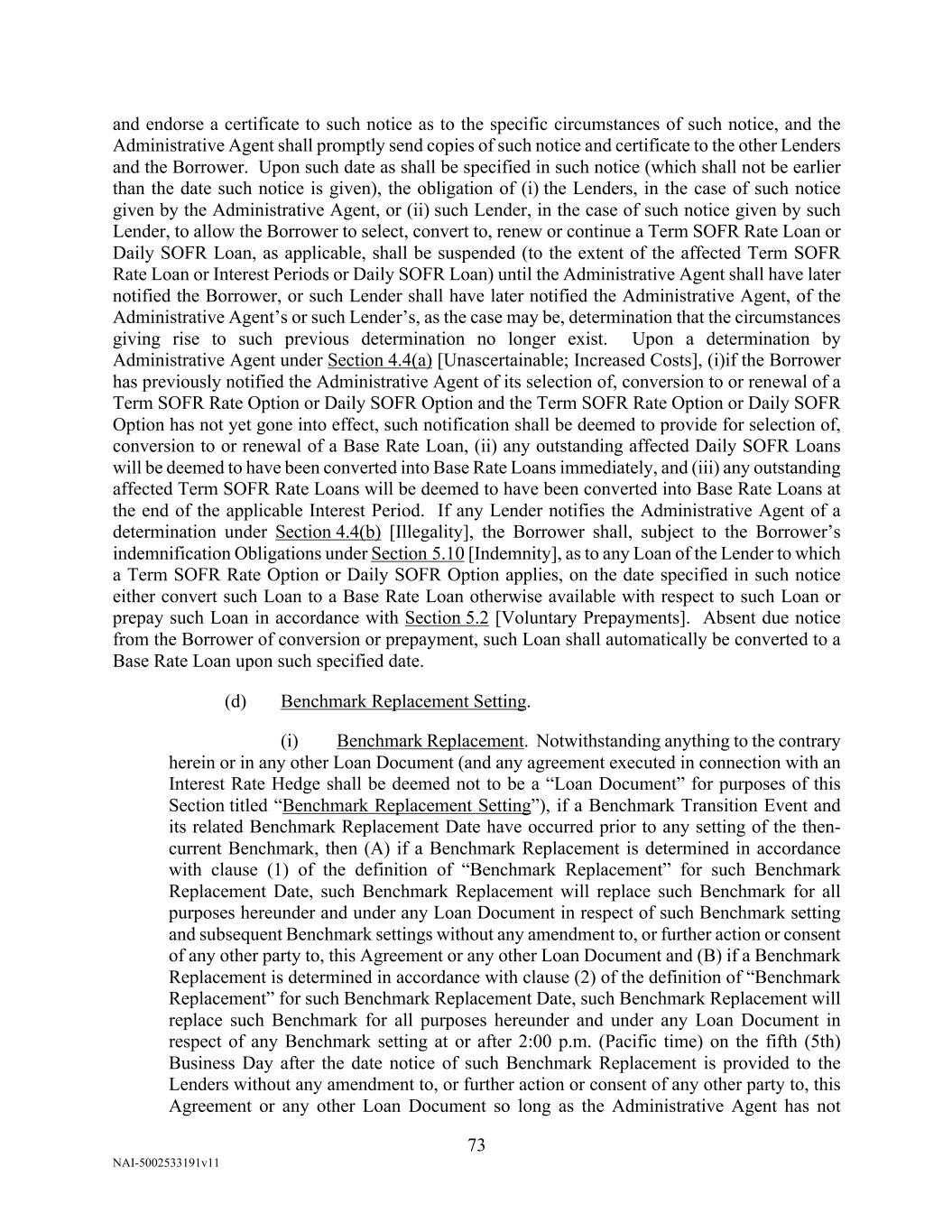 NAI-5002533191v11 73 and endorse a certificate to such notice as to the specific circumstances of such notice, and the Administrative Agent shall promptly send copies of such notice and certificate to the other Lenders and the Borrower. Upon such date as shall be specified in such notice (which shall not be earlier than the date such notice is given), the obligation of (i) the Lenders, in the case of such notice given by the Administrative Agent, or (ii) such Lender, in the case of such notice given by such Lender, to allow the Borrower to select, convert to, renew or continue a Term SOFR Rate Loan or Daily SOFR Loan, as applicable, shall be suspended (to the extent of the affected Term SOFR Rate Loan or Interest Periods or Daily SOFR Loan) until the Administrative Agent shall have later notified the Borrower, or such Lender shall have later notified the Administrative Agent, of the Administrative Agent’s or such Lender’s, as the case may be, determination that the circumstances giving rise to such previous determination no longer exist. Upon a determination by Administrative Agent under Section 4.4(a) [Unascertainable; Increased Costs], (i)if the Borrower has previously notified the Administrative Agent of its selection of, conversion to or renewal of a Term SOFR Rate Option or Daily SOFR Option and the Term SOFR Rate Option or Daily SOFR Option has not yet gone into effect, such notification shall be deemed to provide for selection of, conversion to or renewal of a Base Rate Loan, (ii) any outstanding affected Daily SOFR Loans will be deemed to have been converted into Base Rate Loans immediately, and (iii) any outstanding affected Term SOFR Rate Loans will be deemed to have been converted into Base Rate Loans at the end of the applicable Interest Period. If any Lender notifies the Administrative Agent of a determination under Section 4.4(b) [Illegality], the Borrower shall, subject to the Borrower’s indemnification Obligations under Section 5.10 [Indemnity], as to any Loan of the Lender to which a Term SOFR Rate Option or Daily SOFR Option applies, on the date specified in such notice either convert such Loan to a Base Rate Loan otherwise available with respect to such Loan or prepay such Loan in accordance with Section 5.2 [Voluntary Prepayments]. Absent due notice from the Borrower of conversion or prepayment, such Loan shall automatically be converted to a Base Rate Loan upon such specified date. (d) Benchmark Replacement Setting. (i) Benchmark Replacement. Notwithstanding anything to the contrary herein or in any other Loan Document (and any agreement executed in connection with an Interest Rate Hedge shall be deemed not to be a “Loan Document” for purposes of this Section titled “Benchmark Replacement Setting”), if a Benchmark Transition Event and its related Benchmark Replacement Date have occurred prior to any setting of the then- current Benchmark, then (A) if a Benchmark Replacement is determined in accordance with clause (1) of the definition of “Benchmark Replacement” for such Benchmark Replacement Date, such Benchmark Replacement will replace such Benchmark for all purposes hereunder and under any Loan Document in respect of such Benchmark setting and subsequent Benchmark settings without any amendment to, or further action or consent of any other party to, this Agreement or any other Loan Document and (B) if a Benchmark Replacement is determined in accordance with clause (2) of the definition of “Benchmark Replacement” for such Benchmark Replacement Date, such Benchmark Replacement will replace such Benchmark for all purposes hereunder and under any Loan Document in respect of any Benchmark setting at or after 2:00 p.m. (Pacific time) on the fifth (5th) Business Day after the date notice of such Benchmark Replacement is provided to the Lenders without any amendment to, or further action or consent of any other party to, this Agreement or any other Loan Document so long as the Administrative Agent has not