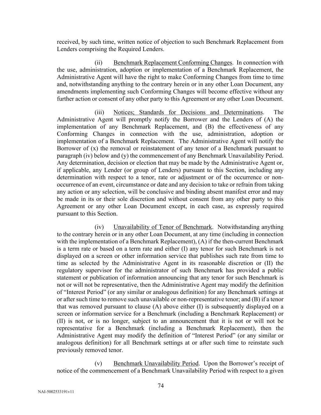 NAI-5002533191v11 74 received, by such time, written notice of objection to such Benchmark Replacement from Lenders comprising the Required Lenders. (ii) Benchmark Replacement Conforming Changes. In connection with the use, administration, adoption or implementation of a Benchmark Replacement, the Administrative Agent will have the right to make Conforming Changes from time to time and, notwithstanding anything to the contrary herein or in any other Loan Document, any amendments implementing such Conforming Changes will become effective without any further action or consent of any other party to this Agreement or any other Loan Document. (iii) Notices; Standards for Decisions and Determinations. The Administrative Agent will promptly notify the Borrower and the Lenders of (A) the implementation of any Benchmark Replacement, and (B) the effectiveness of any Conforming Changes in connection with the use, administration, adoption or implementation of a Benchmark Replacement. The Administrative Agent will notify the Borrower of (x) the removal or reinstatement of any tenor of a Benchmark pursuant to paragraph (iv) below and (y) the commencement of any Benchmark Unavailability Period. Any determination, decision or election that may be made by the Administrative Agent or, if applicable, any Lender (or group of Lenders) pursuant to this Section, including any determination with respect to a tenor, rate or adjustment or of the occurrence or non- occurrence of an event, circumstance or date and any decision to take or refrain from taking any action or any selection, will be conclusive and binding absent manifest error and may be made in its or their sole discretion and without consent from any other party to this Agreement or any other Loan Document except, in each case, as expressly required pursuant to this Section. (iv) Unavailability of Tenor of Benchmark. Notwithstanding anything to the contrary herein or in any other Loan Document, at any time (including in connection with the implementation of a Benchmark Replacement), (A) if the then-current Benchmark is a term rate or based on a term rate and either (I) any tenor for such Benchmark is not displayed on a screen or other information service that publishes such rate from time to time as selected by the Administrative Agent in its reasonable discretion or (II) the regulatory supervisor for the administrator of such Benchmark has provided a public statement or publication of information announcing that any tenor for such Benchmark is not or will not be representative, then the Administrative Agent may modify the definition of “Interest Period” (or any similar or analogous definition) for any Benchmark settings at or after such time to remove such unavailable or non-representative tenor; and (B) if a tenor that was removed pursuant to clause (A) above either (I) is subsequently displayed on a screen or information service for a Benchmark (including a Benchmark Replacement) or (II) is not, or is no longer, subject to an announcement that it is not or will not be representative for a Benchmark (including a Benchmark Replacement), then the Administrative Agent may modify the definition of “Interest Period” (or any similar or analogous definition) for all Benchmark settings at or after such time to reinstate such previously removed tenor. (v) Benchmark Unavailability Period. Upon the Borrower’s receipt of notice of the commencement of a Benchmark Unavailability Period with respect to a given