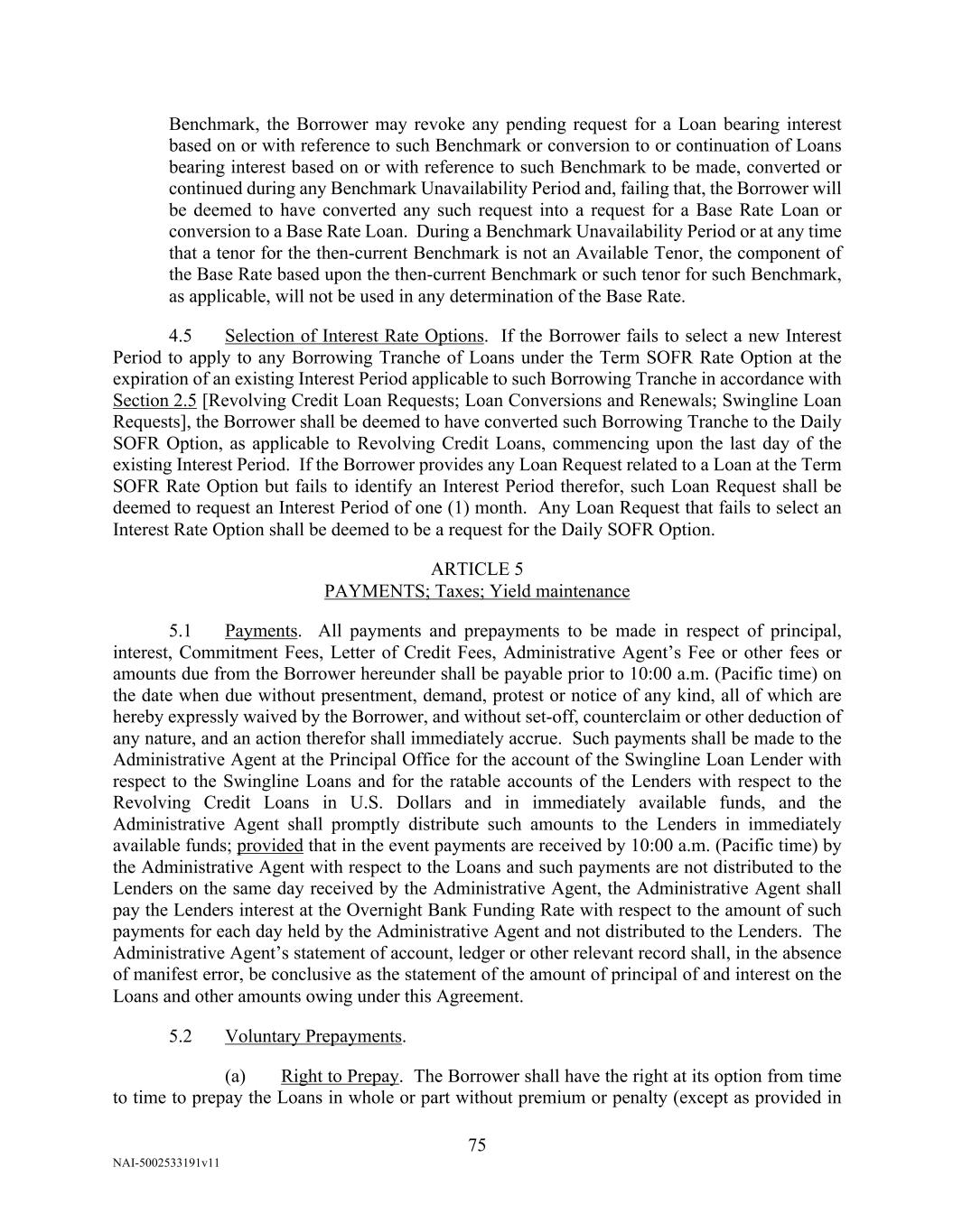 NAI-5002533191v11 75 Benchmark, the Borrower may revoke any pending request for a Loan bearing interest based on or with reference to such Benchmark or conversion to or continuation of Loans bearing interest based on or with reference to such Benchmark to be made, converted or continued during any Benchmark Unavailability Period and, failing that, the Borrower will be deemed to have converted any such request into a request for a Base Rate Loan or conversion to a Base Rate Loan. During a Benchmark Unavailability Period or at any time that a tenor for the then-current Benchmark is not an Available Tenor, the component of the Base Rate based upon the then-current Benchmark or such tenor for such Benchmark, as applicable, will not be used in any determination of the Base Rate. 4.5 Selection of Interest Rate Options. If the Borrower fails to select a new Interest Period to apply to any Borrowing Tranche of Loans under the Term SOFR Rate Option at the expiration of an existing Interest Period applicable to such Borrowing Tranche in accordance with Section 2.5 [Revolving Credit Loan Requests; Loan Conversions and Renewals; Swingline Loan Requests], the Borrower shall be deemed to have converted such Borrowing Tranche to the Daily SOFR Option, as applicable to Revolving Credit Loans, commencing upon the last day of the existing Interest Period. If the Borrower provides any Loan Request related to a Loan at the Term SOFR Rate Option but fails to identify an Interest Period therefor, such Loan Request shall be deemed to request an Interest Period of one (1) month. Any Loan Request that fails to select an Interest Rate Option shall be deemed to be a request for the Daily SOFR Option. ARTICLE 5 PAYMENTS; Taxes; Yield maintenance 5.1 Payments. All payments and prepayments to be made in respect of principal, interest, Commitment Fees, Letter of Credit Fees, Administrative Agent’s Fee or other fees or amounts due from the Borrower hereunder shall be payable prior to 10:00 a.m. (Pacific time) on the date when due without presentment, demand, protest or notice of any kind, all of which are hereby expressly waived by the Borrower, and without set-off, counterclaim or other deduction of any nature, and an action therefor shall immediately accrue. Such payments shall be made to the Administrative Agent at the Principal Office for the account of the Swingline Loan Lender with respect to the Swingline Loans and for the ratable accounts of the Lenders with respect to the Revolving Credit Loans in U.S. Dollars and in immediately available funds, and the Administrative Agent shall promptly distribute such amounts to the Lenders in immediately available funds; provided that in the event payments are received by 10:00 a.m. (Pacific time) by the Administrative Agent with respect to the Loans and such payments are not distributed to the Lenders on the same day received by the Administrative Agent, the Administrative Agent shall pay the Lenders interest at the Overnight Bank Funding Rate with respect to the amount of such payments for each day held by the Administrative Agent and not distributed to the Lenders. The Administrative Agent’s statement of account, ledger or other relevant record shall, in the absence of manifest error, be conclusive as the statement of the amount of principal of and interest on the Loans and other amounts owing under this Agreement. 5.2 Voluntary Prepayments. (a) Right to Prepay. The Borrower shall have the right at its option from time to time to prepay the Loans in whole or part without premium or penalty (except as provided in
