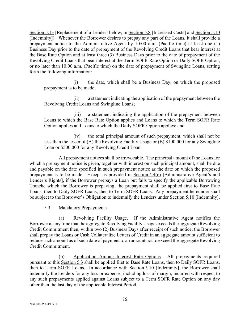 NAI-5002533191v11 76 Section 5.13 [Replacement of a Lender] below, in Section 5.8 [Increased Costs] and Section 5.10 [Indemnity]). Whenever the Borrower desires to prepay any part of the Loans, it shall provide a prepayment notice to the Administrative Agent by 10:00 a.m. (Pacific time) at least one (1) Business Day prior to the date of prepayment of the Revolving Credit Loans that bear interest at the Base Rate Option and at least three (3) Business Days prior to the date of prepayment of the Revolving Credit Loans that bear interest at the Term SOFR Rate Option or Daily SOFR Option, or no later than 10:00 a.m. (Pacific time) on the date of prepayment of Swingline Loans, setting forth the following information: (i) the date, which shall be a Business Day, on which the proposed prepayment is to be made; (ii) a statement indicating the application of the prepayment between the Revolving Credit Loans and Swingline Loans; (iii) a statement indicating the application of the prepayment between Loans to which the Base Rate Option applies and Loans to which the Term SOFR Rate Option applies and Loans to which the Daily SOFR Option applies; and (iv) the total principal amount of such prepayment, which shall not be less than the lesser of (A) the Revolving Facility Usage or (B) $100,000 for any Swingline Loan or $500,000 for any Revolving Credit Loan. All prepayment notices shall be irrevocable. The principal amount of the Loans for which a prepayment notice is given, together with interest on such principal amount, shall be due and payable on the date specified in such prepayment notice as the date on which the proposed prepayment is to be made. Except as provided in Section 4.4(c) [Administrative Agent’s and Lender’s Rights], if the Borrower prepays a Loan but fails to specify the applicable Borrowing Tranche which the Borrower is prepaying, the prepayment shall be applied first to Base Rate Loans, then to Daily SOFR Loans, then to Term SOFR Loans. Any prepayment hereunder shall be subject to the Borrower’s Obligation to indemnify the Lenders under Section 5.10 [Indemnity]. 5.3 Mandatory Prepayments. (a) Revolving Facility Usage. If the Administrative Agent notifies the Borrower at any time that the aggregate Revolving Facility Usage exceeds the aggregate Revolving Credit Commitment then, within two (2) Business Days after receipt of such notice, the Borrower shall prepay the Loans or Cash Collateralize Letters of Credit in an aggregate amount sufficient to reduce such amount as of such date of payment to an amount not to exceed the aggregate Revolving Credit Commitment. (b) Application Among Interest Rate Options. All prepayments required pursuant to this Section 5.3 shall be applied first to Base Rate Loans, then to Daily SOFR Loans, then to Term SOFR Loans. In accordance with Section 5.10 [Indemnity], the Borrower shall indemnify the Lenders for any loss or expense, including loss of margin, incurred with respect to any such prepayments applied against Loans subject to a Term SOFR Rate Option on any day other than the last day of the applicable Interest Period.