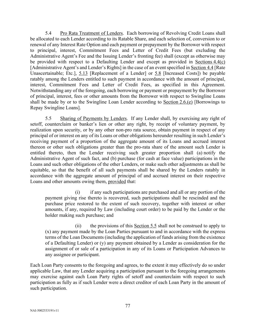 NAI-5002533191v11 77 5.4 Pro Rata Treatment of Lenders. Each borrowing of Revolving Credit Loans shall be allocated to each Lender according to its Ratable Share, and each selection of, conversion to or renewal of any Interest Rate Option and each payment or prepayment by the Borrower with respect to principal, interest, Commitment Fees and Letter of Credit Fees (but excluding the Administrative Agent’s Fee and the Issuing Lender’s fronting fee) shall (except as otherwise may be provided with respect to a Defaulting Lender and except as provided in Sections 4.4(c) [Administrative Agent’s and Lender’s Rights] in the case of an event specified in Section 4.4 [Rate Unascertainable; Etc.], 5.13 [Replacement of a Lender] or 5.8 [Increased Costs]) be payable ratably among the Lenders entitled to such payment in accordance with the amount of principal, interest, Commitment Fees and Letter of Credit Fees, as specified in this Agreement. Notwithstanding any of the foregoing, each borrowing or payment or prepayment by the Borrower of principal, interest, fees or other amounts from the Borrower with respect to Swingline Loans shall be made by or to the Swingline Loan Lender according to Section 2.6.(e) [Borrowings to Repay Swingline Loans]. 5.5 Sharing of Payments by Lenders. If any Lender shall, by exercising any right of setoff, counterclaim or banker’s lien or other any right, by receipt of voluntary payment, by realization upon security, or by any other non-pro rata source, obtain payment in respect of any principal of or interest on any of its Loans or other obligations hereunder resulting in such Lender’s receiving payment of a proportion of the aggregate amount of its Loans and accrued interest thereon or other such obligations greater than the pro-rata share of the amount such Lender is entitled thereto, then the Lender receiving such greater proportion shall (a) notify the Administrative Agent of such fact, and (b) purchase (for cash at face value) participations in the Loans and such other obligations of the other Lenders, or make such other adjustments as shall be equitable, so that the benefit of all such payments shall be shared by the Lenders ratably in accordance with the aggregate amount of principal of and accrued interest on their respective Loans and other amounts owing them, provided that: (i) if any such participations are purchased and all or any portion of the payment giving rise thereto is recovered, such participations shall be rescinded and the purchase price restored to the extent of such recovery, together with interest or other amounts, if any, required by Law (including court order) to be paid by the Lender or the holder making such purchase; and (ii) the provisions of this Section 5.5 shall not be construed to apply to (x) any payment made by the Loan Parties pursuant to and in accordance with the express terms of the Loan Documents (including the application of funds arising from the existence of a Defaulting Lender) or (y) any payment obtained by a Lender as consideration for the assignment of or sale of a participation in any of its Loans or Participation Advances to any assignee or participant. Each Loan Party consents to the foregoing and agrees, to the extent it may effectively do so under applicable Law, that any Lender acquiring a participation pursuant to the foregoing arrangements may exercise against each Loan Party rights of setoff and counterclaim with respect to such participation as fully as if such Lender were a direct creditor of each Loan Party in the amount of such participation.