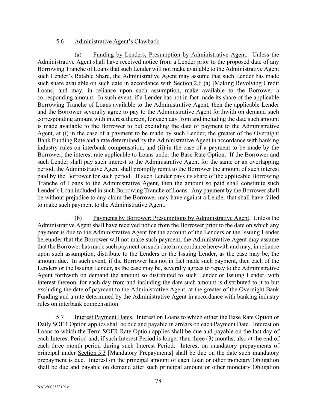 NAI-5002533191v11 78 5.6 Administrative Agent’s Clawback. (a) Funding by Lenders; Presumption by Administrative Agent. Unless the Administrative Agent shall have received notice from a Lender prior to the proposed date of any Borrowing Tranche of Loans that such Lender will not make available to the Administrative Agent such Lender’s Ratable Share, the Administrative Agent may assume that such Lender has made such share available on such date in accordance with Section 2.6 (a) [Making Revolving Credit Loans] and may, in reliance upon such assumption, make available to the Borrower a corresponding amount. In such event, if a Lender has not in fact made its share of the applicable Borrowing Tranche of Loans available to the Administrative Agent, then the applicable Lender and the Borrower severally agree to pay to the Administrative Agent forthwith on demand such corresponding amount with interest thereon, for each day from and including the date such amount is made available to the Borrower to but excluding the date of payment to the Administrative Agent, at (i) in the case of a payment to be made by such Lender, the greater of the Overnight Bank Funding Rate and a rate determined by the Administrative Agent in accordance with banking industry rules on interbank compensation, and (ii) in the case of a payment to be made by the Borrower, the interest rate applicable to Loans under the Base Rate Option. If the Borrower and such Lender shall pay such interest to the Administrative Agent for the same or an overlapping period, the Administrative Agent shall promptly remit to the Borrower the amount of such interest paid by the Borrower for such period. If such Lender pays its share of the applicable Borrowing Tranche of Loans to the Administrative Agent, then the amount so paid shall constitute such Lender’s Loan included in such Borrowing Tranche of Loans. Any payment by the Borrower shall be without prejudice to any claim the Borrower may have against a Lender that shall have failed to make such payment to the Administrative Agent. (b) Payments by Borrower; Presumptions by Administrative Agent. Unless the Administrative Agent shall have received notice from the Borrower prior to the date on which any payment is due to the Administrative Agent for the account of the Lenders or the Issuing Lender hereunder that the Borrower will not make such payment, the Administrative Agent may assume that the Borrower has made such payment on such date in accordance herewith and may, in reliance upon such assumption, distribute to the Lenders or the Issuing Lender, as the case may be, the amount due. In such event, if the Borrower has not in fact made such payment, then each of the Lenders or the Issuing Lender, as the case may be, severally agrees to repay to the Administrative Agent forthwith on demand the amount so distributed to such Lender or Issuing Lender, with interest thereon, for each day from and including the date such amount is distributed to it to but excluding the date of payment to the Administrative Agent, at the greater of the Overnight Bank Funding and a rate determined by the Administrative Agent in accordance with banking industry rules on interbank compensation. 5.7 Interest Payment Dates. Interest on Loans to which either the Base Rate Option or Daily SOFR Option applies shall be due and payable in arrears on each Payment Date. Interest on Loans to which the Term SOFR Rate Option applies shall be due and payable on the last day of each Interest Period and, if such Interest Period is longer than three (3) months, also at the end of each three month period during such Interest Period. Interest on mandatory prepayments of principal under Section 5.3 [Mandatory Prepayments] shall be due on the date such mandatory prepayment is due. Interest on the principal amount of each Loan or other monetary Obligation shall be due and payable on demand after such principal amount or other monetary Obligation