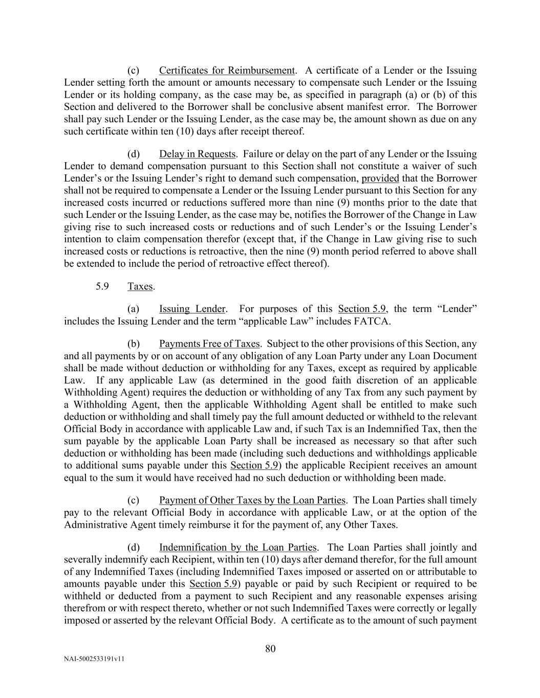 NAI-5002533191v11 80 (c) Certificates for Reimbursement. A certificate of a Lender or the Issuing Lender setting forth the amount or amounts necessary to compensate such Lender or the Issuing Lender or its holding company, as the case may be, as specified in paragraph (a) or (b) of this Section and delivered to the Borrower shall be conclusive absent manifest error. The Borrower shall pay such Lender or the Issuing Lender, as the case may be, the amount shown as due on any such certificate within ten (10) days after receipt thereof. (d) Delay in Requests. Failure or delay on the part of any Lender or the Issuing Lender to demand compensation pursuant to this Section shall not constitute a waiver of such Lender’s or the Issuing Lender’s right to demand such compensation, provided that the Borrower shall not be required to compensate a Lender or the Issuing Lender pursuant to this Section for any increased costs incurred or reductions suffered more than nine (9) months prior to the date that such Lender or the Issuing Lender, as the case may be, notifies the Borrower of the Change in Law giving rise to such increased costs or reductions and of such Lender’s or the Issuing Lender’s intention to claim compensation therefor (except that, if the Change in Law giving rise to such increased costs or reductions is retroactive, then the nine (9) month period referred to above shall be extended to include the period of retroactive effect thereof). 5.9 Taxes. (a) Issuing Lender. For purposes of this Section 5.9, the term “Lender” includes the Issuing Lender and the term “applicable Law” includes FATCA. (b) Payments Free of Taxes. Subject to the other provisions of this Section, any and all payments by or on account of any obligation of any Loan Party under any Loan Document shall be made without deduction or withholding for any Taxes, except as required by applicable Law. If any applicable Law (as determined in the good faith discretion of an applicable Withholding Agent) requires the deduction or withholding of any Tax from any such payment by a Withholding Agent, then the applicable Withholding Agent shall be entitled to make such deduction or withholding and shall timely pay the full amount deducted or withheld to the relevant Official Body in accordance with applicable Law and, if such Tax is an Indemnified Tax, then the sum payable by the applicable Loan Party shall be increased as necessary so that after such deduction or withholding has been made (including such deductions and withholdings applicable to additional sums payable under this Section 5.9) the applicable Recipient receives an amount equal to the sum it would have received had no such deduction or withholding been made. (c) Payment of Other Taxes by the Loan Parties. The Loan Parties shall timely pay to the relevant Official Body in accordance with applicable Law, or at the option of the Administrative Agent timely reimburse it for the payment of, any Other Taxes. (d) Indemnification by the Loan Parties. The Loan Parties shall jointly and severally indemnify each Recipient, within ten (10) days after demand therefor, for the full amount of any Indemnified Taxes (including Indemnified Taxes imposed or asserted on or attributable to amounts payable under this Section 5.9) payable or paid by such Recipient or required to be withheld or deducted from a payment to such Recipient and any reasonable expenses arising therefrom or with respect thereto, whether or not such Indemnified Taxes were correctly or legally imposed or asserted by the relevant Official Body. A certificate as to the amount of such payment