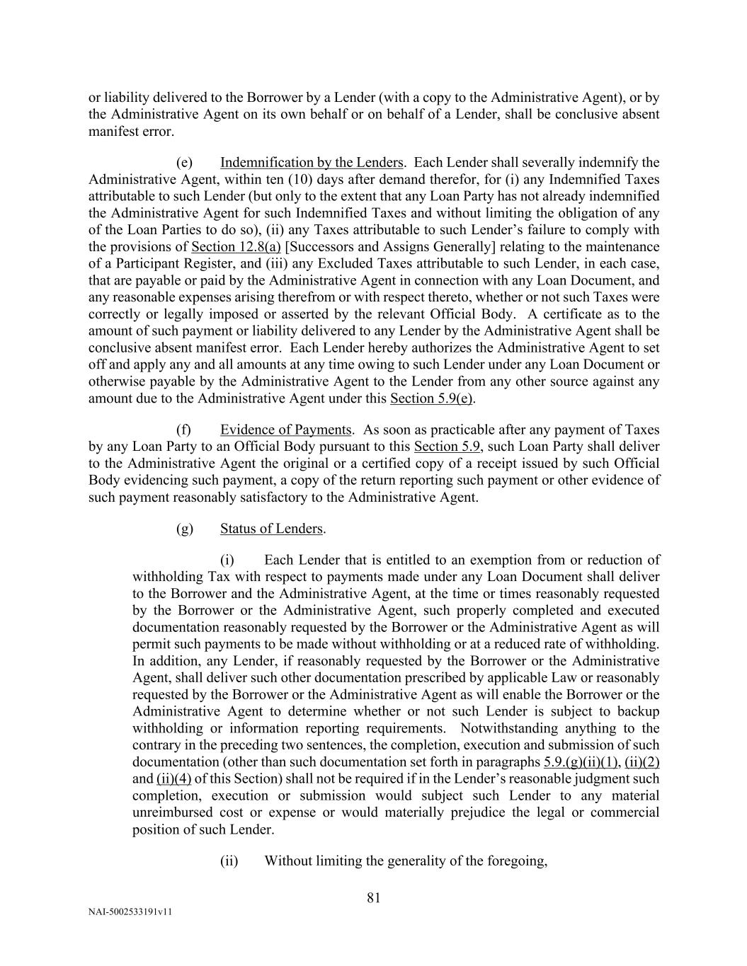 NAI-5002533191v11 81 or liability delivered to the Borrower by a Lender (with a copy to the Administrative Agent), or by the Administrative Agent on its own behalf or on behalf of a Lender, shall be conclusive absent manifest error. (e) Indemnification by the Lenders. Each Lender shall severally indemnify the Administrative Agent, within ten (10) days after demand therefor, for (i) any Indemnified Taxes attributable to such Lender (but only to the extent that any Loan Party has not already indemnified the Administrative Agent for such Indemnified Taxes and without limiting the obligation of any of the Loan Parties to do so), (ii) any Taxes attributable to such Lender’s failure to comply with the provisions of Section 12.8(a) [Successors and Assigns Generally] relating to the maintenance of a Participant Register, and (iii) any Excluded Taxes attributable to such Lender, in each case, that are payable or paid by the Administrative Agent in connection with any Loan Document, and any reasonable expenses arising therefrom or with respect thereto, whether or not such Taxes were correctly or legally imposed or asserted by the relevant Official Body. A certificate as to the amount of such payment or liability delivered to any Lender by the Administrative Agent shall be conclusive absent manifest error. Each Lender hereby authorizes the Administrative Agent to set off and apply any and all amounts at any time owing to such Lender under any Loan Document or otherwise payable by the Administrative Agent to the Lender from any other source against any amount due to the Administrative Agent under this Section 5.9(e). (f) Evidence of Payments. As soon as practicable after any payment of Taxes by any Loan Party to an Official Body pursuant to this Section 5.9, such Loan Party shall deliver to the Administrative Agent the original or a certified copy of a receipt issued by such Official Body evidencing such payment, a copy of the return reporting such payment or other evidence of such payment reasonably satisfactory to the Administrative Agent. (g) Status of Lenders. (i) Each Lender that is entitled to an exemption from or reduction of withholding Tax with respect to payments made under any Loan Document shall deliver to the Borrower and the Administrative Agent, at the time or times reasonably requested by the Borrower or the Administrative Agent, such properly completed and executed documentation reasonably requested by the Borrower or the Administrative Agent as will permit such payments to be made without withholding or at a reduced rate of withholding. In addition, any Lender, if reasonably requested by the Borrower or the Administrative Agent, shall deliver such other documentation prescribed by applicable Law or reasonably requested by the Borrower or the Administrative Agent as will enable the Borrower or the Administrative Agent to determine whether or not such Lender is subject to backup withholding or information reporting requirements. Notwithstanding anything to the contrary in the preceding two sentences, the completion, execution and submission of such documentation (other than such documentation set forth in paragraphs 5.9.(g)(ii)(1), (ii)(2) and (ii)(4) of this Section) shall not be required if in the Lender’s reasonable judgment such completion, execution or submission would subject such Lender to any material unreimbursed cost or expense or would materially prejudice the legal or commercial position of such Lender. (ii) Without limiting the generality of the foregoing,