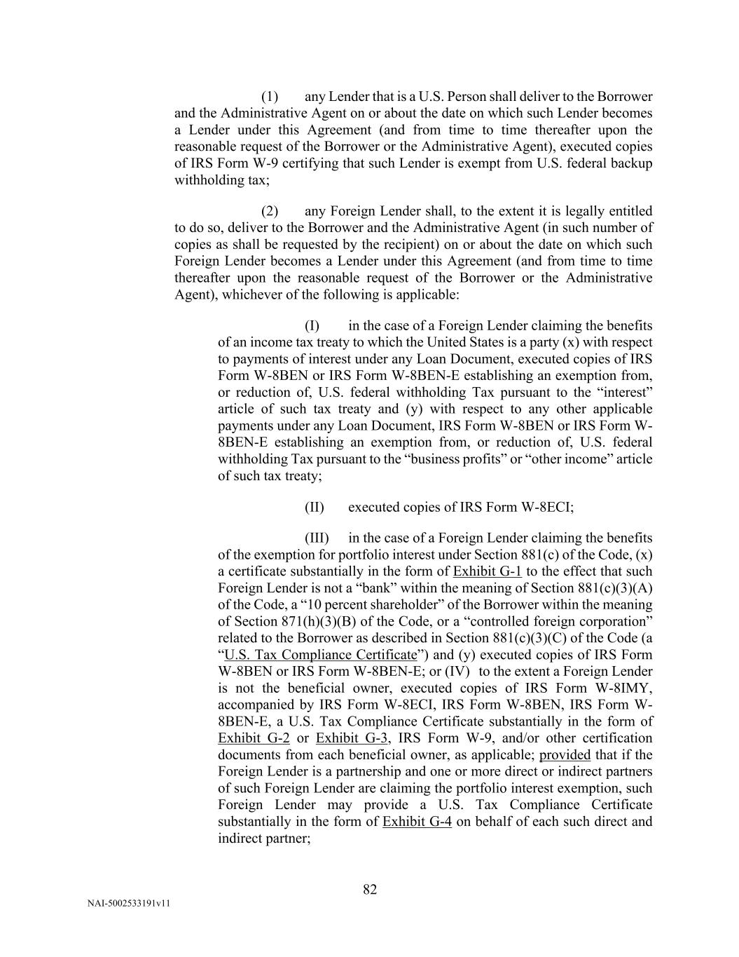 NAI-5002533191v11 82 (1) any Lender that is a U.S. Person shall deliver to the Borrower and the Administrative Agent on or about the date on which such Lender becomes a Lender under this Agreement (and from time to time thereafter upon the reasonable request of the Borrower or the Administrative Agent), executed copies of IRS Form W-9 certifying that such Lender is exempt from U.S. federal backup withholding tax; (2) any Foreign Lender shall, to the extent it is legally entitled to do so, deliver to the Borrower and the Administrative Agent (in such number of copies as shall be requested by the recipient) on or about the date on which such Foreign Lender becomes a Lender under this Agreement (and from time to time thereafter upon the reasonable request of the Borrower or the Administrative Agent), whichever of the following is applicable: (I) in the case of a Foreign Lender claiming the benefits of an income tax treaty to which the United States is a party (x) with respect to payments of interest under any Loan Document, executed copies of IRS Form W-8BEN or IRS Form W-8BEN-E establishing an exemption from, or reduction of, U.S. federal withholding Tax pursuant to the “interest” article of such tax treaty and (y) with respect to any other applicable payments under any Loan Document, IRS Form W-8BEN or IRS Form W- 8BEN-E establishing an exemption from, or reduction of, U.S. federal withholding Tax pursuant to the “business profits” or “other income” article of such tax treaty; (II) executed copies of IRS Form W-8ECI; (III) in the case of a Foreign Lender claiming the benefits of the exemption for portfolio interest under Section 881(c) of the Code, (x) a certificate substantially in the form of Exhibit G-1 to the effect that such Foreign Lender is not a “bank” within the meaning of Section 881(c)(3)(A) of the Code, a “10 percent shareholder” of the Borrower within the meaning of Section 871(h)(3)(B) of the Code, or a “controlled foreign corporation” related to the Borrower as described in Section 881(c)(3)(C) of the Code (a “U.S. Tax Compliance Certificate”) and (y) executed copies of IRS Form W-8BEN or IRS Form W-8BEN-E; or (IV) to the extent a Foreign Lender is not the beneficial owner, executed copies of IRS Form W-8IMY, accompanied by IRS Form W-8ECI, IRS Form W-8BEN, IRS Form W- 8BEN-E, a U.S. Tax Compliance Certificate substantially in the form of Exhibit G-2 or Exhibit G-3, IRS Form W-9, and/or other certification documents from each beneficial owner, as applicable; provided that if the Foreign Lender is a partnership and one or more direct or indirect partners of such Foreign Lender are claiming the portfolio interest exemption, such Foreign Lender may provide a U.S. Tax Compliance Certificate substantially in the form of Exhibit G-4 on behalf of each such direct and indirect partner;