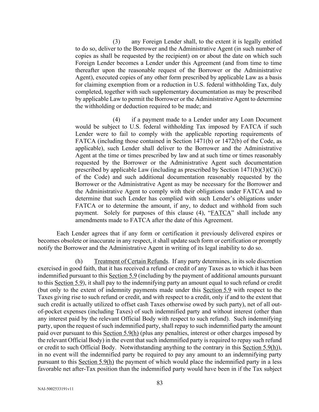 NAI-5002533191v11 83 (3) any Foreign Lender shall, to the extent it is legally entitled to do so, deliver to the Borrower and the Administrative Agent (in such number of copies as shall be requested by the recipient) on or about the date on which such Foreign Lender becomes a Lender under this Agreement (and from time to time thereafter upon the reasonable request of the Borrower or the Administrative Agent), executed copies of any other form prescribed by applicable Law as a basis for claiming exemption from or a reduction in U.S. federal withholding Tax, duly completed, together with such supplementary documentation as may be prescribed by applicable Law to permit the Borrower or the Administrative Agent to determine the withholding or deduction required to be made; and (4) if a payment made to a Lender under any Loan Document would be subject to U.S. federal withholding Tax imposed by FATCA if such Lender were to fail to comply with the applicable reporting requirements of FATCA (including those contained in Section 1471(b) or 1472(b) of the Code, as applicable), such Lender shall deliver to the Borrower and the Administrative Agent at the time or times prescribed by law and at such time or times reasonably requested by the Borrower or the Administrative Agent such documentation prescribed by applicable Law (including as prescribed by Section 1471(b)(3)(C)(i) of the Code) and such additional documentation reasonably requested by the Borrower or the Administrative Agent as may be necessary for the Borrower and the Administrative Agent to comply with their obligations under FATCA and to determine that such Lender has complied with such Lender’s obligations under FATCA or to determine the amount, if any, to deduct and withhold from such payment. Solely for purposes of this clause (4), “FATCA” shall include any amendments made to FATCA after the date of this Agreement. Each Lender agrees that if any form or certification it previously delivered expires or becomes obsolete or inaccurate in any respect, it shall update such form or certification or promptly notify the Borrower and the Administrative Agent in writing of its legal inability to do so. (h) Treatment of Certain Refunds. If any party determines, in its sole discretion exercised in good faith, that it has received a refund or credit of any Taxes as to which it has been indemnified pursuant to this Section 5.9 (including by the payment of additional amounts pursuant to this Section 5.9), it shall pay to the indemnifying party an amount equal to such refund or credit (but only to the extent of indemnity payments made under this Section 5.9 with respect to the Taxes giving rise to such refund or credit, and with respect to a credit, only if and to the extent that such credit is actually utilized to offset cash Taxes otherwise owed by such party), net of all out- of-pocket expenses (including Taxes) of such indemnified party and without interest (other than any interest paid by the relevant Official Body with respect to such refund). Such indemnifying party, upon the request of such indemnified party, shall repay to such indemnified party the amount paid over pursuant to this Section 5.9(h) (plus any penalties, interest or other charges imposed by the relevant Official Body) in the event that such indemnified party is required to repay such refund or credit to such Official Body. Notwithstanding anything to the contrary in this Section 5.9(h)), in no event will the indemnified party be required to pay any amount to an indemnifying party pursuant to this Section 5.9(h) the payment of which would place the indemnified party in a less favorable net after-Tax position than the indemnified party would have been in if the Tax subject