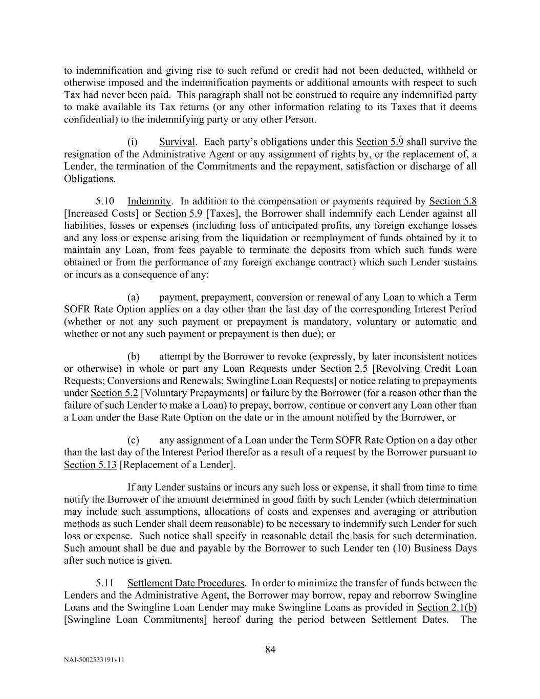 NAI-5002533191v11 84 to indemnification and giving rise to such refund or credit had not been deducted, withheld or otherwise imposed and the indemnification payments or additional amounts with respect to such Tax had never been paid. This paragraph shall not be construed to require any indemnified party to make available its Tax returns (or any other information relating to its Taxes that it deems confidential) to the indemnifying party or any other Person. (i) Survival. Each party’s obligations under this Section 5.9 shall survive the resignation of the Administrative Agent or any assignment of rights by, or the replacement of, a Lender, the termination of the Commitments and the repayment, satisfaction or discharge of all Obligations. 5.10 Indemnity. In addition to the compensation or payments required by Section 5.8 [Increased Costs] or Section 5.9 [Taxes], the Borrower shall indemnify each Lender against all liabilities, losses or expenses (including loss of anticipated profits, any foreign exchange losses and any loss or expense arising from the liquidation or reemployment of funds obtained by it to maintain any Loan, from fees payable to terminate the deposits from which such funds were obtained or from the performance of any foreign exchange contract) which such Lender sustains or incurs as a consequence of any: (a) payment, prepayment, conversion or renewal of any Loan to which a Term SOFR Rate Option applies on a day other than the last day of the corresponding Interest Period (whether or not any such payment or prepayment is mandatory, voluntary or automatic and whether or not any such payment or prepayment is then due); or (b) attempt by the Borrower to revoke (expressly, by later inconsistent notices or otherwise) in whole or part any Loan Requests under Section 2.5 [Revolving Credit Loan Requests; Conversions and Renewals; Swingline Loan Requests] or notice relating to prepayments under Section 5.2 [Voluntary Prepayments] or failure by the Borrower (for a reason other than the failure of such Lender to make a Loan) to prepay, borrow, continue or convert any Loan other than a Loan under the Base Rate Option on the date or in the amount notified by the Borrower, or (c) any assignment of a Loan under the Term SOFR Rate Option on a day other than the last day of the Interest Period therefor as a result of a request by the Borrower pursuant to Section 5.13 [Replacement of a Lender]. If any Lender sustains or incurs any such loss or expense, it shall from time to time notify the Borrower of the amount determined in good faith by such Lender (which determination may include such assumptions, allocations of costs and expenses and averaging or attribution methods as such Lender shall deem reasonable) to be necessary to indemnify such Lender for such loss or expense. Such notice shall specify in reasonable detail the basis for such determination. Such amount shall be due and payable by the Borrower to such Lender ten (10) Business Days after such notice is given. 5.11 Settlement Date Procedures. In order to minimize the transfer of funds between the Lenders and the Administrative Agent, the Borrower may borrow, repay and reborrow Swingline Loans and the Swingline Loan Lender may make Swingline Loans as provided in Section 2.1(b) [Swingline Loan Commitments] hereof during the period between Settlement Dates. The