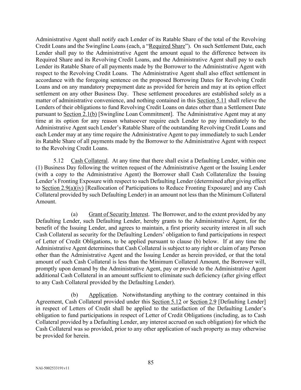 NAI-5002533191v11 85 Administrative Agent shall notify each Lender of its Ratable Share of the total of the Revolving Credit Loans and the Swingline Loans (each, a “Required Share”). On such Settlement Date, each Lender shall pay to the Administrative Agent the amount equal to the difference between its Required Share and its Revolving Credit Loans, and the Administrative Agent shall pay to each Lender its Ratable Share of all payments made by the Borrower to the Administrative Agent with respect to the Revolving Credit Loans. The Administrative Agent shall also effect settlement in accordance with the foregoing sentence on the proposed Borrowing Dates for Revolving Credit Loans and on any mandatory prepayment date as provided for herein and may at its option effect settlement on any other Business Day. These settlement procedures are established solely as a matter of administrative convenience, and nothing contained in this Section 5.11 shall relieve the Lenders of their obligations to fund Revolving Credit Loans on dates other than a Settlement Date pursuant to Section 2.1(b) [Swingline Loan Commitment]. The Administrative Agent may at any time at its option for any reason whatsoever require each Lender to pay immediately to the Administrative Agent such Lender’s Ratable Share of the outstanding Revolving Credit Loans and each Lender may at any time require the Administrative Agent to pay immediately to such Lender its Ratable Share of all payments made by the Borrower to the Administrative Agent with respect to the Revolving Credit Loans. 5.12 Cash Collateral. At any time that there shall exist a Defaulting Lender, within one (1) Business Day following the written request of the Administrative Agent or the Issuing Lender (with a copy to the Administrative Agent) the Borrower shall Cash Collateralize the Issuing Lender’s Fronting Exposure with respect to such Defaulting Lender (determined after giving effect to Section 2.9(a)(iv) [Reallocation of Participations to Reduce Fronting Exposure] and any Cash Collateral provided by such Defaulting Lender) in an amount not less than the Minimum Collateral Amount. (a) Grant of Security Interest. The Borrower, and to the extent provided by any Defaulting Lender, such Defaulting Lender, hereby grants to the Administrative Agent, for the benefit of the Issuing Lender, and agrees to maintain, a first priority security interest in all such Cash Collateral as security for the Defaulting Lenders’ obligation to fund participations in respect of Letter of Credit Obligations, to be applied pursuant to clause (b) below. If at any time the Administrative Agent determines that Cash Collateral is subject to any right or claim of any Person other than the Administrative Agent and the Issuing Lender as herein provided, or that the total amount of such Cash Collateral is less than the Minimum Collateral Amount, the Borrower will, promptly upon demand by the Administrative Agent, pay or provide to the Administrative Agent additional Cash Collateral in an amount sufficient to eliminate such deficiency (after giving effect to any Cash Collateral provided by the Defaulting Lender). (b) Application. Notwithstanding anything to the contrary contained in this Agreement, Cash Collateral provided under this Section 5.12 or Section 2.9 [Defaulting Lender] in respect of Letters of Credit shall be applied to the satisfaction of the Defaulting Lender’s obligation to fund participations in respect of Letter of Credit Obligations (including, as to Cash Collateral provided by a Defaulting Lender, any interest accrued on such obligation) for which the Cash Collateral was so provided, prior to any other application of such property as may otherwise be provided for herein.