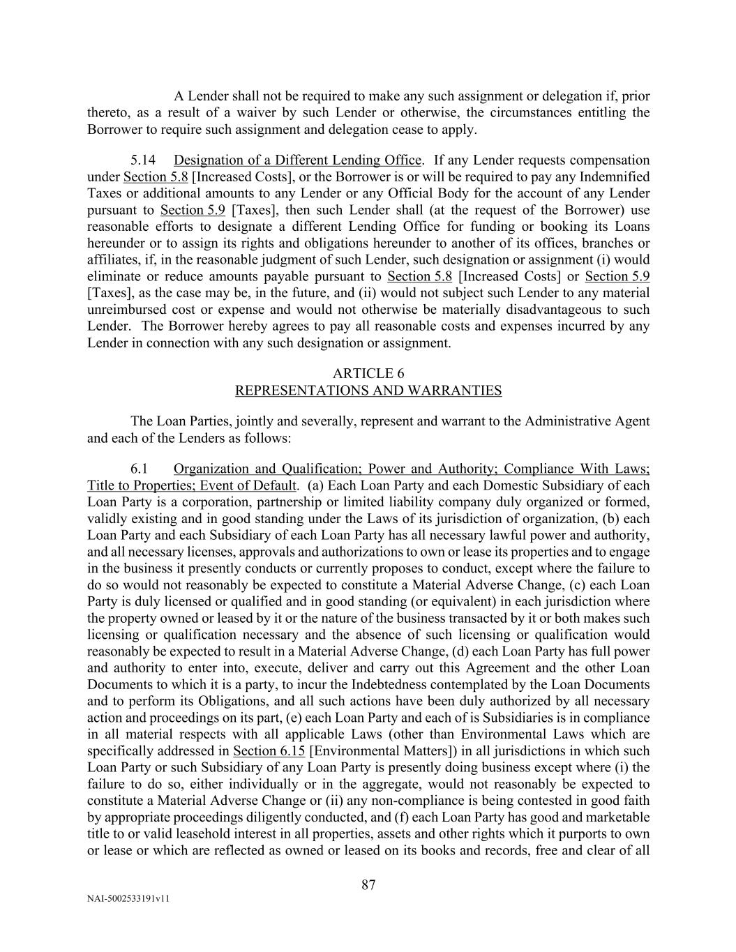 NAI-5002533191v11 87 A Lender shall not be required to make any such assignment or delegation if, prior thereto, as a result of a waiver by such Lender or otherwise, the circumstances entitling the Borrower to require such assignment and delegation cease to apply. 5.14 Designation of a Different Lending Office. If any Lender requests compensation under Section 5.8 [Increased Costs], or the Borrower is or will be required to pay any Indemnified Taxes or additional amounts to any Lender or any Official Body for the account of any Lender pursuant to Section 5.9 [Taxes], then such Lender shall (at the request of the Borrower) use reasonable efforts to designate a different Lending Office for funding or booking its Loans hereunder or to assign its rights and obligations hereunder to another of its offices, branches or affiliates, if, in the reasonable judgment of such Lender, such designation or assignment (i) would eliminate or reduce amounts payable pursuant to Section 5.8 [Increased Costs] or Section 5.9 [Taxes], as the case may be, in the future, and (ii) would not subject such Lender to any material unreimbursed cost or expense and would not otherwise be materially disadvantageous to such Lender. The Borrower hereby agrees to pay all reasonable costs and expenses incurred by any Lender in connection with any such designation or assignment. ARTICLE 6 REPRESENTATIONS AND WARRANTIES The Loan Parties, jointly and severally, represent and warrant to the Administrative Agent and each of the Lenders as follows: 6.1 Organization and Qualification; Power and Authority; Compliance With Laws; Title to Properties; Event of Default. (a) Each Loan Party and each Domestic Subsidiary of each Loan Party is a corporation, partnership or limited liability company duly organized or formed, validly existing and in good standing under the Laws of its jurisdiction of organization, (b) each Loan Party and each Subsidiary of each Loan Party has all necessary lawful power and authority, and all necessary licenses, approvals and authorizations to own or lease its properties and to engage in the business it presently conducts or currently proposes to conduct, except where the failure to do so would not reasonably be expected to constitute a Material Adverse Change, (c) each Loan Party is duly licensed or qualified and in good standing (or equivalent) in each jurisdiction where the property owned or leased by it or the nature of the business transacted by it or both makes such licensing or qualification necessary and the absence of such licensing or qualification would reasonably be expected to result in a Material Adverse Change, (d) each Loan Party has full power and authority to enter into, execute, deliver and carry out this Agreement and the other Loan Documents to which it is a party, to incur the Indebtedness contemplated by the Loan Documents and to perform its Obligations, and all such actions have been duly authorized by all necessary action and proceedings on its part, (e) each Loan Party and each of is Subsidiaries is in compliance in all material respects with all applicable Laws (other than Environmental Laws which are specifically addressed in Section 6.15 [Environmental Matters]) in all jurisdictions in which such Loan Party or such Subsidiary of any Loan Party is presently doing business except where (i) the failure to do so, either individually or in the aggregate, would not reasonably be expected to constitute a Material Adverse Change or (ii) any non-compliance is being contested in good faith by appropriate proceedings diligently conducted, and (f) each Loan Party has good and marketable title to or valid leasehold interest in all properties, assets and other rights which it purports to own or lease or which are reflected as owned or leased on its books and records, free and clear of all