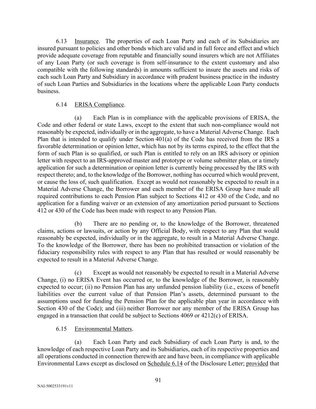 NAI-5002533191v11 91 6.13 Insurance. The properties of each Loan Party and each of its Subsidiaries are insured pursuant to policies and other bonds which are valid and in full force and effect and which provide adequate coverage from reputable and financially sound insurers which are not Affiliates of any Loan Party (or such coverage is from self-insurance to the extent customary and also compatible with the following standards) in amounts sufficient to insure the assets and risks of each such Loan Party and Subsidiary in accordance with prudent business practice in the industry of such Loan Parties and Subsidiaries in the locations where the applicable Loan Party conducts business. 6.14 ERISA Compliance. (a) Each Plan is in compliance with the applicable provisions of ERISA, the Code and other federal or state Laws, except to the extent that such non-compliance would not reasonably be expected, individually or in the aggregate, to have a Material Adverse Change. Each Plan that is intended to qualify under Section 401(a) of the Code has received from the IRS a favorable determination or opinion letter, which has not by its terms expired, to the effect that the form of such Plan is so qualified, or such Plan is entitled to rely on an IRS advisory or opinion letter with respect to an IRS-approved master and prototype or volume submitter plan, or a timely application for such a determination or opinion letter is currently being processed by the IRS with respect thereto; and, to the knowledge of the Borrower, nothing has occurred which would prevent, or cause the loss of, such qualification. Except as would not reasonably be expected to result in a Material Adverse Change, the Borrower and each member of the ERISA Group have made all required contributions to each Pension Plan subject to Sections 412 or 430 of the Code, and no application for a funding waiver or an extension of any amortization period pursuant to Sections 412 or 430 of the Code has been made with respect to any Pension Plan. (b) There are no pending or, to the knowledge of the Borrower, threatened claims, actions or lawsuits, or action by any Official Body, with respect to any Plan that would reasonably be expected, individually or in the aggregate, to result in a Material Adverse Change. To the knowledge of the Borrower, there has been no prohibited transaction or violation of the fiduciary responsibility rules with respect to any Plan that has resulted or would reasonably be expected to result in a Material Adverse Change. (c) Except as would not reasonably be expected to result in a Material Adverse Change, (i) no ERISA Event has occurred or, to the knowledge of the Borrower, is reasonably expected to occur; (ii) no Pension Plan has any unfunded pension liability (i.e., excess of benefit liabilities over the current value of that Pension Plan’s assets, determined pursuant to the assumptions used for funding the Pension Plan for the applicable plan year in accordance with Section 430 of the Code); and (iii) neither Borrower nor any member of the ERISA Group has engaged in a transaction that could be subject to Sections 4069 or 4212(c) of ERISA. 6.15 Environmental Matters. (a) Each Loan Party and each Subsidiary of each Loan Party is and, to the knowledge of each respective Loan Party and its Subsidiaries, each of its respective properties and all operations conducted in connection therewith are and have been, in compliance with applicable Environmental Laws except as disclosed on Schedule 6.14 of the Disclosure Letter; provided that