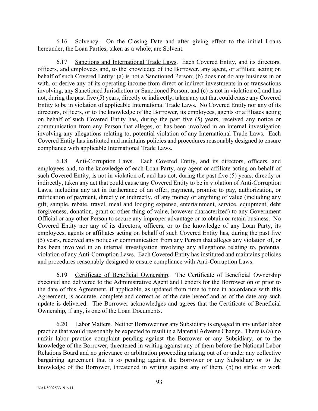 NAI-5002533191v11 93 6.16 Solvency. On the Closing Date and after giving effect to the initial Loans hereunder, the Loan Parties, taken as a whole, are Solvent. 6.17 Sanctions and International Trade Laws. Each Covered Entity, and its directors, officers, and employees and, to the knowledge of the Borrower, any agent, or affiliate acting on behalf of such Covered Entity: (a) is not a Sanctioned Person; (b) does not do any business in or with, or derive any of its operating income from direct or indirect investments in or transactions involving, any Sanctioned Jurisdiction or Sanctioned Person; and (c) is not in violation of, and has not, during the past five (5) years, directly or indirectly, taken any act that could cause any Covered Entity to be in violation of applicable International Trade Laws. No Covered Entity nor any of its directors, officers, or to the knowledge of the Borrower, its employees, agents or affiliates acting on behalf of such Covered Entity has, during the past five (5) years, received any notice or communication from any Person that alleges, or has been involved in an internal investigation involving any allegations relating to, potential violation of any International Trade Laws. Each Covered Entity has instituted and maintains policies and procedures reasonably designed to ensure compliance with applicable International Trade Laws. 6.18 Anti-Corruption Laws. Each Covered Entity, and its directors, officers, and employees and, to the knowledge of each Loan Party, any agent or affiliate acting on behalf of such Covered Entity, is not in violation of, and has not, during the past five (5) years, directly or indirectly, taken any act that could cause any Covered Entity to be in violation of Anti-Corruption Laws, including any act in furtherance of an offer, payment, promise to pay, authorization, or ratification of payment, directly or indirectly, of any money or anything of value (including any gift, sample, rebate, travel, meal and lodging expense, entertainment, service, equipment, debt forgiveness, donation, grant or other thing of value, however characterized) to any Government Official or any other Person to secure any improper advantage or to obtain or retain business. No Covered Entity nor any of its directors, officers, or to the knowledge of any Loan Party, its employees, agents or affiliates acting on behalf of such Covered Entity has, during the past five (5) years, received any notice or communication from any Person that alleges any violation of, or has been involved in an internal investigation involving any allegations relating to, potential violation of any Anti-Corruption Laws. Each Covered Entity has instituted and maintains policies and procedures reasonably designed to ensure compliance with Anti-Corruption Laws. 6.19 Certificate of Beneficial Ownership. The Certificate of Beneficial Ownership executed and delivered to the Administrative Agent and Lenders for the Borrower on or prior to the date of this Agreement, if applicable, as updated from time to time in accordance with this Agreement, is accurate, complete and correct as of the date hereof and as of the date any such update is delivered. The Borrower acknowledges and agrees that the Certificate of Beneficial Ownership, if any, is one of the Loan Documents. 6.20 Labor Matters. Neither Borrower nor any Subsidiary is engaged in any unfair labor practice that would reasonably be expected to result in a Material Adverse Change. There is (a) no unfair labor practice complaint pending against the Borrower or any Subsidiary, or to the knowledge of the Borrower, threatened in writing against any of them before the National Labor Relations Board and no grievance or arbitration proceeding arising out of or under any collective bargaining agreement that is so pending against the Borrower or any Subsidiary or to the knowledge of the Borrower, threatened in writing against any of them, (b) no strike or work