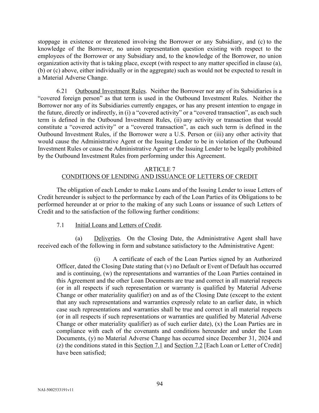 NAI-5002533191v11 94 stoppage in existence or threatened involving the Borrower or any Subsidiary, and (c) to the knowledge of the Borrower, no union representation question existing with respect to the employees of the Borrower or any Subsidiary and, to the knowledge of the Borrower, no union organization activity that is taking place, except (with respect to any matter specified in clause (a), (b) or (c) above, either individually or in the aggregate) such as would not be expected to result in a Material Adverse Change. 6.21 Outbound Investment Rules. Neither the Borrower nor any of its Subsidiaries is a “covered foreign person” as that term is used in the Outbound Investment Rules. Neither the Borrower nor any of its Subsidiaries currently engages, or has any present intention to engage in the future, directly or indirectly, in (i) a “covered activity” or a “covered transaction”, as each such term is defined in the Outbound Investment Rules, (ii) any activity or transaction that would constitute a “covered activity” or a “covered transaction”, as each such term is defined in the Outbound Investment Rules, if the Borrower were a U.S. Person or (iii) any other activity that would cause the Administrative Agent or the Issuing Lender to be in violation of the Outbound Investment Rules or cause the Administrative Agent or the Issuing Lender to be legally prohibited by the Outbound Investment Rules from performing under this Agreement. ARTICLE 7 CONDITIONS OF LENDING AND ISSUANCE OF LETTERS OF CREDIT The obligation of each Lender to make Loans and of the Issuing Lender to issue Letters of Credit hereunder is subject to the performance by each of the Loan Parties of its Obligations to be performed hereunder at or prior to the making of any such Loans or issuance of such Letters of Credit and to the satisfaction of the following further conditions: 7.1 Initial Loans and Letters of Credit. (a) Deliveries. On the Closing Date, the Administrative Agent shall have received each of the following in form and substance satisfactory to the Administrative Agent: (i) A certificate of each of the Loan Parties signed by an Authorized Officer, dated the Closing Date stating that (v) no Default or Event of Default has occurred and is continuing, (w) the representations and warranties of the Loan Parties contained in this Agreement and the other Loan Documents are true and correct in all material respects (or in all respects if such representation or warranty is qualified by Material Adverse Change or other materiality qualifier) on and as of the Closing Date (except to the extent that any such representations and warranties expressly relate to an earlier date, in which case such representations and warranties shall be true and correct in all material respects (or in all respects if such representations or warranties are qualified by Material Adverse Change or other materiality qualifier) as of such earlier date), (x) the Loan Parties are in compliance with each of the covenants and conditions hereunder and under the Loan Documents, (y) no Material Adverse Change has occurred since December 31, 2024 and (z) the conditions stated in this Section 7.1 and Section 7.2 [Each Loan or Letter of Credit] have been satisfied;