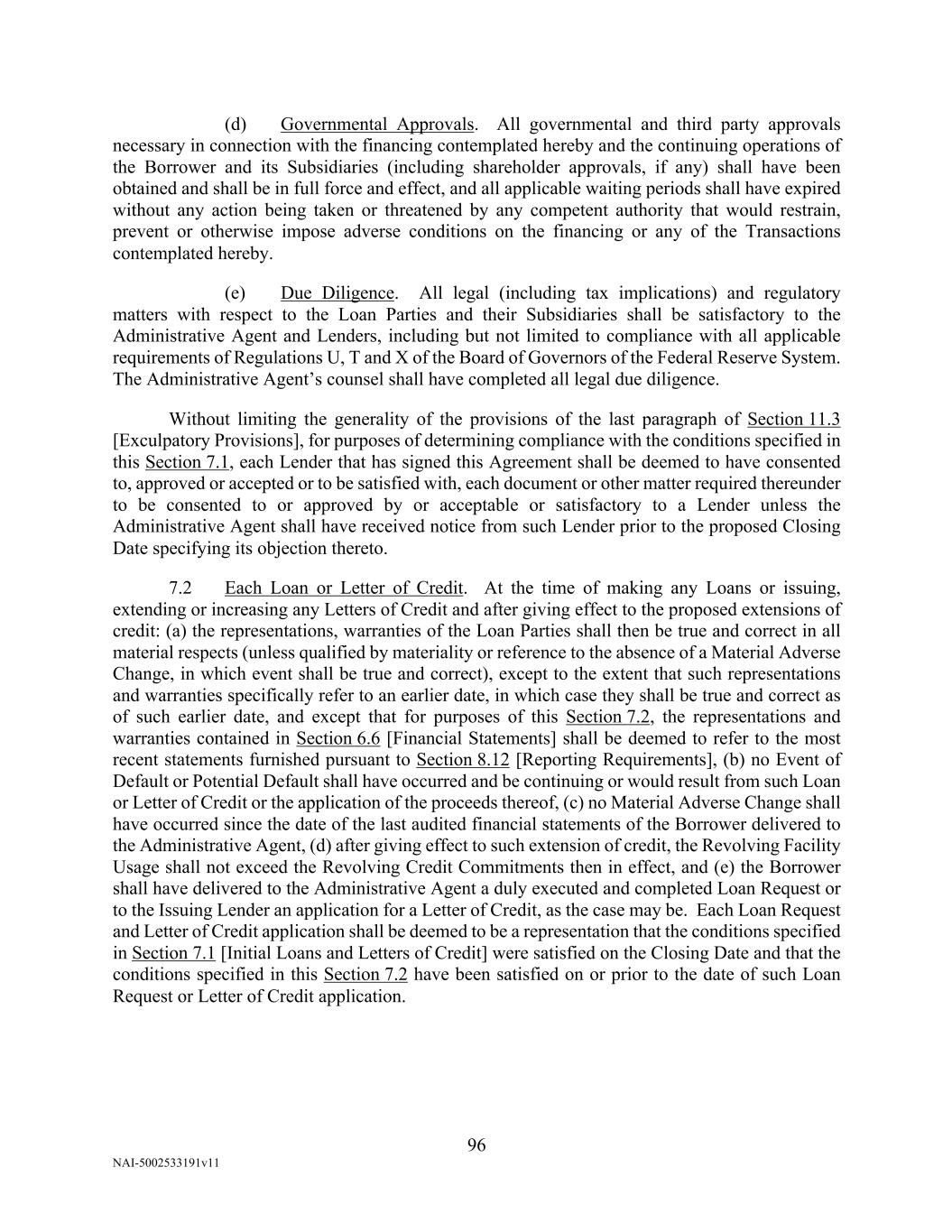NAI-5002533191v11 96 (d) Governmental Approvals. All governmental and third party approvals necessary in connection with the financing contemplated hereby and the continuing operations of the Borrower and its Subsidiaries (including shareholder approvals, if any) shall have been obtained and shall be in full force and effect, and all applicable waiting periods shall have expired without any action being taken or threatened by any competent authority that would restrain, prevent or otherwise impose adverse conditions on the financing or any of the Transactions contemplated hereby. (e) Due Diligence. All legal (including tax implications) and regulatory matters with respect to the Loan Parties and their Subsidiaries shall be satisfactory to the Administrative Agent and Lenders, including but not limited to compliance with all applicable requirements of Regulations U, T and X of the Board of Governors of the Federal Reserve System. The Administrative Agent’s counsel shall have completed all legal due diligence. Without limiting the generality of the provisions of the last paragraph of Section 11.3 [Exculpatory Provisions], for purposes of determining compliance with the conditions specified in this Section 7.1, each Lender that has signed this Agreement shall be deemed to have consented to, approved or accepted or to be satisfied with, each document or other matter required thereunder to be consented to or approved by or acceptable or satisfactory to a Lender unless the Administrative Agent shall have received notice from such Lender prior to the proposed Closing Date specifying its objection thereto. 7.2 Each Loan or Letter of Credit. At the time of making any Loans or issuing, extending or increasing any Letters of Credit and after giving effect to the proposed extensions of credit: (a) the representations, warranties of the Loan Parties shall then be true and correct in all material respects (unless qualified by materiality or reference to the absence of a Material Adverse Change, in which event shall be true and correct), except to the extent that such representations and warranties specifically refer to an earlier date, in which case they shall be true and correct as of such earlier date, and except that for purposes of this Section 7.2, the representations and warranties contained in Section 6.6 [Financial Statements] shall be deemed to refer to the most recent statements furnished pursuant to Section 8.12 [Reporting Requirements], (b) no Event of Default or Potential Default shall have occurred and be continuing or would result from such Loan or Letter of Credit or the application of the proceeds thereof, (c) no Material Adverse Change shall have occurred since the date of the last audited financial statements of the Borrower delivered to the Administrative Agent, (d) after giving effect to such extension of credit, the Revolving Facility Usage shall not exceed the Revolving Credit Commitments then in effect, and (e) the Borrower shall have delivered to the Administrative Agent a duly executed and completed Loan Request or to the Issuing Lender an application for a Letter of Credit, as the case may be. Each Loan Request and Letter of Credit application shall be deemed to be a representation that the conditions specified in Section 7.1 [Initial Loans and Letters of Credit] were satisfied on the Closing Date and that the conditions specified in this Section 7.2 have been satisfied on or prior to the date of such Loan Request or Letter of Credit application.