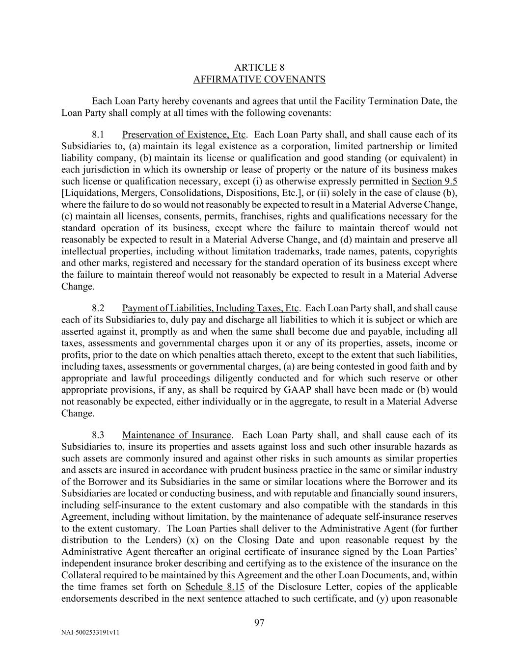 NAI-5002533191v11 97 ARTICLE 8 AFFIRMATIVE COVENANTS Each Loan Party hereby covenants and agrees that until the Facility Termination Date, the Loan Party shall comply at all times with the following covenants: 8.1 Preservation of Existence, Etc. Each Loan Party shall, and shall cause each of its Subsidiaries to, (a) maintain its legal existence as a corporation, limited partnership or limited liability company, (b) maintain its license or qualification and good standing (or equivalent) in each jurisdiction in which its ownership or lease of property or the nature of its business makes such license or qualification necessary, except (i) as otherwise expressly permitted in Section 9.5 [Liquidations, Mergers, Consolidations, Dispositions, Etc.], or (ii) solely in the case of clause (b), where the failure to do so would not reasonably be expected to result in a Material Adverse Change, (c) maintain all licenses, consents, permits, franchises, rights and qualifications necessary for the standard operation of its business, except where the failure to maintain thereof would not reasonably be expected to result in a Material Adverse Change, and (d) maintain and preserve all intellectual properties, including without limitation trademarks, trade names, patents, copyrights and other marks, registered and necessary for the standard operation of its business except where the failure to maintain thereof would not reasonably be expected to result in a Material Adverse Change. 8.2 Payment of Liabilities, Including Taxes, Etc. Each Loan Party shall, and shall cause each of its Subsidiaries to, duly pay and discharge all liabilities to which it is subject or which are asserted against it, promptly as and when the same shall become due and payable, including all taxes, assessments and governmental charges upon it or any of its properties, assets, income or profits, prior to the date on which penalties attach thereto, except to the extent that such liabilities, including taxes, assessments or governmental charges, (a) are being contested in good faith and by appropriate and lawful proceedings diligently conducted and for which such reserve or other appropriate provisions, if any, as shall be required by GAAP shall have been made or (b) would not reasonably be expected, either individually or in the aggregate, to result in a Material Adverse Change. 8.3 Maintenance of Insurance. Each Loan Party shall, and shall cause each of its Subsidiaries to, insure its properties and assets against loss and such other insurable hazards as such assets are commonly insured and against other risks in such amounts as similar properties and assets are insured in accordance with prudent business practice in the same or similar industry of the Borrower and its Subsidiaries in the same or similar locations where the Borrower and its Subsidiaries are located or conducting business, and with reputable and financially sound insurers, including self-insurance to the extent customary and also compatible with the standards in this Agreement, including without limitation, by the maintenance of adequate self-insurance reserves to the extent customary. The Loan Parties shall deliver to the Administrative Agent (for further distribution to the Lenders) (x) on the Closing Date and upon reasonable request by the Administrative Agent thereafter an original certificate of insurance signed by the Loan Parties’ independent insurance broker describing and certifying as to the existence of the insurance on the Collateral required to be maintained by this Agreement and the other Loan Documents, and, within the time frames set forth on Schedule 8.15 of the Disclosure Letter, copies of the applicable endorsements described in the next sentence attached to such certificate, and (y) upon reasonable
