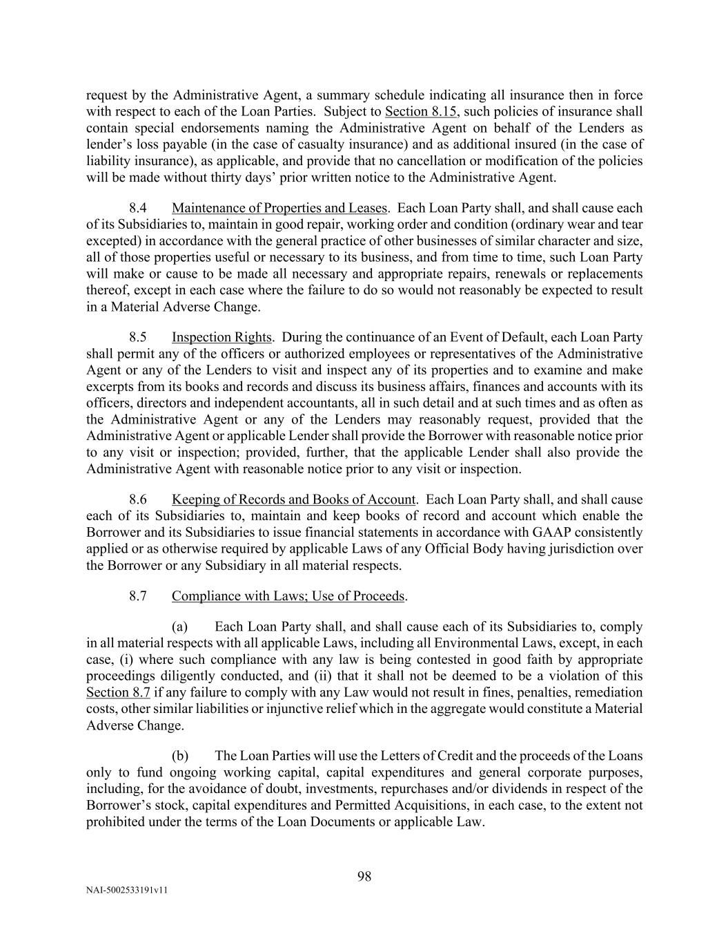 NAI-5002533191v11 98 request by the Administrative Agent, a summary schedule indicating all insurance then in force with respect to each of the Loan Parties. Subject to Section 8.15, such policies of insurance shall contain special endorsements naming the Administrative Agent on behalf of the Lenders as lender’s loss payable (in the case of casualty insurance) and as additional insured (in the case of liability insurance), as applicable, and provide that no cancellation or modification of the policies will be made without thirty days’ prior written notice to the Administrative Agent. 8.4 Maintenance of Properties and Leases. Each Loan Party shall, and shall cause each of its Subsidiaries to, maintain in good repair, working order and condition (ordinary wear and tear excepted) in accordance with the general practice of other businesses of similar character and size, all of those properties useful or necessary to its business, and from time to time, such Loan Party will make or cause to be made all necessary and appropriate repairs, renewals or replacements thereof, except in each case where the failure to do so would not reasonably be expected to result in a Material Adverse Change. 8.5 Inspection Rights. During the continuance of an Event of Default, each Loan Party shall permit any of the officers or authorized employees or representatives of the Administrative Agent or any of the Lenders to visit and inspect any of its properties and to examine and make excerpts from its books and records and discuss its business affairs, finances and accounts with its officers, directors and independent accountants, all in such detail and at such times and as often as the Administrative Agent or any of the Lenders may reasonably request, provided that the Administrative Agent or applicable Lender shall provide the Borrower with reasonable notice prior to any visit or inspection; provided, further, that the applicable Lender shall also provide the Administrative Agent with reasonable notice prior to any visit or inspection. 8.6 Keeping of Records and Books of Account. Each Loan Party shall, and shall cause each of its Subsidiaries to, maintain and keep books of record and account which enable the Borrower and its Subsidiaries to issue financial statements in accordance with GAAP consistently applied or as otherwise required by applicable Laws of any Official Body having jurisdiction over the Borrower or any Subsidiary in all material respects. 8.7 Compliance with Laws; Use of Proceeds. (a) Each Loan Party shall, and shall cause each of its Subsidiaries to, comply in all material respects with all applicable Laws, including all Environmental Laws, except, in each case, (i) where such compliance with any law is being contested in good faith by appropriate proceedings diligently conducted, and (ii) that it shall not be deemed to be a violation of this Section 8.7 if any failure to comply with any Law would not result in fines, penalties, remediation costs, other similar liabilities or injunctive relief which in the aggregate would constitute a Material Adverse Change. (b) The Loan Parties will use the Letters of Credit and the proceeds of the Loans only to fund ongoing working capital, capital expenditures and general corporate purposes, including, for the avoidance of doubt, investments, repurchases and/or dividends in respect of the Borrower’s stock, capital expenditures and Permitted Acquisitions, in each case, to the extent not prohibited under the terms of the Loan Documents or applicable Law.