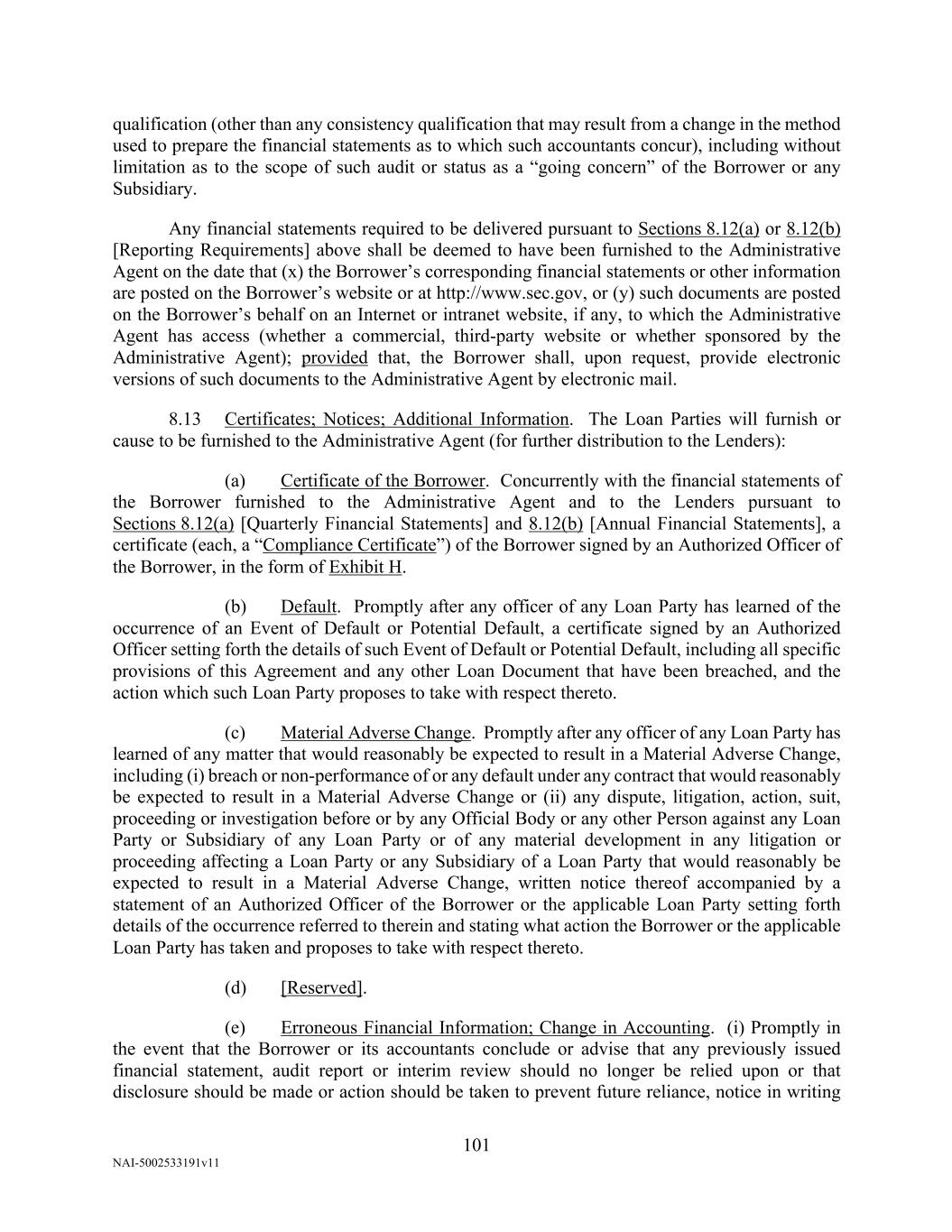 NAI-5002533191v11 101 qualification (other than any consistency qualification that may result from a change in the method used to prepare the financial statements as to which such accountants concur), including without limitation as to the scope of such audit or status as a “going concern” of the Borrower or any Subsidiary. Any financial statements required to be delivered pursuant to Sections 8.12(a) or 8.12(b) [Reporting Requirements] above shall be deemed to have been furnished to the Administrative Agent on the date that (x) the Borrower’s corresponding financial statements or other information are posted on the Borrower’s website or at http://www.sec.gov, or (y) such documents are posted on the Borrower’s behalf on an Internet or intranet website, if any, to which the Administrative Agent has access (whether a commercial, third-party website or whether sponsored by the Administrative Agent); provided that, the Borrower shall, upon request, provide electronic versions of such documents to the Administrative Agent by electronic mail. 8.13 Certificates; Notices; Additional Information. The Loan Parties will furnish or cause to be furnished to the Administrative Agent (for further distribution to the Lenders): (a) Certificate of the Borrower. Concurrently with the financial statements of the Borrower furnished to the Administrative Agent and to the Lenders pursuant to Sections 8.12(a) [Quarterly Financial Statements] and 8.12(b) [Annual Financial Statements], a certificate (each, a “Compliance Certificate”) of the Borrower signed by an Authorized Officer of the Borrower, in the form of Exhibit H. (b) Default. Promptly after any officer of any Loan Party has learned of the occurrence of an Event of Default or Potential Default, a certificate signed by an Authorized Officer setting forth the details of such Event of Default or Potential Default, including all specific provisions of this Agreement and any other Loan Document that have been breached, and the action which such Loan Party proposes to take with respect thereto. (c) Material Adverse Change. Promptly after any officer of any Loan Party has learned of any matter that would reasonably be expected to result in a Material Adverse Change, including (i) breach or non-performance of or any default under any contract that would reasonably be expected to result in a Material Adverse Change or (ii) any dispute, litigation, action, suit, proceeding or investigation before or by any Official Body or any other Person against any Loan Party or Subsidiary of any Loan Party or of any material development in any litigation or proceeding affecting a Loan Party or any Subsidiary of a Loan Party that would reasonably be expected to result in a Material Adverse Change, written notice thereof accompanied by a statement of an Authorized Officer of the Borrower or the applicable Loan Party setting forth details of the occurrence referred to therein and stating what action the Borrower or the applicable Loan Party has taken and proposes to take with respect thereto. (d) [Reserved]. (e) Erroneous Financial Information; Change in Accounting. (i) Promptly in the event that the Borrower or its accountants conclude or advise that any previously issued financial statement, audit report or interim review should no longer be relied upon or that disclosure should be made or action should be taken to prevent future reliance, notice in writing