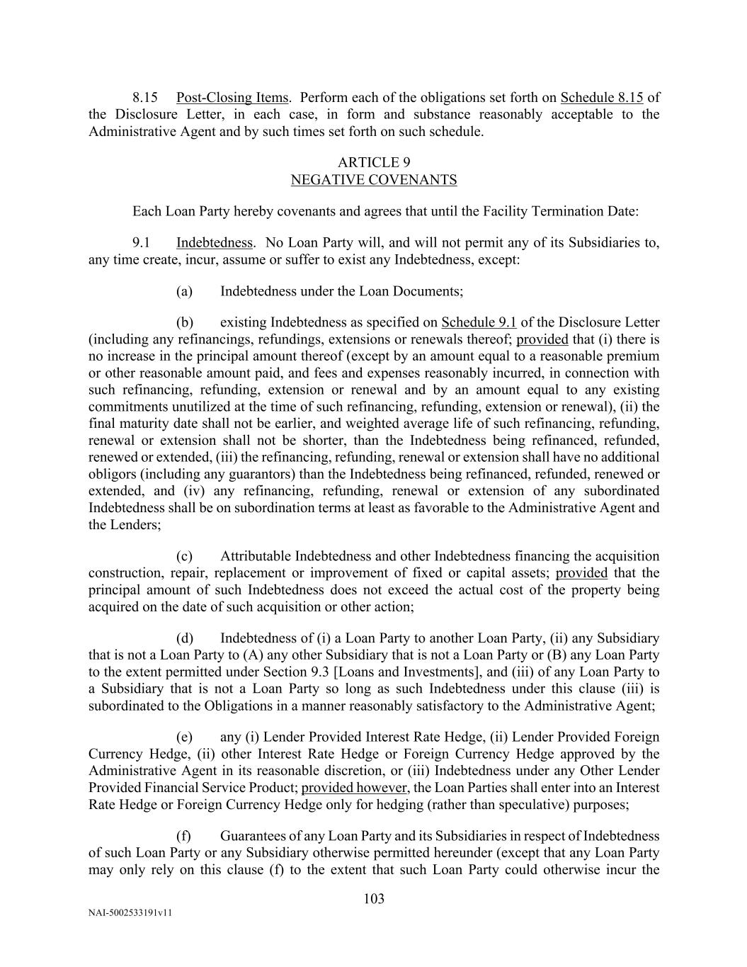 NAI-5002533191v11 103 8.15 Post-Closing Items. Perform each of the obligations set forth on Schedule 8.15 of the Disclosure Letter, in each case, in form and substance reasonably acceptable to the Administrative Agent and by such times set forth on such schedule. ARTICLE 9 NEGATIVE COVENANTS Each Loan Party hereby covenants and agrees that until the Facility Termination Date: 9.1 Indebtedness. No Loan Party will, and will not permit any of its Subsidiaries to, any time create, incur, assume or suffer to exist any Indebtedness, except: (a) Indebtedness under the Loan Documents; (b) existing Indebtedness as specified on Schedule 9.1 of the Disclosure Letter (including any refinancings, refundings, extensions or renewals thereof; provided that (i) there is no increase in the principal amount thereof (except by an amount equal to a reasonable premium or other reasonable amount paid, and fees and expenses reasonably incurred, in connection with such refinancing, refunding, extension or renewal and by an amount equal to any existing commitments unutilized at the time of such refinancing, refunding, extension or renewal), (ii) the final maturity date shall not be earlier, and weighted average life of such refinancing, refunding, renewal or extension shall not be shorter, than the Indebtedness being refinanced, refunded, renewed or extended, (iii) the refinancing, refunding, renewal or extension shall have no additional obligors (including any guarantors) than the Indebtedness being refinanced, refunded, renewed or extended, and (iv) any refinancing, refunding, renewal or extension of any subordinated Indebtedness shall be on subordination terms at least as favorable to the Administrative Agent and the Lenders; (c) Attributable Indebtedness and other Indebtedness financing the acquisition construction, repair, replacement or improvement of fixed or capital assets; provided that the principal amount of such Indebtedness does not exceed the actual cost of the property being acquired on the date of such acquisition or other action; (d) Indebtedness of (i) a Loan Party to another Loan Party, (ii) any Subsidiary that is not a Loan Party to (A) any other Subsidiary that is not a Loan Party or (B) any Loan Party to the extent permitted under Section 9.3 [Loans and Investments], and (iii) of any Loan Party to a Subsidiary that is not a Loan Party so long as such Indebtedness under this clause (iii) is subordinated to the Obligations in a manner reasonably satisfactory to the Administrative Agent; (e) any (i) Lender Provided Interest Rate Hedge, (ii) Lender Provided Foreign Currency Hedge, (ii) other Interest Rate Hedge or Foreign Currency Hedge approved by the Administrative Agent in its reasonable discretion, or (iii) Indebtedness under any Other Lender Provided Financial Service Product; provided however, the Loan Parties shall enter into an Interest Rate Hedge or Foreign Currency Hedge only for hedging (rather than speculative) purposes; (f) Guarantees of any Loan Party and its Subsidiaries in respect of Indebtedness of such Loan Party or any Subsidiary otherwise permitted hereunder (except that any Loan Party may only rely on this clause (f) to the extent that such Loan Party could otherwise incur the