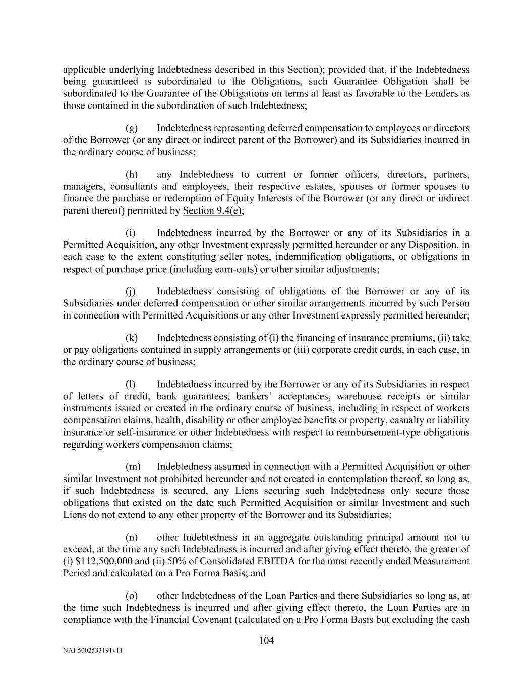 NAI-5002533191v11 104 applicable underlying Indebtedness described in this Section); provided that, if the Indebtedness being guaranteed is subordinated to the Obligations, such Guarantee Obligation shall be subordinated to the Guarantee of the Obligations on terms at least as favorable to the Lenders as those contained in the subordination of such Indebtedness; (g) Indebtedness representing deferred compensation to employees or directors of the Borrower (or any direct or indirect parent of the Borrower) and its Subsidiaries incurred in the ordinary course of business; (h) any Indebtedness to current or former officers, directors, partners, managers, consultants and employees, their respective estates, spouses or former spouses to finance the purchase or redemption of Equity Interests of the Borrower (or any direct or indirect parent thereof) permitted by Section 9.4(e); (i) Indebtedness incurred by the Borrower or any of its Subsidiaries in a Permitted Acquisition, any other Investment expressly permitted hereunder or any Disposition, in each case to the extent constituting seller notes, indemnification obligations, or obligations in respect of purchase price (including earn-outs) or other similar adjustments; (j) Indebtedness consisting of obligations of the Borrower or any of its Subsidiaries under deferred compensation or other similar arrangements incurred by such Person in connection with Permitted Acquisitions or any other Investment expressly permitted hereunder; (k) Indebtedness consisting of (i) the financing of insurance premiums, (ii) take or pay obligations contained in supply arrangements or (iii) corporate credit cards, in each case, in the ordinary course of business; (l) Indebtedness incurred by the Borrower or any of its Subsidiaries in respect of letters of credit, bank guarantees, bankers’ acceptances, warehouse receipts or similar instruments issued or created in the ordinary course of business, including in respect of workers compensation claims, health, disability or other employee benefits or property, casualty or liability insurance or self-insurance or other Indebtedness with respect to reimbursement-type obligations regarding workers compensation claims; (m) Indebtedness assumed in connection with a Permitted Acquisition or other similar Investment not prohibited hereunder and not created in contemplation thereof, so long as, if such Indebtedness is secured, any Liens securing such Indebtedness only secure those obligations that existed on the date such Permitted Acquisition or similar Investment and such Liens do not extend to any other property of the Borrower and its Subsidiaries; (n) other Indebtedness in an aggregate outstanding principal amount not to exceed, at the time any such Indebtedness is incurred and after giving effect thereto, the greater of (i) $112,500,000 and (ii) 50% of Consolidated EBITDA for the most recently ended Measurement Period and calculated on a Pro Forma Basis; and (o) other Indebtedness of the Loan Parties and there Subsidiaries so long as, at the time such Indebtedness is incurred and after giving effect thereto, the Loan Parties are in compliance with the Financial Covenant (calculated on a Pro Forma Basis but excluding the cash